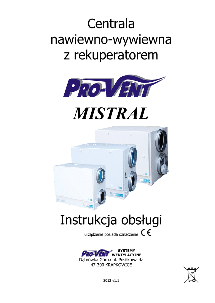 Centrala nawiewno-wywiewna z rekuperatorem MISTRAL Instrukcja obsługi urządzenie posiada oznaczenie SYSTEMY WENTYLACYJNE Dąbrówka Górna ul. Posiłkowa 4a 47-300 KRAPKOWICE 2012 v1.1 Instrukcja obsługi centrali MISTRAL Spis treści: 1. BUDOWA CENTRALI 3 2. ZASTOSOWANIE 3 3. MONTAŻ CENTRALI 5 4. ZASADY BEZPIECZEŃSTWA 5 5. STEROWANIE PRACĄ CENTRALI 7 5.1. REGULATORY WYDAJNOŚCI WENTYLACJI (MANIPULATORY) REGULATOR RM1 REGULATOR RM4 REGULATOR RC2 REGULATOR RC3 REGULATOR RC4, RC5 8 8 9 11 18 26 5.2. ROZSZRONIENIE WYMIENNIKA CIEPŁA 32 5.3. BYPASS, WKŁAD LETNI (DOTYCZY WYBRANYCH CENTRAL) 34 6. PRACA CENTRALI - WENTYLACJA POMIESZCZEŃ Praca centrali w sezonie letnim Praca centrali w sezonie grzewczym Użytkowanie gruntowego wymiennika ciepła (GWC) 34 36 36 37 7. OKRESOWA OBSŁUGA CENTRALI 38 8. ROZWIĄZYWANIE PROBLEMÓW 41 9. PRAWIDŁOWE USUWANIE PRODUKTU (ZUŻYTY SPRZĘT ELEKTRYCZNY I ELEKTRONICZNY). 43 1 Instrukcja obsługi centrali MISTRAL Szanowny kliencie! Dziękujemy za wybór centrali MISTRAL. Firma Pro–Vent dołożyła wszelkich starań, aby oddać w Państwa ręce towar dobrej jakości o wysokiej sprawności odzysku ciepła. Jesteśmy przekonani, że użytkowanie naszej centrali zapewni Państwu bardziej komfortowe warunki do pracy i odpoczynku. Zastosowane materiały oraz technologia wytworzenia gwarantują długą i bezawaryjną eksploatacje naszego produktu. Aby uniknąć jakichkolwiek problemów z użytkowaniem i eksploatacją prosimy o dokładne zapoznanie się z niniejszą Instrukcją Obsługi. Ponieważ centrale Wentylacyjne MISTRAL są stale rozwijane może się zdarzyć, iż centrala będzie nieznacznie odbiegać od opisu przedstawionego w niniejszej instrukcji, w takim przypadku istnieje możliwość otrzymania od firmy PRO-VENT najnowszej wersji Instrukcji Obsługi. W przypadku jakichkolwiek pytań, wątpliwości, sugestii lub niezrozumienia niniejszej Instrukcji prosimy o kontakt na adres e-mail: [email protected]. 2 Instrukcja obsługi centrali MISTRAL 1. BUDOWA CENTRALI 9 1 10 5 5 12 8 7 6 1 5 8 6 4 7 12 3 5 2 9 13 1. 2. 3. 4. 5. 6. 7. 8. 9. 10. 11. 12. 13. Obudowa centrali. 11 Gniazdo zasilające do podłączenia przewodu zasilającego 230 V / 50 Hz. Gniazdo RJ-45 do podłączenia zewnętrznego regulatora wydajności wentylacji. Złącza STEROWANIE do podłączenia czujników, sterowania urządzeń zewnętrznych itp. Króciec centrali do podłączenia przewodów wentylacyjnych. Puszka montażu automatyki centrali wentylacyjnej (w centrali PRO automatyka zamontowana jest na wymiennikiem). Wentylator nawiewny. Wentylator wywiewny. Filtr powietrza zewnętrznego (nawiewanego). Filtr powietrza wewnętrznego (wywiewanego). Uszczelka. Wymiennik ciepła (krzyżowy, przeciwprądowy). Nagrzewnica wstępna (pierwotna). 10 Zdjęcie przedstawia centralę wentylacyjną MISTRAL 800 oraz PRO 400. Rysunek jest jedynie rysunkiem poglądowym, gdyż poszczególne wersje central różnią się miedzy sobą wyglądem, kształtem i ilością wymienników ciepła, ułożeniem króćców przyłączeniowych, rozmieszczeniem i ilością włączników oraz wyposażeniem dodatkowym. W zależności od strony wykonania (lewa, prawa) króćce czerpni, wyrzutni oraz filtr powietrza świeżego znajduje się z lewej lub prawej strony centrali. Wszystkie króćce oraz przyłącza oznaczone są opisowo na centrali wentylacyjnej MISTRAL. 2. ZASTOSOWANIE Wysokoefektywne, nowoczesne centrale z odzyskiem ciepła serii MISTRAL produkcji firmy Pro-Vent mają zastosowanie do wentylacji: 3 Instrukcja obsługi centrali MISTRAL domów jednorodzinnych, biur, salonów fryzjerskich, kosmetycznych, sklepów, pawilonów handlowych, pubów, kawiarni, restauracji, warsztatów, małych hal produkcyjnych. Sposób montażu centrali wentylacyjnej dokładnie opisano w dokumentacji techniczno-ruchowej DTR dostarczonej wraz z centralą wentylacyjną. Central należy używać w warunkach normalnej eksploatacji obiektu. UWAGA! Nie wolno używać central do usuwania zanieczyszczeń technologicznych, które tworzą się podczas: cyklinowania, szlifowania powierzchni gipsowych, malowania i innych prac, podczas których uwalniany jest kurz, bądź agresywne, wybuchowe związki chemicznie. W przypadku remontów i innych silnych zabrudzeń należy koniecznie wyłączyć wtyczkę zasilania centrali z gniazda i zabezpieczyć przed możliwością włączenia centrali przez osoby postronne. Należy również szczelnie zatkać (zakręcić) anemostaty w celu zabezpieczenia kanałów wentylacyjnych przed zabrudzeniem. Dopuszczalna temperatura powietrza doprowadzonego do króćca czerpnego centrali wentylacyjnej (wlot powietrza świeżego) zależy od rodzaju centrali i zastosowanego układu rozmrożeniowego. Standardowy układ rozmrożeniowy (wyłączenie nawiewu) powinien zapewnić prawidłową pracę centrali przy temperaturach zewnętrznych nie niższych niż -12OC w przypadku central jednorekuperatorowych, -10OC w przypadku central DUO i -5OC dla central PRO. Centrale GEO dedykowane są do współpracy z wymiennikiem gruntowym GWC, gdzie temperatura ta nie powinna być niższa niż -2OC. W przypadku użytkowania centrali przy temperaturach zewnętrznych długotrwale utrzymujących się poniżej dopuszczalnych (4, 5 strefa klimatyczna) zaleca się wstępnie podgrzewać powietrze doprowadzane do centrali np. poprzez GWC (gruntowy wymiennik ciepła) lub zastosować skuteczniejszy układ rozmrożeniowy. Temperatura powietrza usuwanego doprowadzonego do króćca wywiewnego centrali wentylacyjnej nie powinna być niższa niż +16OC. W przypadku temperatury niższej może nieskutecznie działać układ rozmrożeniowy centrali (szczególnie poprzez wyłączenie wentylatora nawiewu) powodując długotrwałe rozmrażanie wymiennika ciepła, więcej informacji patrz punkt 5.2 Rozszronienie wymiennika ciepła. 4 Instrukcja obsługi centrali MISTRAL Maksymalna temperatura powietrza przepływającego przez centralę wentylacyjną to +45OC, nato
