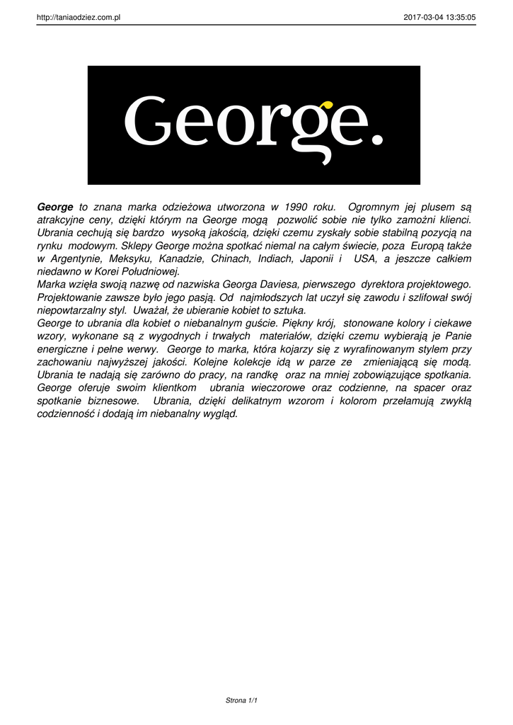 http://taniaodziez.com.pl 2017-03-04 13:35:05 George to znana marka odzieżowa utworzona w 1990 roku. Ogromnym jej plusem są atrakcyjne ceny, dzięki którym na George mogą pozwolić sobie nie tylko zamożni klienci. Ubrania cechują się bardzo wysoką jakością, dzięki czemu zyskały sobie stabilną pozycją na rynku modowym. Sklepy George można spotkać niemal na całym świecie, poza Europą także w Argentynie, Meksyku, Kanadzie, Chinach, Indiach, Japonii i USA, a jeszcze całkiem niedawno w Korei Południowej. Marka wzięła swoją nazwę od nazwiska Georga Daviesa, pierwszego dyrektora projektowego. Projektowanie zawsze było jego pasją. Od najmłodszych lat uczył się zawodu i szlifował swój niepowtarzalny styl. Uważał, że ubieranie kobiet to sztuka. George to ubrania dla kobiet o niebanalnym guście. Piękny krój, stonowane kolory i ciekawe wzory, wykonane są z wygodnych i trwałych materiałów, dzięki czemu wybierają je Panie energiczne i pełne werwy. George to marka, która kojarzy się z wyrafinowanym stylem przy zachowaniu najwyższej jakości. Kolejne kolekcje idą w parze ze zmieniającą się modą. Ubrania te nadają się zarówno do pracy, na randkę oraz na mniej zobowiązujące spotkania. George oferuje swoim klientkom ubrania wieczorowe oraz codzienne, na spacer oraz spotkanie biznesowe. Ubrania, dzięki delikatnym wzorom i kolorom przełamują zwykłą codzienność i dodają im niebanalny wygląd. Strona 1/1