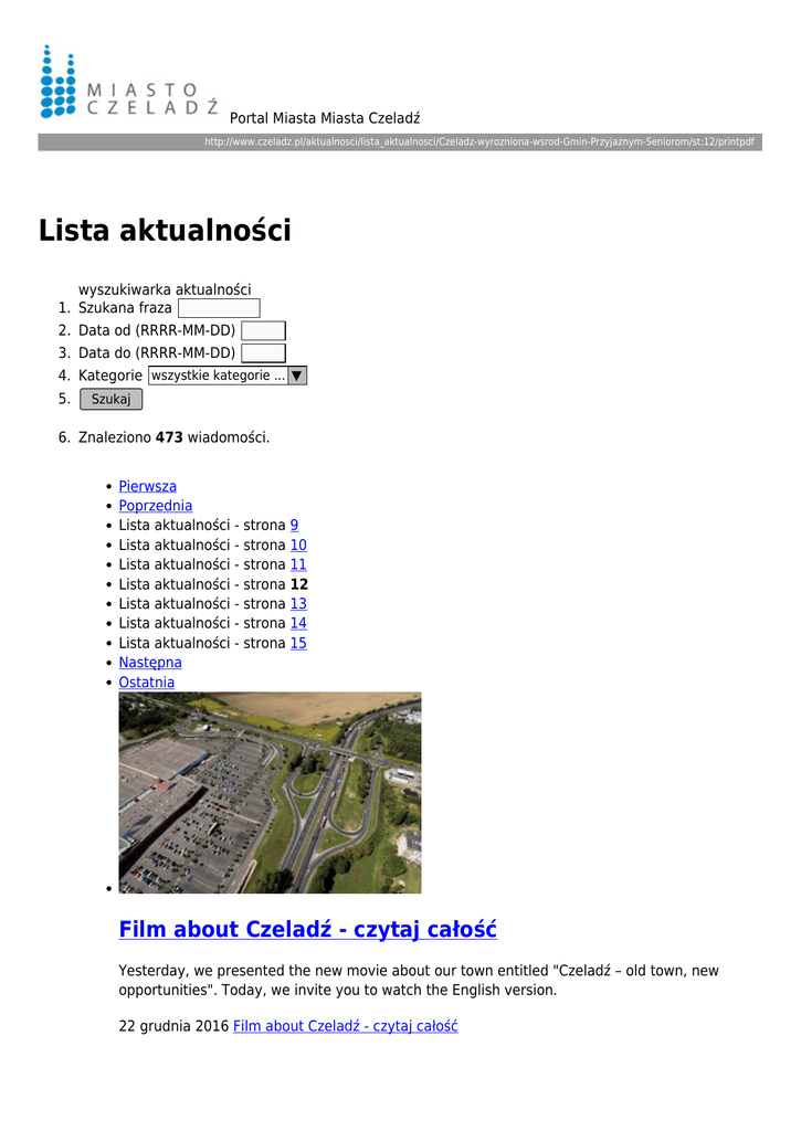 Portal Miasta Miasta Czeladź http://www.czeladz.pl/aktualnosci/lista_aktualnosci/Czeladz-wyrozniona-wsrod-Gmin-Przyjaznym-Seniorom/st:12/printpdf Lista aktualności wyszukiwarka aktualności 1. Szukana fraza 2. Data od (RRRR-MM-DD) 3. Data do (RRRR-MM-DD) 4. Kategorie wszystkie kategorie ... ▼ 5. Szukaj 6. Znaleziono 473 wiadomości. Pierwsza Poprzednia Lista aktualności - strona 9 Lista aktualności - strona 10 Lista aktualności - strona 11 Lista aktualności - strona 12 Lista aktualności - strona 13 Lista aktualności - strona 14 Lista aktualności - strona 15 Następna Ostatnia Film about Czeladź - czytaj całość Yesterday, we presented the new movie about our town entitled "Czeladź – old town, new opportunities". Today, we invite you to watch the English version. 22 grudnia 2016 Film about Czeladź - czytaj całość Od stycznia więcej miejsc w Żłobku Miejskim - czytaj całość Wczoraj, 19 grudnia 2016 roku, odbyło się z udziałem władz miasta: burmistrza Zbigniewa Szaleńca, zastępcy burmistrza ds. komunalnych Elżbiety Dmitruk i zastępcy burmistrza ds. społecznych Beaty Zawiły, uroczyste otwarcie nowo wyremontowanej części Żłobka Miejskiej przy ul. 35-lecia PRL. 21 grudnia 2016 Od stycznia więcej miejsc w Żłobku Miejskim - czytaj całość Kolejne sukcesy czeladzkich szkół - czytaj całość W ramach ogłoszonego przez Wojewódzki Fundusz Ochrony Środowiska i Gospodarki Wodnej w Katowicach konkursu pn. „Zielona pracownia” Miejski Zespół Szkół w Czeladzi zdobył nagrodę finansową na realizację nowoczesnej ekopracowni. 21 grudnia 2016 Kolejne sukcesy czeladzkich szkół - czytaj całość Film o Czeladzi - czytaj całość Dziś, 21 grudnia 2016 roku ukaże się najnowsze, grudniowe wydanie „Echa Czeladzi”, w którym znaleźć można świąteczny upominek. 21 grudnia 2016 Film o Czeladzi - czytaj całość Budżet na 2017 przyjęty - czytaj całość Podczas wczorajszej XXXII sesji Rady Miejskiej radni prawie jednogłośnie przyjęli uchwałę dotyczącą Budżetu Miasta na 2017 rok. „Za” uchwałą głosowało 18 radnych, jeden głos przeciwny jej przyjęcia. 20 grudnia 2016 Budżet na 2017 przyjęty - czytaj całość Święta, święta i… przed świętami - czytaj całość „Święta, święta i… przed świętami” – impreza pod takim hasłem odbyła się w niedzielę, 18 grudnia na Placu Viannaya na Piaskach. 18 grudnia 2016 Święta, święta i… przed świętami - czytaj całość Zakończenie Roku Francuskiego - czytaj całość W sobotę, 17 grudnia znakomitym kocertem piosenek Edith Piaf w wykonaniu aktorki Tateru Zagłębia, Ewy Kopczyńskiej zakończył się Rok Francuski w Czeladzi. 18 grudnia 2016 Zakończenie Roku Francuskiego - czytaj całość Jarmark Świąteczny na rynku - czytaj całość Zorganizowany w ostatni przedświąteczny weekend, bożonarodzeniowy jarmark cieszył się wśród czeladzian ogromnym powodzeniem. 18 grudnia 2016 Jarmark Świąteczny na rynku - czytaj całość Ornitologiczne Mistrzostwa Polski - czytaj całość Ornitologiczne Mistrzostwa Polski już kolejny rok z rzędu odbywały się w hali czeladzkiego Miejskiego Ośrodka Sportu i Rekreacji. Patronat nad mistrzostwami objął burmistrz Czeladzi Zbigniew Szaleniec. 18 grudnia 2016 Ornitologiczne Mistrzostwa Polski - czytaj całość Nowe wzory ofert na realizację zadań publicznych - szkolenie - czytaj całość Szkolenie odbędzie się 19 grudnia br. w Miejskim Ośrodku Sportu i Rekreacji w Czeladzi o godz. 15.00. 12 grudnia 2016 Nowe wzory ofert na realizację zadań publicznych - szkolenie - czytaj całość Pierwsza Poprzednia Lista aktualności - strona 9 Lista aktualności - strona 10 Lista aktualności - strona 11 Lista aktualności - strona 12 Lista aktualności - strona 13 Lista aktualności - strona 14 Lista aktualności - strona 15 Następna Ostatnia