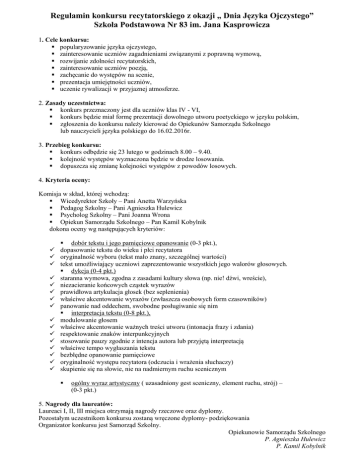 Regulamin konkursu recytatorskiego z okazji „ Dnia Języka Ojczystego” Szkoła Podstawowa Nr 83 im. Jana Kasprowicza 1. Cele konkursu: popularyzowanie języka ojczystego, zainteresowanie uczniów zagadnieniami związanymi z poprawną wymową, rozwijanie zdolności recytatorskich, zainteresowanie uczniów poezją, zachęcanie do występów na scenie, prezentacja umiejętności uczniów, uczenie rywalizacji w przyjaznej atmosferze. 2. Zasady uczestnictwa: konkurs przeznaczony jest dla uczniów klas IV - VI, konkurs będzie miał formę prezentacji dowolnego utworu poetyckiego w języku polskim, zgłoszenia do konkursu należy kierować do Opiekunów Samorządu Szkolnego lub nauczycieli języka polskiego do 16.02.2016r. 3. Przebieg konkursu: konkurs odbędzie się 23 lutego w godzinach 8.00 – 9.40. kolejność występów wyznaczona będzie w drodze losowania. dopuszcza się zmianę kolejności występów z powodów losowych. 4. Kryteria oceny: Komisja w skład, której wchodzą: Wicedyrektor Szkoły – Pani Anetta Warzyńska Pedagog Szkolny – Pani Agnieszka Hulewicz Psycholog Szkolny – Pani Joanna Wrona Opiekun Samorządu Szkolnego – Pan Kamil Kobylnik dokona oceny wg następujących kryteriów: dobór tekstu i jego pamięciowe opanowanie (0-3 pkt.), dopasowanie tekstu do wieku i płci recytatora oryginalność wyboru (tekst mało znany, szczególnej wartości) tekst umożliwiający uczniowi zaprezentowanie wszystkich jego walorów głosowych. dykcja (0-4 pkt.) staranna wymowa, zgodna z zasadami kultury słowa (np. nie! dźwi, wreście), niezacieranie końcowych cząstek wyrazów prawidłowa artykulacja głosek (bez seplenienia) właściwe akcentowanie wyrazów (zwłaszcza osobowych form czasowników) panowanie nad oddechem, swobodne posługiwanie się nim interpretacja tekstu (0-8 pkt.), modulowanie głosem właściwe akcentowanie ważnych treści utworu (intonacja frazy i zdania) respektowanie znaków interpunkcyjnych stosowanie pauzy zgodnie z intencja autora lub przyjętą interpretacją właściwe tempo wygłaszania tekstu bezbłędne opanowanie pamięciowe oryginalność występu recytatora (odczucia i wrażenia słuchaczy) skupienie się na słowie, nie na nadmiernym ruchu scenicznym ogólny wyraz artystyczny ( uzasadniony gest sceniczny, element ruchu, strój) – (0-3 pkt.) 5. Nagrody dla laureatów: Laureaci I, II, III miejsca otrzymają nagrody rzeczowe oraz dyplomy. Pozostałym uczestnikom konkursu zostaną wręczone dyplomy- podziękowania Organizator konkursu jest Samorząd Szkolny. Opiekunowie Samorządu Szkolnego P. Agnieszka Hulewicz P. Kamil Kobylnik