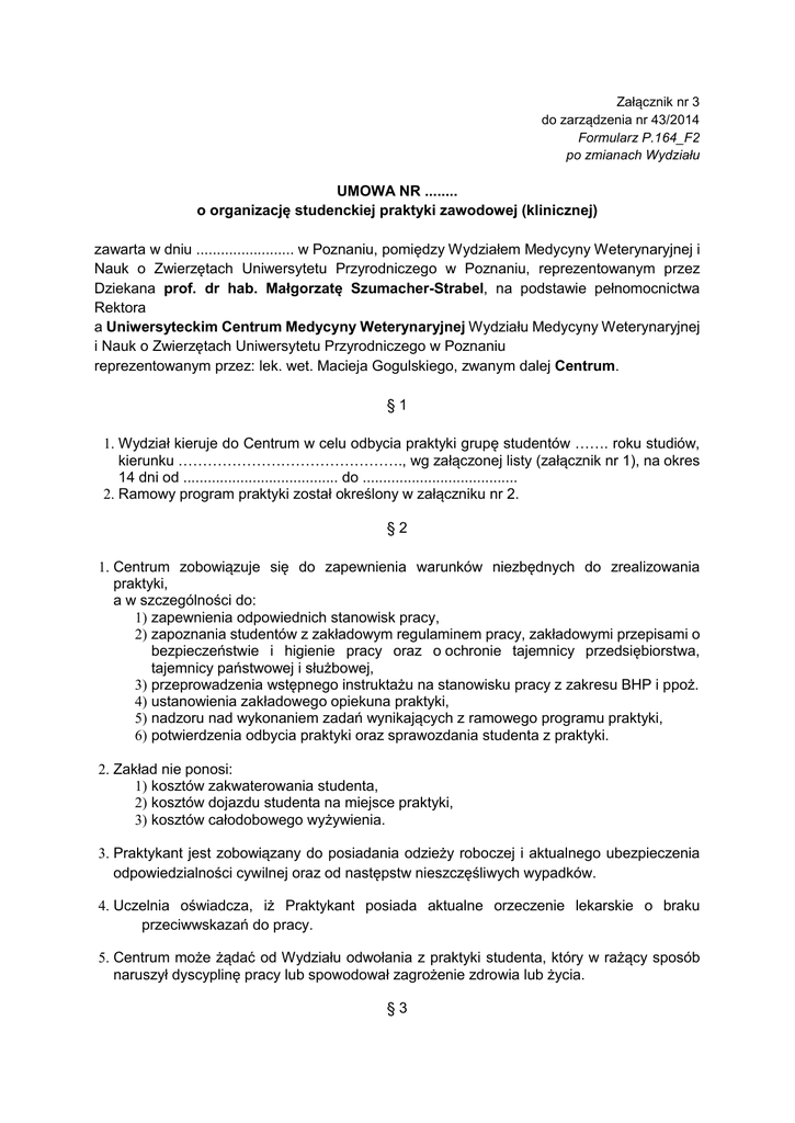 Załącznik nr 3 do zarządzenia nr 43/2014 Formularz P.164_F2 po zmianach Wydziału UMOWA NR ........ o organizację studenckiej praktyki zawodowej (klinicznej) zawarta w dniu ........................ w Poznaniu, pomiędzy Wydziałem Medycyny Weterynaryjnej i Nauk o Zwierzętach Uniwersytetu Przyrodniczego w Poznaniu, reprezentowanym przez Dziekana prof. dr hab. Małgorzatę Szumacher-Strabel, na podstawie pełnomocnictwa Rektora a Uniwersyteckim Centrum Medycyny Weterynaryjnej Wydziału Medycyny Weterynaryjnej i Nauk o Zwierzętach Uniwersytetu Przyrodniczego w Poznaniu reprezentowanym przez: lek. wet. Macieja Gogulskiego, zwanym dalej Centrum. §1 1. Wydział kieruje do Centrum w celu odbycia praktyki grupę studentów ……. roku studiów, kierunku ………………………………………., wg załączonej listy (załącznik nr 1), na okres 14 dni od ...................................... do ...................................... 2. Ramowy program praktyki został określony w załączniku nr 2. §2 1. Centrum zobowiązuje się do zapewnienia warunków niezbędnych do zrealizowania praktyki, a w szczególności do: 1) zapewnienia odpowiednich stanowisk pracy, 2) zapoznania studentów z zakładowym regulaminem pracy, zakładowymi przepisami o bezpieczeństwie i higienie pracy oraz o ochronie tajemnicy przedsiębiorstwa, tajemnicy państwowej i służbowej, 3) przeprowadzenia wstępnego instruktażu na stanowisku pracy z zakresu BHP i ppoż. 4) ustanowienia zakładowego opiekuna praktyki, 5) nadzoru nad wykonaniem zadań wynikających z ramowego programu praktyki, 6) potwierdzenia odbycia praktyki oraz sprawozdania studenta z praktyki. 2. Zakład nie ponosi: 1) kosztów zakwaterowania studenta, 2) kosztów dojazdu studenta na miejsce praktyki, 3) kosztów całodobowego wyżywienia. 3. Praktykant jest zobowiązany do posiadania odzieży roboczej i aktualnego ubezpieczenia odpowiedzialności cywilnej oraz od następstw nieszczęśliwych wypadków. 4. Uczelnia oświadcza, iż Praktykant posiada aktualne orzeczenie lekarskie o braku przeciwwskazań do pracy. 5. Centrum może żądać od Wydziału odwołania z praktyki studenta, który w rażący sposób naruszył dyscyplinę pracy lub spowodował zagrożenie zdrowia lub życia. §3 1. Praktyka jest odpłatna według zasad określonych w Uchwale Krajowej Rady LekarskoWeterynaryjnej z dnia 10 czerwca 2014 r. w sprawie ustalenia wysokości odpłatności za szkolenie praktyczne uczniów szkół ponadgimnazjalnych i szkolenie praktyczne studentów wydziałów medycyny weterynaryjnej w zakresie wynikającym z programu studiów. 2. Wysokość odpłatności za szkolenie praktyczne studentów wydziałów medycyny weterynaryjnej w zakresie wynikającym z programu studiów ustala się na kwotę 32,00 zł od osoby za dzień praktyki, tj. osiem godzin. 3. Centrum zobowiązane jest do wystawienia i złożenia do dziekanatu Wydziału prawidłowo wystawionej faktury najpóźniej w terminie 3 dni od zakończenia przez studenta praktyki. 4. Faktura będzie płatna w terminie 14 dni od dnia jej dostarczenia do dziekanatu Wydziału. §4 1. Wydział zobowiązuje się do sprawowania nadzoru dydaktycznego nad przebiegiem praktyki zawodowej studentów. 2. Przełożonym studentów odbywających praktykę zawodową jest koordynator praktyk, powołany przez dziekana. 3. Koordynator praktyk odpowiada za ich realizację zgodnie z ramowym programem oraz jest upoważniony, wspólnie z kierownictwem Centrum, do rozstrzygania spraw związanych z przebiegiem praktyki. §5 Wszelkie zmiany umowy wymagają formy pisemnej pod rygorem nieważności. §6 Niniejsza umowa została sporządzona w dwóch jednobrzmiących egzemplarzach, po jednym dla każdej ze Stron. Pieczęć i podpis dyrektora Centrum pieczęć i podpis Dziekana Załącznik nr 1 do umowy nr …..…………. z dnia …..………………….. o organizację 14.-dniowej studenckiej praktyki klinicznej Lista studentów skierowanych na praktykę do Uniwersyteckiego Centrum Medycyny Weterynaryjnej Uniwersytetu Przyrodniczego w Poznaniu L.p. Uwagi: Imię i nazwisko studenta Termin Załącznik nr 2 do umowy nr ……………. z dnia …..………………….. o organizację studenckiej praktyki klinicznej Ramowy program 14.-dniowej praktyki klinicznej na kierunku studiów Weterynaria, jednolite studia magisterskie Wydział Medycyny Weterynaryjnej i Nauk o Zwierzętach Miejsce praktyk: Uniwersyteckie Centrum Medycyny Weterynaryjnej Celem podstawowym jest: nabycie umiejętności praktycznych, uzupełniających i pogłębiających kompetencje uzyskane przez studenta w trakcie zajęć dydaktycznych szczególnie: Nauka podstaw funkcjonowania zakładów leczniczych dla zwierząt, ich organizacja. Studenci nabywają także podstawowe umiejętności w zakresie postępowania ze zwierzętami, ich pielęgnacją, podstawowymi zabiegami weterynaryjnymi, a także przeprowadzania wywiadu i prowadzenia zasad dokumentacji weterynaryjnej. Praktyka powinna obejmować: szkolenie BHP na stanowisku pracy, poznanie zakładu pracy – lokalizacja, organizacja, kierunki działania, stosowane metody i technologie, zadania mieszczące się tematycznie w szeroko pojętej dziedzinie weterynarii, opisanie wykonywanych zadań i wyciąganie wniosków (dzienniczek praktyk). Osoby odpowiedzialne za realizację praktyki: Kierunkowy Koordynator praktyk: dr n. wet. Jan Włodarek Prodziekan ds. Studiów: prof. dr hab. Jędrzej M. Jaśkowski Podstawą zaliczenia praktyki studenckiej jest pisemne sprawozdanie (dziennik praktyk) dokumentujące czas trwania praktyki oraz opis podstawowych zadań wykonywanych przez studenta, poświadczone przez organizatora praktyki w jednostce przyjmującej. Poznań, 2016 opracowuje koordynator praktyk zawodowych zgodnie z wymaganiami programu studiów, uwzględniając zakładane efekty kształcenia na danym kierunku studiów