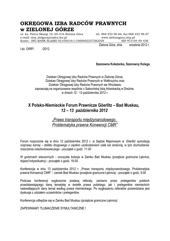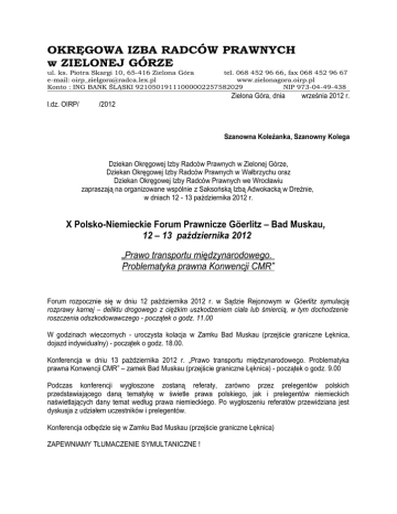 OKRĘGOWA IZBA RADCÓW PRAWNYCH w ZIELONEJ GÓRZE ul. ks. Piotra Skargi 10, 65-416 Zielona Góra tel. 068 452 96 66, fax 068 452 96 67 e-mail: [email protected] www.zielonagora.oirp.pl Konto : ING BANK ŚLĄSKI 92105019111000002257582029 NIP 973-04-49-438 Zielona Góra, dnia l.dz. OIRP/ września 2012 r. /2012 Szanowna Koleżanka, Szanowny Kolega Dziekan Okręgowej Izby Radców Prawnych w Zielonej Górze, Dziekan Okręgowej Izby Radców Prawnych w Wałbrzychu oraz Dziekan Okręgowej Izby Radców Prawnych we Wrocławiu zapraszają na organizowane wspólnie z Saksońską Izbą Adwokacką w Dreźnie, w dniach 12 - 13 października 2012 r. X Polsko-Niemieckie Forum Prawnicze Göerlitz – Bad Muskau, 12 – 13 października 2012 „Prawo transportu międzynarodowego. Problematyka prawna Konwencji CMR” Forum rozpocznie się w dniu 12 października 2012 r. w Sądzie Rejonowym w Göerlitz symulacją rozprawy karnej – deliktu drogowego z ciężkim uszkodzeniem ciała lub śmiercią, w tym dochodzenie roszczenia odszkodowawczego - początek o godz. 11.00 W godzinach wieczornych - uroczysta kolacja w Zamku Bad Muskau (przejście graniczne Łęknica, dojazd indywidualny) - początek o godz. 18.00. Konferencja w dniu 13 października 2012 r. „Prawo transportu międzynarodowego. Problematyka prawna Konwencji CMR” – zamek Bad Muskau (przejście graniczne Łęknica) - początek o godz. 9.00 Podczas konferencji wygłoszone zostaną referaty, zarówno przez prelegentów polskich przedstawiającego daną tematykę w świetle prawa polskiego, jak i prelegentów niemieckich naświetlających dany temat według prawa niemieckiego. Po wygłoszeniu referatów przewidziana jest dyskusja z udziałem uczestników i prelegentów. Konferencja odbędzie się w Zamku Bad Muskau (przejście graniczne Łęknica) ZAPEWNIAMY TŁUMACZENIE SYMULTANICZNE ! Dla uczestników rekomendujemy nocleg w hotelu (koszt ponoszony indywidualnie przez uczestników): HOTEL EUROPA (ul. 1 maja 8, Łęknica) cena za nocleg ze śniadaniem: 85,00 zł - pokój 1 – osobowy, 115,00 zł pokój 2 - osobowy lub 110,00 zł - pokój 1 – osobowy, 140,00 zł pokój 2 - osobowy Istnieje możliwość skorzystania z noclegu na terenie kompleksu pałacowego w Bad Muskau w cenie: pokój 1-osobowy - 67 euro, pokój 2-osobowy 94 euro. Termin zgłoszeń upływa w dniu: 8 października 2012 r. Opłata konferencyjna wynosi 200,00 zł – dla radców prawnych i 100,00 zł – dla aplikantów radcowskich (opłata obejmuje: kolację w dniu 12 października 2012 r., obiad i napoje w ciągu dnia 13 października 2012 r.). Pozostałą część opłaty dla członków OIRP w Zielonej Gorze pokrywa Izba. Formularz zgłoszenia oraz wszelkie informacje można uzyskać pod adresem: http://www.zielonagora.oirp.pl/ Szczegółowy program konferencji w załączeniu. Serdecznie zapraszam. Bożena Górska Dziekan Rady