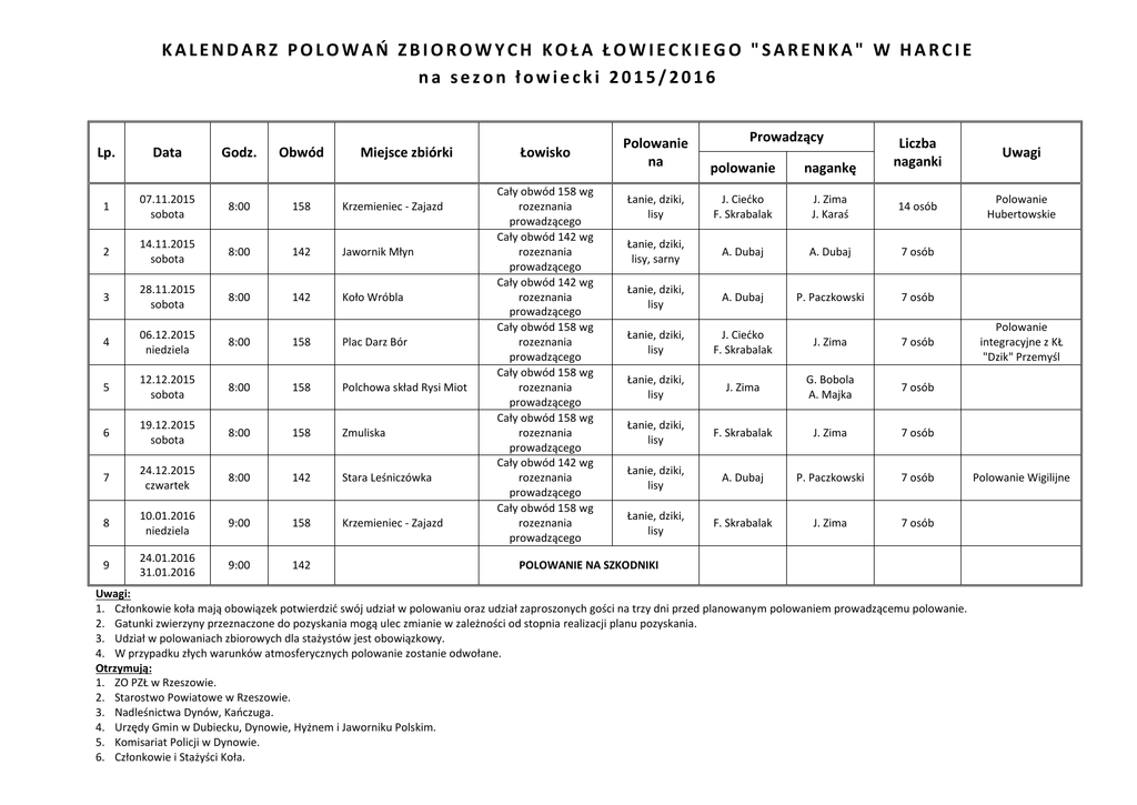 KALENDARZ POLOWAŃ ZBIOROWYCH KOŁA ŁOWIECKIEGO "SARENKA" W HARCIE na sezon łowiecki 2015/2016 Lp. Data Godz. Obwód Miejsce zbiórki 1 07.11.2015 sobota 8:00 158 Krzemieniec - Zajazd 2 14.11.2015 sobota 8:00 142 Jawornik Młyn 3 28.11.2015 sobota 8:00 142 Koło Wróbla 4 06.12.2015 niedziela 8:00 158 Plac Darz Bór 5 12.12.2015 sobota 8:00 158 Polchowa skład Rysi Miot 6 19.12.2015 sobota 8:00 158 Zmuliska 7 24.12.2015 czwartek 8:00 142 Stara Leśniczówka 8 10.01.2016 niedziela 9:00 158 Krzemieniec - Zajazd 9 24.01.2016 31.01.2016 9:00 142 Łowisko Cały obwód 158 wg rozeznania prowadzącego Cały obwód 142 wg rozeznania prowadzącego Cały obwód 142 wg rozeznania prowadzącego Cały obwód 158 wg rozeznania prowadzącego Cały obwód 158 wg rozeznania prowadzącego Cały obwód 158 wg rozeznania prowadzącego Cały obwód 142 wg rozeznania prowadzącego Cały obwód 158 wg rozeznania prowadzącego Polowanie na Prowadzący Liczba naganki Uwagi Polowanie Hubertowskie polowanie nagankę Łanie, dziki, lisy J. Ciećko F. Skrabalak J. Zima J. Karaś 14 osób Łanie, dziki, lisy, sarny A. Dubaj A. Dubaj 7 osób Łanie, dziki, lisy A. Dubaj P. Paczkowski 7 osób Łanie, dziki, lisy J. Ciećko F. Skrabalak J. Zima 7 osób Łanie, dziki, lisy J. Zima G. Bobola A. Majka 7 osób Łanie, dziki, lisy F. Skrabalak J. Zima 7 osób Łanie, dziki, lisy A. Dubaj P. Paczkowski 7 osób Łanie, dziki, lisy F. Skrabalak J. Zima 7 osób POLOWANIE NA SZKODNIKI Uwagi: 1. Członkowie koła mają obowiązek potwierdzić swój udział w polowaniu oraz udział zaproszonych gości na trzy dni przed planowanym polowaniem prowadzącemu polowanie. 2. Gatunki zwierzyny przeznaczone do pozyskania mogą ulec zmianie w zależności od stopnia realizacji planu pozyskania. 3. Udział w polowaniach zbiorowych dla stażystów jest obowiązkowy. 4. W przypadku złych warunków atmosferycznych polowanie zostanie odwołane. Otrzymują: 1. ZO PZŁ w Rzeszowie. 2. Starostwo Powiatowe w Rzeszowie. 3. Nadleśnictwa Dynów, Kańczuga. 4. Urzędy Gmin w Dubiecku, Dynowie, Hyżnem i Jaworniku Polskim. 5. Komisariat Policji w Dynowie. 6. Członkowie i Stażyści Koła. Polowanie integracyjne z KŁ "Dzik" Przemyśl Polowanie Wigilijne
