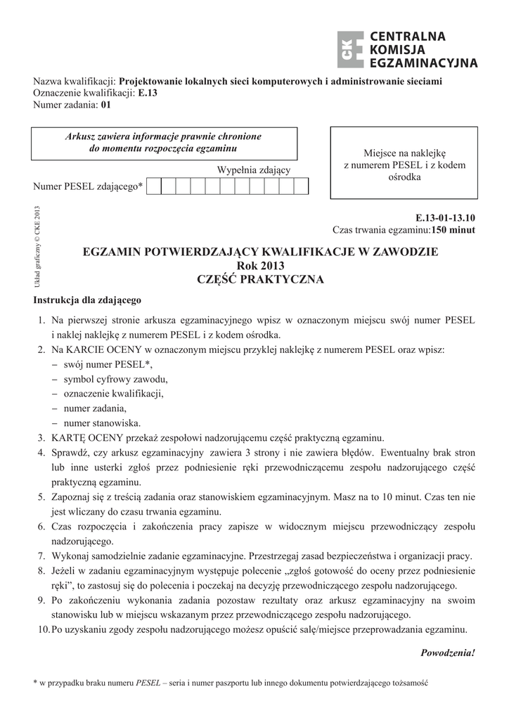 Nazwa kwalifikacji: Projektowanie lokalnych sieci komputerowych i administrowanie sieciami Oznaczenie kwalifikacji: E.13 Numer zadania: 01 Arkusz zawiera informacje prawnie chronione do momentu rozpoczęcia egzaminu Wypełnia zdający Układ graficzny © CKE 2013 Numer PESEL zdającego* Miejsce na naklejkę z numerem PESEL i z kodem ośrodka E.13-01-13.10 Czas trwania egzaminu:150 minut EGZAMIN POTWIERDZAJĄCY KWALIFIKACJE W ZAWODZIE Rok 2013 CZĘŚĆ PRAKTYCZNA Instrukcja dla zdającego 1. Na pierwszej stronie arkusza egzaminacyjnego wpisz w oznaczonym miejscu swój numer PESEL i naklej naklejkę z numerem PESEL i z kodem ośrodka. 2. Na KARCIE OCENY w oznaczonym miejscu przyklej naklejkę z numerem PESEL oraz wpisz: – swój numer PESEL*, – symbol cyfrowy zawodu, – oznaczenie kwalifikacji, – numer zadania, – numer stanowiska. 3. KARTĘ OCENY przekaż zespołowi nadzorującemu część praktyczną egzaminu. 4. Sprawdź, czy arkusz egzaminacyjny zawiera 3 strony i nie zawiera błędów. Ewentualny brak stron lub inne usterki zgłoś przez podniesienie ręki przewodniczącemu zespołu nadzorującego część praktyczną egzaminu. 5. Zapoznaj się z treścią zadania oraz stanowiskiem egzaminacyjnym. Masz na to 10 minut. Czas ten nie jest wliczany do czasu trwania egzaminu. 6. Czas rozpoczęcia i zakończenia pracy zapisze w widocznym miejscu przewodniczący zespołu nadzorującego. 7. Wykonaj samodzielnie zadanie egzaminacyjne. Przestrzegaj zasad bezpieczeństwa i organizacji pracy. 8. Jeżeli w zadaniu egzaminacyjnym występuje polecenie „zgłoś gotowość do oceny przez podniesienie ręki”, to zastosuj się do polecenia i poczekaj na decyzję przewodniczącego zespołu nadzorującego. 9. Po zakończeniu wykonania zadania pozostaw rezultaty oraz arkusz egzaminacyjny na swoim stanowisku lub w miejscu wskazanym przez przewodniczącego zespołu nadzorującego. 10. Po uzyskaniu zgody zespołu nadzorującego możesz opuścić salę/miejsce przeprowadzania egzaminu. Powodzenia! * w przypadku braku numeru PESEL – seria i numer paszportu lub innego dokumentu potwierdzającego tożsamość Zadanie egzaminacyjne Wykonaj modernizację lokalnej sieci komputerowej zgodnie z wytycznymi: 1. sprawdź poprawność wykonania kabla połączeniowego znajdującego się na stanowisku, wyniki testu zapisz w Tabeli 1. Mapa połączeń, 2. wykonaj kabel połączeniowy, prosty zgodnie ze standardem EIA/TIA 586 B, 3. skonfiguruj protokół TCP/IP na karcie sieciowej stacji roboczej zgodnie z ustawieniami protokołu TCP/IP urządzenia dostępowego AP (Access Point)1, 4. połącz wykonanym kablem stację roboczą z urządzeniem dostępowym przez przeglądarkę www, Uwaga: po nawiązaniu połączenia stacji roboczej z urządzeniem dostępowym zgłoś Przewodniczącemu Zespołu Nadzorującego Część Praktyczną, przez podniesienie ręki, wykonanie tego etapu prac. Po uzyskaniu zgody Przewodniczącego Zespołu Nadzorującego Część Praktyczną przystąp do dalszych czynności, 5. skonfiguruj urządzenie dostępowe AP do pracy w sieci, uwzględniając że: − sieć bezprzewodowa powinna mieć nazwę (SSID): Egzamin_x gdzie x – numer stanowiska egzaminacyjnego, − sieć powinna pracować na kanale 6 i stosować szyfrowanie WPA2 z hasłem PESEL (PESEL to twój numer PESEL), − adres IP interfejsu AP powinien wynosić: 10.0.0.x gdzie x - numer stanowiska egzaminacyjnego, − maska: 255.255.255.0 6. 7. − brama: 10.0.0.254 podłącz urządzenie dostępowe AP do istniejącej infrastruktury sieciowej - gniazda opisanego symbolem serwer, skonfiguruj protokół TCP/IP na stacji roboczej do pracy w sieci LAN: − adres IP 10.0.0.(100+x) gdzie x – numer stanowiska egzaminacyjnego, − maska 255.255.255.0 8. zaloguj się ze stacji roboczej do sieci bezprzewodowej, 9. zaloguj się na serwer o adresie 10.0.0.254 jako użytkownik jkowalski z hasłem jkowalski, skopiuj plik z katalogu C:\KOWALSKI na swój dysk lokalny do katalogu o nazwie PESEL (PESEL to twój numer PESEL), udostępnij katalog w sieci tak, aby wszyscy mieli prawo do odczytu i zapisywania danych w katalogu. 1 Konfiguracja początkowa bezprzewodowego urządzenia dostępowego AP zamieszczona jest w Załączniku 1, znajdującym się na stanowisku egzaminacyjnym. Czas przeznaczony na wykonanie zadania wynosi 150 minut. Ocenie podlegać będzie 5 rezultatów: − wyniki testów kabla połączeniowego, − wykonany kabel połączeniowy, − połączona stacja robocza z urządzeniem dostępowym przez przeglądarkę www, − skonfigurowane bezprzewodowe urządzenie dostępowe, − pobrane pliki z serwera i zapisane w udostępnionym katalogu stacji roboczej Strona 2 z 3 oraz − przebieg podłączenia bezprzewodowego urządzenia dostępowego AP do sieci LAN. Tabela 1. Mapa połączeń Kolor izolacji żyły Nr pinu w RJ45 A Nr pinu w RJ45 B Biało-pomarańczowy Pomarańczowy Biało-zielony Zielony Niebieski Biało-niebieski Biało -brązowy Brązowy Czy kabel jest sprawny? (T/N) 2 Należy wpisać Tak lub Nie Strona 3 z 3 Ciągłość żyły zachowana2