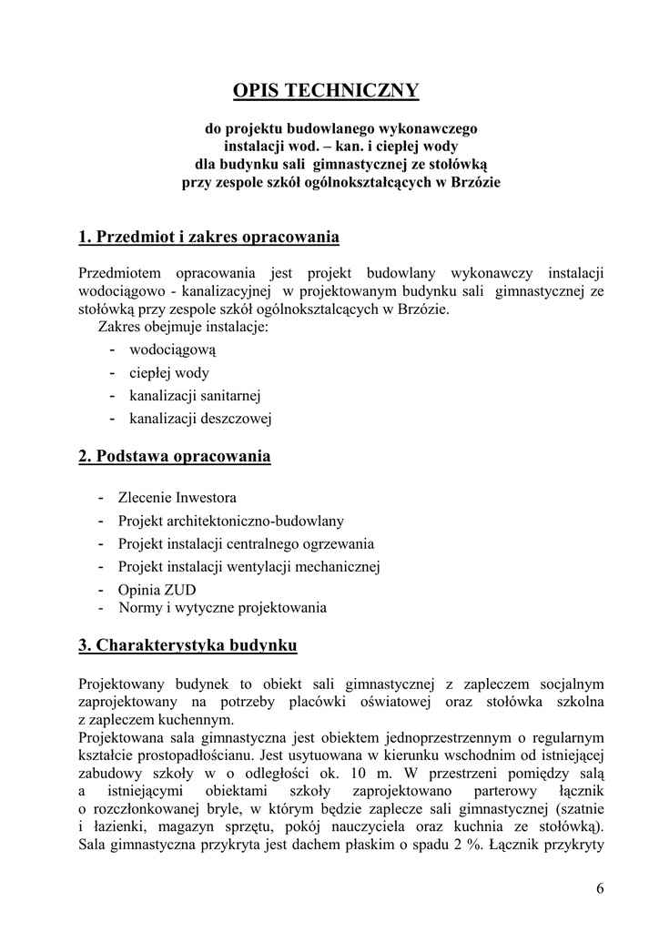 OPIS TECHNICZNY do projektu budowlanego wykonawczego instalacji wod. – kan. i ciepłej wody dla budynku sali gimnastycznej ze stołówką przy zespole szkół ogólnokształcących w Brzózie 1. Przedmiot i zakres opracowania Przedmiotem opracowania jest projekt budowlany wykonawczy instalacji wodociągowo - kanalizacyjnej w projektowanym budynku sali gimnastycznej ze stołówką przy zespole szkół ogólnoksztalcących w Brzózie. Zakres obejmuje instalacje: - wodociągową - ciepłej wody - kanalizacji sanitarnej - kanalizacji deszczowej 2. Podstawa opracowania - Zlecenie Inwestora Projekt architektoniczno-budowlany Projekt instalacji centralnego ogrzewania Projekt instalacji wentylacji mechanicznej Opinia ZUD Normy i wytyczne projektowania 3. Charakterystyka budynku Projektowany budynek to obiekt sali gimnastycznej z zapleczem socjalnym zaprojektowany na potrzeby placówki oświatowej oraz stołówka szkolna z zapleczem kuchennym. Projektowana sala gimnastyczna jest obiektem jednoprzestrzennym o regularnym kształcie prostopadłościanu. Jest usytuowana w kierunku wschodnim od istniejącej zabudowy szkoły w o odległości ok. 10 m. W przestrzeni pomiędzy salą a istniejącymi obiektami szkoły zaprojektowano parterowy łącznik o rozczłonkowanej bryle, w którym będzie zaplecze sali gimnastycznej (szatnie i łazienki, magazyn sprzętu, pokój nauczyciela oraz kuchnia ze stołówką). Sala gimnastyczna przykryta jest dachem płaskim o spadu 2 %. Łącznik przykryty 6 jest równieŜ dachem płaskim pogrąŜonym. Do łącznika prowadzą dwa wejścia – jedno od strony północnej a drugie od strony południowej. Wejście od strony południowej przystosowane jest dla osób niepełnosprawnych, poprzez zastosowanie pochylni terenowych. Projektowane obiekty są niepodpiwniczone i zaliczają się do obiektów niskich (h-do12,0 m). Hala sportowa została zaprojektowana z uwzględnieniem załoŜeń programu funkcjonalno uŜytkowego przedstawionego przez zamawiającego. Arenę sportową przystosowaną do: akrobatyki, badmintona, koszykówki, tańca, gimnastyki rytmicznej, tenisa stołowego, tenisa, piłki siatkowej (ograniczony rozmiar), zapasów o wymiarach 36,30x18,00m - wysokość nad areną od podłogi do konstrukcji i instalacji 7,50 m - widownia (miejsca siedzące) 161 miejsc - zaplecze szatniowo - sanitarne złoŜone z dwóch przebieralni - pozostałe pomieszczenia niezbędne do obsługi obiektu. Sala gimnastyczna posiada dwa niezaleŜne wyjścia spełniające wymagania przepisów p. poŜ. W strefie wejściowej przewidziano hol, z którego prowadzi korytarz do przebieralni, magazynu sprzętu sportowego, pokoju nauczycieli WF, a takŜe znajduje się główne wejście na arenę sportową. 4. Opis instalacji wody zimnej Instalacja na potrzeby bytowo - gospodarcze Zasilanie w wodę projektowanego budynku z wodociągu gminnego biegnącego po terenie działki 5/1, projektowanym przyłączem wodociągowym D=90 PEHD. Projekt przyłącza wodociągowego stanowi oddzielne opracowanie. Pomiar zuŜycia wody w węźle wodomierzowym zlokalizowanym w studzience wodomierzowej zlokalizowanej przed budynkiem. Zaprojektowano wodomierz skrzydełkowy z zaworami odcinającymi. Za drugim zaworem odcinającym za wodomierzem naleŜy zamontować zawór zwrotny antyskaŜeniowy. Zestaw wodomierzowy ujęto w pbw przyłączy wod-kan. Instalacja wodociągowa wyposaŜona będzie w następujące punkty czerpalne: - baterie umywalkowe - baterie zlewozmywakowe - płuczki ustępowe - zawory ze złączką do węŜa - zawory natryskowe - mieszacze termostatyczne 7 Główne przewody poziome i piony wodociągowe projektuje się z rur stalowych ocynkowanych TWT – 2 wg PN – 80/H-74200, łączonych na gwint i pastę uszczelniającą bądź konopie. W/w przewody rozprowadzające prowadzić w posadzce oraz pod stropem kondygnacji. Piony prowadzić po ścianie budynku w bruzdach. Mocowanie za pomocą podpór stałych przy odgałęzieniach i przesuwnych. Podejścia pod przybory sanitarne wykonać z rur polietylenowych wielowarstwowych PE-Xc z osłoną antydyfuzyjną łączonych za pomocą pierścieni zaciskowych z pierścieniem pełnym. Podejścia prowadzić w podłodze oraz w bruzdach ściennych. Przewody układać zgodnie z zaleceniami producenta systemu szczególnie przestrzegając zasady kompensacji przewodów. Na odgałęzieniach naleŜy stosować ramię kompensacyjne. Przejścia przez ściany i stropy w tulejach ochronnych. Izolacje przewodów zgodnie z obowiązującymi warunkami technicznymi. Na odgałęzieniach zamontować zawory odcinające kulowe. Na połączeniach płuczek zamontować zawory odcinające z węŜykiem elastycznym w oplocie metalowym. Zaprojektowano zastosowanie następujących materiałów: • Baterie umywalkowe stojące • Baterie zlewozmywakowe stojące • Zawory natryskowe PRESTO 50B nr 38222 • mieszacze termostatyczne PRESTO SFR II nr 29002 ( do 3-4 natrysków z zaworami PRESTO 50B) Próba szczelności na ciśnienie 1,0 MPa. Instalacja p.-poŜ. Instalację p-poŜ w projektowanym budynku stanowią dwa hydranty p-poŜ φ25 instalowane w holu wejściowym (pom. 02) i w korytarzu (pom.03) na parterze . Przejście instalacji poprzez ściany i stropy zabezpieczyć płytami z wełny mineralnej wg systemu „FIRE PRO”, Rockwool. 5. Opis instalacji wody ciepłej Zaopatrzenie w ciepłą wodę - z istniejącej kotłowni zlokalizowanej w piwnicy w części istniejącej budynku. Projektowane piony i poziomy rozprowadzające oraz cyrkulacyjne projektuje się z rur z rur stalowych podwójnie ocynkowanych TWT – 2 wg PN – 80/H74200, łączonych na gwint i pastę uszczelniającą bądź konopie. W/w przewody rozprowadzające prowadzić pod stropem kondygnacji oraz w bruzdach ściennych. Podejścia pod przybory sanitarne wykonać z rur polietylenowych wielowarstwowych PE-Xc z osłoną antydyfuzyjną łączonych za pomocą pierścieni 8 zaciskowych z pierścieniem pełnym. Podejścia prowadzić w podłod