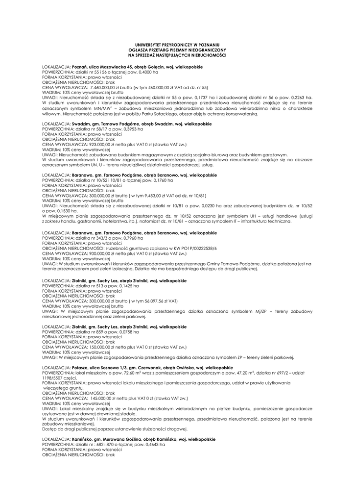 UNIWERSYTET PRZYRODNICZY W POZNANIU OGŁASZA PRZETARG PISEMNY NIEOGRANICZONY NA SPRZEDAŻ NASTĘPUJĄCYCH NIERUCHOMOŚCI LOKALIZACJA: Poznań, ulica Mazowiecka 45, obręb Golęcin, woj. wielkopolskie POWIERZCHNIA: działki nr 55 i 56 o łącznej pow. 0,4000 ha FORMA KORZYSTANIA: prawo własności OBCIĄŻENIA NIERUCHOMOŚCI: brak CENA WYWOŁAWCZA: 7.460.000,00 zł brutto (w tym 460.000,00 zł VAT od dz. nr 55) WADIUM: 10% ceny wywoławczej brutto UWAGI: Nieruchomość składa się z niezabudowanej działki nr 55 o pow. 0,1737 ha i zabudowanej działki nr 56 o pow. 0,2263 ha. W studium uwarunkowań i kierunków zagospodarowania przestrzennego przedmiotowa nieruchomość znajduje się na terenie oznaczonym symbolem MN/MW* – zabudowa mieszkaniowa jednorodzinna lub zabudowa wielorodzinna niska o charakterze willowym. Nieruchomość położona jest w pobliżu Parku Sołackiego, obszar objęty ochroną konserwatorską. LOKALIZACJA: Swadzim, gm. Tarnowo Podgórne, obręb Swadzim, woj. wielkopolskie POWIERZCHNIA: działka nr 58/17 o pow. 0,3953 ha FORMA KORZYSTANIA: prawo własności OBCIĄŻENIA NIERUCHOMOŚCI: brak CENA WYWOŁAWCZA: 923.000,00 zł netto plus VAT 0 zł (stawka VAT zw.) WADIUM: 10% ceny wywoławczej UWAGI: Nieruchomość zabudowana budynkiem magazynowym z częścią socjalno-biurową oraz budynkiem garażowym. W studium uwarunkowań i kierunków zagospodarowania przestrzennego, przedmiotowa nieruchomość znajduje się na obszarze oznaczonym symbolem UN, U – tereny nieuciążliwej działalności gospodarczej, usług. LOKALIZACJA: Baranowo, gm. Tarnowo Podgórne, obręb Baranowo, woj. wielkopolskie POWIERZCHNIA: działka nr 10/52 i 10/81 o łącznej pow. 0,1760 ha FORMA KORZYSTANIA: prawo własności OBCIĄŻENIA NIERUCHOMOŚCI: brak CENA WYWOŁAWCZA: 300.000,00 zł brutto ( w tym 9.453,00 zł VAT od dz. nr 10/81) WADIUM: 10% ceny wywoławczej brutto UWAGI: Nieruchomość składa się z niezabudowanej działki nr 10/81 o pow. 0,0230 ha oraz zabudowanej budynkiem dz. nr 10/52 o pow. 0,1530 ha. W miejscowym planie zagospodarowania przestrzennego dz. nr 10/52 oznaczona jest symbolem UH – usługi handlowe (usługi z zakresu handlu, gastronomii, hotelarstwa, itp.), natomiast dz. nr 10/81 – oznaczona symbolem IT – infrastruktura techniczna. LOKALIZACJA: Baranowo, gm. Tarnowo Podgórne, obręb Baranowo, woj. wielkopolskie POWIERZCHNIA: działka nr 343/3 o pow. 0,7960 ha FORMA KORZYSTANIA: prawo własności OBCIĄŻENIA NIERUCHOMOŚCI: służebność gruntowa zapisana w KW PO1P/00222538/6 CENA WYWOŁAWCZA: 900.000,00 zł netto plus VAT 0 zł (stawka VAT zw.) WADIUM: 10% ceny wywoławczej UWAGI: W studium uwarunkowań i kierunków zagospodarowania przestrzennego Gminy Tarnowo Podgórne, działka położona jest na terenie przeznaczonym pod zieleń izolacyjną. Działka nie ma bezpośredniego dostępu do drogi publicznej. LOKALIZACJA: Złotniki, gm. Suchy Las, obręb Złotniki, woj. wielkopolskie POWIERZCHNIA: działka nr 513 o pow. 0,1425 ha FORMA KORZYSTANIA: prawo własności OBCIĄŻENIA NIERUCHOMOŚCI: brak CENA WYWOŁAWCZA: 300.000,00 zł brutto ( w tym 56.097,56 zł VAT) WADIUM: 10% ceny wywoławczej brutto UWAGI: W miejscowym planie zagospodarowania przestrzennego działka oznaczona symbolem Mj/ZP – tereny zabudowy mieszkaniowej jednorodzinnej oraz zieleni parkowej. LOKALIZACJA: Złotniki, gm. Suchy Las, obręb Złotniki, woj. wielkopolskie POWIERZCHNIA: działka nr 859 o pow. 0,0758 ha FORMA KORZYSTANIA: prawo własności OBCIĄŻENIA NIERUCHOMOŚCI: brak CENA WYWOŁAWCZA: 150.000,00 zł netto plus VAT 0 zł (stawka VAT zw.) WADIUM: 10% ceny wywoławczej UWAGI: W miejscowym planie zagospodarowania przestrzennego działka oznaczona symbolem ZP – tereny zieleni parkowej. LOKALIZACJA: Potasze, ulica Sosnowa 1/3, gm. Czerwonak, obręb Owińska, woj. wielkopolskie POWIERZCHNIA: lokal mieszkalny o pow. 72,60 m2 wraz z pomieszczeniem gospodarczym o pow. 47,20 m2, działka nr 697/2 – udział 1198/5507 części, FORMA KORZYSTANIA: prawo własności lokalu mieszkalnego i pomieszczenia gospodarczego, udział w prawie użytkowania wieczystego gruntu, OBCIĄŻENIA NIERUCHOMOŚCI: brak CENA WYWOŁAWCZA: 145.000,00 zł netto plus VAT 0 zł (stawka VAT zw.) WADIUM: 10% ceny wywoławczej UWAGI: Lokal mieszkalny znajduje się w budynku mieszkalnym wielorodzinnym na piętrze budynku, pomieszczenie gospodarcze usytuowane jest w dawnej drewnianej stodole. W studium uwarunkowań i kierunków zagospodarowania przestrzennego, przedmiotowa nieruchomość, położona jest na terenie zabudowy mieszkaniowej. Dostęp do drogi publicznej poprzez ustanowienie służebności drogowej. LOKALIZACJA: Kamińsko, gm. Murowana Goślina, obręb Kamińsko, woj. wielkopolskie POWIERZCHNIA: działki nr : 682 i 870 o łącznej pow. 0,4643 ha FORMA KORZYSTANIA: prawo własności OBCIĄŻENIA NIERUCHOMOŚCI: brak CENA WYWOŁAWCZA: 250.000,00 zł netto plus VAT 0 zł (stawka VAT zw.) WADIUM: 10% ceny wywoławczej UWAGI: Nieruchomość składa się z niezabudowanej działki nr 682 o pow. 0,2139 ha i zabudowanej budynkiem działki nr 870 o pow. 0,2504 ha. W studium uwarunkowań i kierunków zagospodarowania przestrzennego działka nr 870 położona jest na terenie zabudowy mieszkaniowej jednorodzinnej oraz zabudowy zagrodowej z dopuszczeniem usług – oznaczona symbolem MN1, działka nr 682 stanowi użytek rolny i korytarz ekologiczny. LOKALIZACJA: Rakownia, gm. Murowana Goślina, obręb Rakownia, woj. wielkopolskie POWIERZCHNIA: działka nr 135/1 o pow. 0,1275 ha FORMA KORZYSTANIA: prawo własności OBCIĄŻENIA NIERUCHOMOŚCI: brak CENA WYWOŁAWCZA: 99.000,00 zł netto plus 23 % VAT, tj. 121.770,00 zł brutto WADIUM: 10% ceny wywoławczej brutto UWAGI: W miejscowym planie zagospodarowania przestrzennego działka oznaczona symbolem 5MR – teren zabudowy zagrodowej mieszkaniowo-gospodarczej. Dostęp do drogi publicznej poprzez ustanowienie służebności drogowej. LOKALIZACJA: Rakownia, gm. Murowana Goślina, 