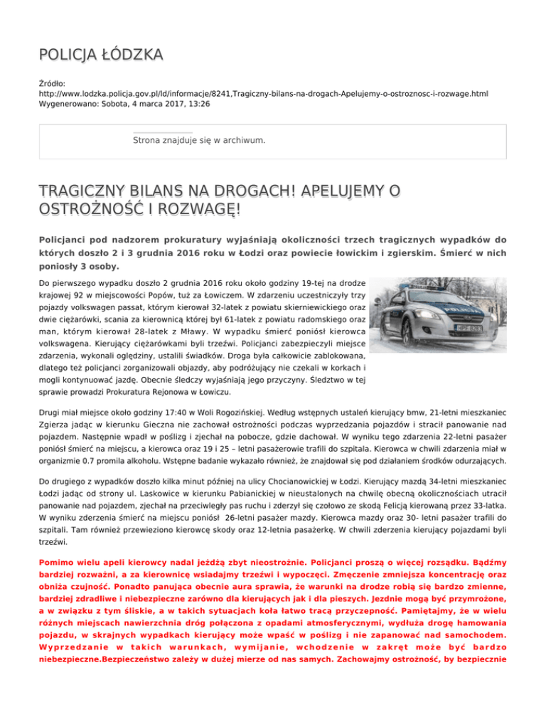 POLICJA ŁÓDZKA Źródło: http://www.lodzka.policja.gov.pl/ld/informacje/8241,Tragiczny-bilans-na-drogach-Apelujemy-o-ostroznosc-i-rozwage.html Wygenerowano: Sobota, 4 marca 2017, 13:26 Strona znajduje się w archiwum. TRAGICZNY BILANS NA DROGACH! APELUJEMY O OSTROŻNOŚĆ I ROZWAGĘ! Policjanci pod nadzorem prokuratury wyjaśniają okoliczności trzech tragicznych wypadków do których doszło 2 i 3 grudnia 2016 roku w Łodzi oraz powiecie łowickim i zgierskim. Śmierć w nich poniosły 3 osoby. Do pierwszego wypadku doszło 2 grudnia 2016 roku około godziny 19-tej na drodze krajowej 92 w miejscowości Popów, tuż za Łowiczem. W zdarzeniu uczestniczyły trzy pojazdy volkswagen passat, którym kierował 32-latek z powiatu skierniewickiego oraz dwie ciężarówki, scania za kierownicą której był 61-latek z powiatu radomskiego oraz man, którym kierował 28-latek z Mławy. W wypadku śmierć poniósł kierowca volkswagena. Kierujący ciężarówkami byli trzeźwi. Policjanci zabezpieczyli miejsce zdarzenia, wykonali oględziny, ustalili świadków. Droga była całkowicie zablokowana, dlatego też policjanci zorganizowali objazdy, aby podróżujący nie czekali w korkach i mogli kontynuować jazdę. Obecnie śledczy wyjaśniają jego przyczyny. Śledztwo w tej sprawie prowadzi Prokuratura Rejonowa w Łowiczu. Drugi miał miejsce około godziny 17:40 w Woli Rogozińskiej. Według wstępnych ustaleń kierujący bmw, 21-letni mieszkaniec Zgierza jadąc w kierunku Gieczna nie zachował ostrożności podczas wyprzedzania pojazdów i stracił panowanie nad pojazdem. Następnie wpadł w poślizg i zjechał na pobocze, gdzie dachował. W wyniku tego zdarzenia 22-letni pasażer poniósł śmierć na miejscu, a kierowca oraz 19 i 25 – letni pasażerowie trafili do szpitala. Kierowca w chwili zdarzenia miał w organizmie 0.7 promila alkoholu. Wstępne badanie wykazało również, że znajdował się pod działaniem środków odurzających. Do drugiego z wypadków doszło kilka minut później na ulicy Chocianowickiej w Łodzi. Kierujący mazdą 34-letni mieszkaniec Łodzi jadąc od strony ul. Laskowice w kierunku Pabianickiej w nieustalonych na chwilę obecną okolicznościach utracił panowanie nad pojazdem, zjechał na przeciwległy pas ruchu i zderzył się czołowo ze skodą Felicją kierowaną przez 33-latka. W wyniku zderzenia śmierć na miejscu poniósł 26-letni pasażer mazdy. Kierowca mazdy oraz 30- letni pasażer trafili do szpitali. Tam również przewieziono kierowcę skody oraz 12-letnia pasażerkę. W chwili zderzenia kierujący pojazdami byli trzeźwi. Pomimo wielu apeli kierowcy nadal jeżdżą zbyt nieostrożnie. Policjanci proszą o więcej rozsądku. Bądźmy bardziej rozważni, a za kierownicę wsiadajmy trzeźwi i wypoczęci. Zmęczenie zmniejsza koncentrację oraz obniża czujność. Ponadto panująca obecnie aura sprawia, że warunki na drodze robią się bardzo zmienne, bardziej zdradliwe i niebezpieczne zarówno dla kierujących jak i dla pieszych. Jezdnie mogą być przymrożone, a w związku z tym śliskie, a w takich sytuacjach koła łatwo tracą przyczepność. Pamiętajmy, że w wielu różnych miejscach nawierzchnia dróg połączona z opadami atmosferycznymi, wydłuża drogę hamowania pojazdu, w skrajnych wypadkach kierujący może wpaść w poślizg i nie zapanować nad samochodem. Wyprzedzanie w takich warunkach, wymijanie, wchodzenie w zakręt może być bardzo niebezpieczne.Bezpieczeństwo zależy w dużej mierze od nas samych. Zachowajmy ostrożność, by bezpiecznie dotrzeć do celu. Ocena: 0/5 (0) Tweetnij
