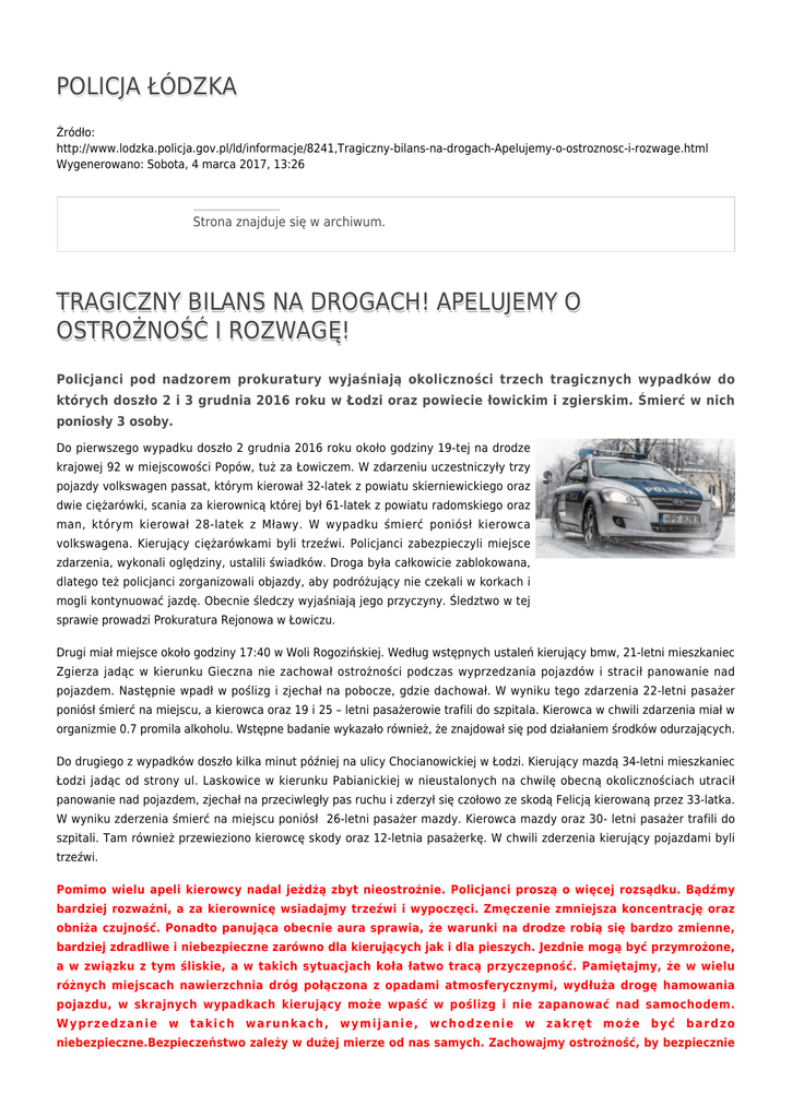 POLICJA ŁÓDZKA TRAGICZNY BILANS NA DROGACH