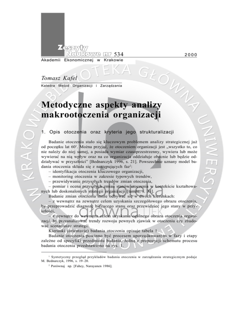 534 2000 Akademii Ekonomicznej w Krakowie Tomasz Kafel Katedra Metod Organizacji i Zarz¹dzania Metodyczne aspekty analizy makrootoczenia organizacji 1. Opis otoczenia oraz kryteria jego strukturalizacji Badanie otoczenia sta³o siê kluczowym problemem analizy strategicznej ju¿ od pocz¹tku lat 601. Mo¿na przyj¹æ, ¿e otoczeniem organizacji jest „wszystko to, co nie nale¿y do niej samej, a posiada wymiar czasoprzestrzenny, wywiera lub mo¿e wywieraæ na ni¹ wp³yw oraz na co organizacja oddzia³uje obecnie lub bêdzie oddzia³ywaæ w przysz³oœci” [Bednarczyk 1996, s. 21]. Powszechnie uznany model badania otoczenia sk³ada siê z nastêpuj¹cych faz2: – identyfikacja otoczenia kluczowego organizacji, – monitoring otoczenia w zakresie typowych trendów, – przewidywanie przysz³ych trendów zmian otoczenia, – pomiar i ocena przysz³ych zmian stanów otoczenia w kontekœcie kszta³towanych lub doskonalonych strategii organizacji [tam¿e, s. 33]. Badanie zmian otoczenia mo¿e odbywaæ siê w dwóch kierunkach: – z wewn¹trz na zewn¹trz celem uzyskania szczegó³owego obrazu otoczenia, by przeprowadziæ diagnozê bie¿¹cego stanu oraz przewidzieæ jego stany w przysz³oœci, – z zewn¹trz do wewn¹trz celem uzyskania ogólnego obrazu otoczenia organizacji, by przeanalizowaæ trendy rozwoju pewnych zjawisk w otoczeniu czy zbudowaæ scenariusze strategii. Kierunki (orientacje) badania otoczenia opisuje tabela 1. Badanie otoczenia powinno byæ procesem uporz¹dkowanym w fazy i etapy zale¿ne od specyfiki przedmiotu badania. Jedn¹ z propozycji schematu procesu badania otoczenia przedstawiono na rys. 1. 1 Syntetyczny przegl¹d przyk³adów badania otoczenia w zarz¹dzaniu strategicznym podaje M. Bednarczyk, 1996, s. 19–20. 2 Porównaj np. [Fahey, Narayanen 1986]. Tomasz Kafel 40 Tabela 1. Orientacje badania otoczenia Cecha badania otoczenia Badanie „z zewnątrz do wewnątrz” Badanie „z wewnątrz na zewnątrz” Istota i zakres względnie obiektywny obraz otoczenia obraz otoczenia ze względu na misję i wizję organizacji Cel szeroki obraz otoczenia przed sformułowaniem preferencji organizacji badanie cech otoczenia istotnych w procesie zarządzania strategicznego Przedział czasu najczęściej 1–5 lat czasem 5–10 lat najczęściej 1–3 lat Częstotliwość periodycznie/ad hoc nieprzerwanie/periodycznie Zalety – pozwala uniknąć zaskoczenia, – skuteczność, – ocena ukierunkowana na – identyfikacja trendów możliwość wdrażania rozwoju zjawisk w otoczeniu, wniosków w aktualnie – identyfikacja słabych realizowanych procesach sygnałów Źród³o: [Bednarczyk 1996, s. 37 na podstawie L. Fahey, V.K. Narayanan 1986, s. 46]. G³ówne obiekty badania otoczenia podzieliæ mo¿emy ze wzglêdu na przedmiot (problem) lub podmiot badania. Celem wyodrêbnienia przedmiotowego jest okreœlenie kluczowych zjawisk maj¹cych miejsce w otoczeniu, które uwzglêdniæ nale¿y w doskonaleniu, czy wrêcz kszta³towaniu strategii przedsiêbiorstwa. Celem wyodrêbnienia podmiotowego jest okreœlenie kluczowych jednostek (partnerów) b¹dŸ grup wp³ywaj¹cych na „interes” przedsiêbiorstwa. O tym, czy proces ten obejmowa³ bêdzie wiêkszy czy mniejszy zakres badanych (przedmiotowych lub/i podmiotowych) obiektów otoczenia decydowaæ bêdzie to, czy bêdzie on prowadzony dla ca³ej organizacji, jej czêœci, czy obszaru funkcjonalnego. Brak jest jednoznacznoœci w opisie otoczenia, czego dowodem jest charakteryzowanie go za pomoc¹ wielu cech syntetycznych np.: sposobu oddzia³ywania (bezpoœrednie-poœrednie), niepewnoœæ (zdeterminowane-ryzykowne), struktura (proste-z³o¿one)3. Powszechnie uznany i u¿yteczny dla organizacji jest opis otoczenia ze wzglêdu na cechê jak¹ jest sposób oddzia³ywania na organizacjê. Dziêki temu, ¿e charakteryzuje siê ró¿n¹ intensywnoœci¹ oraz odmiennymi kierunkami pozwala nam wyró¿niæ w strukturze otoczenia dwa jego podstawowe typy: – otoczenie poœrednio oddzia³uj¹ce, w którym formu³owane s¹ oczekiwania, preferencje bez mo¿liwoœci bezpoœredniego „zmuszania” przedsiêbiorstwa do zmiany jego strategii, – otoczenie bezpoœrednio oddzia³uj¹ce, które dysponuje zbiorem bodŸców „zmuszaj¹cych” przedsiêbiorstwo do zmiany jego strategii. 3 Porównaj prace [Lawrance, Lorsch 1974, Porter 1980, Ansoff 1985, Fahey, Narayanan 1986 za M. Bednarczyk]. Metodyczne aspekty analizy makrootoczenia organizacji 1. Wartości, doświadczenie i intuicja decydentów 2. Wiedza decydentów 3. Źródła informacji Percepcja otoczenia Przesłanki badania otoczenia I. Faza wstępna Ustalenie: – celu badania – zakresu i poziomu badania, – przedmiotu badania – zbiór syntetycznych i cząstkowych charakterystyk otoczenia – zbiór modeli i metod pomiaru – analiza powiązań pomiędzy elementami otoczenia – zbiór standardowych charakterystyk otoczenia 41 – potrzeba zmiany strategii – sygnały o zmianach stanów otoczenia – bieżąca obserwacja otoczenia II. Faza przygotowania badania 1. Konkretyzacja celów i oczekiwanych wyników 2. Określenie zasad i dobór metod badania 3. Określenie trybu realizacji zadania 4. Organizacja badania III. Faza realizacji badania Badania otoczenia według przyjętych założeń IV. Kontrola i ocena wyników badania 1. Ustalenie zależności otoczenia – rodzaje strategii 2. Określenie założeń dla procesów budowy i doskonalenia, implementacji oraz kontroli realizacji strategii Rys. 1. Jednostkowy proces badania otoczenia Źród³o: [Bednarczyk 1996, s. 39]. J. Trzcieniecki, opieraj¹c siê na sposobie oddzia³ywania jako kryterium podzia³u, wyró¿ni³ makrootoczenie i otoczenie konkurencyjne (mikrootoczenie)4. Makrootoczeniem nazywaæ bêdziemy „zespó³ warunków funkcjonowania przedsiêbiorstwa zwi¹zany z faktem, ¿e dzia³a ono w okreœlonym kraju i regionie, strefie klimatycznej, w danym uk³adzie politycznym, prawnym, instytucjonalnym, w danym momencie 