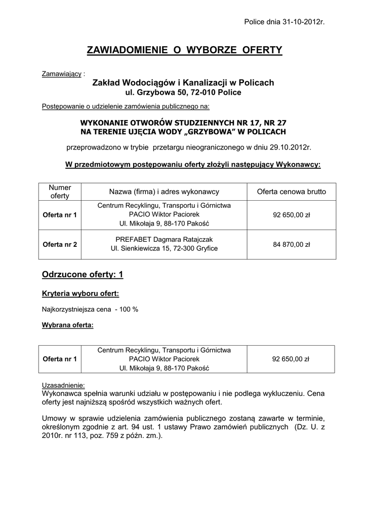 Police dnia 31-10-2012r. ZAWIADOMIENIE O WYBORZE OFERTY Zamawiający : Zakład Wodociągów i Kanalizacji w Policach ul. Grzybowa 50, 72-010 Police Postępowanie o udzielenie zamówienia publicznego na: WYKONANIE OTWORÓW STUDZIENNYCH NR 17, NR 27 NA TERENIE UJĘCIA WODY „GRZYBOWA” W POLICACH przeprowadzono w trybie przetargu nieograniczonego w dniu 29.10.2012r. W przedmiotowym postępowaniu oferty złożyli następujący Wykonawcy: Numer oferty Nazwa (firma) i adres wykonawcy Oferta cenowa brutto Oferta nr 1 Centrum Recyklingu, Transportu i Górnictwa PACIO Wiktor Paciorek Ul. Mikołaja 9, 88-170 Pakość 92 650,00 zł Oferta nr 2 PREFABET Dagmara Ratajczak Ul. Sienkiewicza 15, 72-300 Gryfice 84 870,00 zł Odrzucone oferty: 1 Kryteria wyboru ofert: Najkorzystniejsza cena - 100 % Wybrana oferta: Oferta nr 1 Centrum Recyklingu, Transportu i Górnictwa PACIO Wiktor Paciorek Ul. Mikołaja 9, 88-170 Pakość 92 650,00 zł Uzasadnienie: Wykonawca spełnia warunki udziału w postępowaniu i nie podlega wykluczeniu. Cena oferty jest najniższą spośród wszystkich ważnych ofert. Umowy w sprawie udzielenia zamówienia publicznego zostaną zawarte w terminie, określonym zgodnie z art. 94 ust. 1 ustawy Prawo zamówień publicznych (Dz. U. z 2010r. nr 113, poz. 759 z późn. zm.).