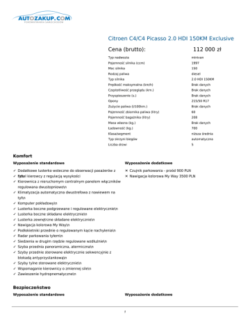 Citroen C4/C4 Picasso 2.0 HDI 150KM Exclusive Cena (brutto): 112 000 zł Typ nadwozia minivan Pojemność silnika (ccm) 1997 Moc silnika 150 Rodzaj paliwa diesel Typ silnika 2.0 HDI 150KM Prędkość maksymalna (km/h) Brak danych Częstotliwość przeglądu (km.) Brak danych Przyspieszenie (s.) Brak danych Opony 215/50 R17 Zużycie paliwa (l/100km.) Brak danych Pojemność zbiornika paliwa (litry) 60 Pojemność bagażnika (litry) 208 Masa własna (kg.) Brak danych Ładowność (kg.) 700 Klasa/segment niższa średnia Typ skrzyni biegów automatyczna Liczba drzwi 5 Komfort Wyposażenie standardowe Wyposażenie dodatkowe ✓ Dodatkowe lusterko wsteczne do obserwacji pasażerów z ✕ Czujnik parkowania - przód 900 PLN ✓ Fotel tyłu kierowcy z regulacją wysykości ✕ Nawigacja kolorowa My Way 3500 PLN ✓ Kierownica z nieruchomym centralnym panelem włączników regulowana dwustopniowo\n ✓ Klimatyzacja automatyczna dwustrefowa z nawiewem na tył\n ✓ Komputer pokładowy\n ✓ Lusterka boczne podgrzewane i regulowane elektrycznie\n ✓ Lusterka boczne składane elektrycznie\n ✓ Lusterka zewnętrzne składane elektrycznie\n ✓ Nawigacja kolorowa My Way\n ✓ Podłokietniki przednie o regulowanym kącie nachylenia\n ✓ Radar parkowania tyłem\n ✓ Siedzenia w drugim rzędzie regulowane wzdłużnie\n ✓ Szyba przednia panoramiczna, atermiczna\n ✓ Szyby przednie sterowane elektrycznie sekwencyjnie z blokadą antyprzystankową\n ✓ Szyby tylne sterowane elektrycznie\n ✓ Wspomaganie kierownicy o zmiennej sile\n ✓ Zawieszenie hydropnematyczne\n Bezpieczeństwo Wyposażenie standardowe Wyposażenie dodatkowe 1 ✓ ABS ✕ Reflektory Bi - ksenonowe kierunkowe 3800 PLN ✓ ASR - system kontroli momentu obrotowego\n ✓ Automatyczne włączanie świateł awaryjnych\n ✓ Blokada drzwi tylnych zabezpieczająca przed otwarciem przez dzieci\n ✓ EBD - system rozdzielania siły hamowania\n ✓ Elektryczny hamulec postojowy\n ✓ ESP - system stabilizacji toru jazdy\n ✓ Kurtyny powietrzne (z przodu i z tyłu)\n ✓ Pasy bezpieczeństwa przednie z podwójnymi napinaczami pirotechnicznymi i ogranicznikami napięcia\n ✓ Poduszki powietrzne boczne\n ✓ Poduszki powietrzne dla kierowcy i pasażera\n ✓ Reflektory przeciwmgielne\n ✓ Trzy mocowania ISOFIX\n ✓ Trzypunktowe pasy bezpieczeństwa z tyłu\n ✓ Wyłącznik przedniej poduszki pasażera\n Dodatki Wyposażenie standardowe Wyposażenie dodatkowe ✓ Automatyczne światła i wycieraczki ✕ Alarm 1100 PLN ✓ Gniazdko zasilania 12V z tyłu ✕ Belki dachowe poprzeczne 682 PLN ✓ Kieszenie w oparciach przednich foteli ✕ DVD/VCD 7900 PLN ✓ Klamki zewnętrzne w kolorze nadwozia ✕ Przeszklony dach 3900 PLN ✓ Konsola pomiędzy fotelami zawierająca dwa uchwyty na napoje, zapalniczkę, gniazdko 12V\n ✓ Korek wlewu paliwa otwierany automatycznie przyciskiem z wnętrza pojazdu\n ✓ Koło zapasowe pełnowymiarowe\n ✓ Lakier metalizowany\n ✓ Lampka w bagażniku\n ✓ Lampki pod lusterkami przednimi\n ✓ Lusterka boczne dwukolorowe (czarny matowy + kolor nadwozia)\n ✓ Obręcze aluminiowe 17"\n ✓ Padding w przednich drzwiach\n ✓ Pakiet Look\n ✓ Pokrywa bagażnika z otwieraną oddzielnie szybą\n ✓ Radio CD z MP3\n ✓ Regulator i ogranicznik prędkości\n ✓ Rozpylacz zapachów\n ✓ Schowek lewy i prawy w górnej części deski rozdzielczej\n ✓ Schowek lewy i prawy w podłodze w drugim rzędzie\n ✓ Schowek w bagażniku\n ✓ Składane stoliki w tylnej części oparć przednich siedzeń\n ✓ Szeroki tylny spojler dachowy z trzecim światłem stop\n ✓ Sztywna pokrywa bagażnika\n ✓ 2 Szyby w lusterkach bocznych przyciemnione\n 3 ✓ Zapalniczka i popielniczka przenośna\n Doprecyzowanie oferty Kontakt: Nazwa użytkownika: admin Nazwa firmy: qqq Adres: qqq 12, 41-706 qqq1, NIP: 954 REGON: 1 Telefon: 123, 1 Fax: 1 Email: 1 www: 4