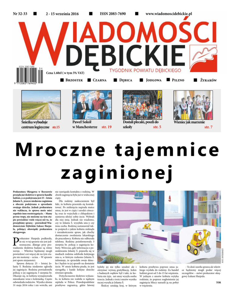 Nr 32-33 ISSN 2083-7690 2 - 15 września 2016 www.wiadomoscidebickie.pl Cena 1.60zł ( w tym 5% VAT) Brzostek Śnieżka wybuduje centrum logisyczne str.15 Czarna Paweł Sokół w Manchesterze str. 19 Dębica Jodłowa Dostali plecaki, poszli do szkoły str. 5 Pilzno Żyraków Wieniec jak marzenie str. 7 Prokuratura Okręgowa w Rzeszowie przejęła już śledztwo w sprawie handlu ludźmi, o co podejrzana jest 25 – letnia Jolanta Ś., jeszcze niedawno zaginiona a obecnie podejrzana o sprzedanie swojego dziecka. Jednak prokuratura nie wyklucza, że sprawa może mieć zupełnie inne rozstrzygnięcie. – Mamy pewne tropy, nie możemy na tym etapie powiedzieć wiele więcej niż to, że przejęliśmy sprawę – powiedział Wiadomościom Dębickim Łukasz Harpula, pełniący obowiązki prokuratora okręgowego. P rokurator Harpula podkreśla, że nic w tej sprawie nie jest jednoznaczne, dlatego przy prowadzeniu śledztwa badane są różne wersje. – Wkrótce będziemy mogli powiedzieć coś więcej ale na tym etapie nie możemy – ucina. – W sprawie jest sporo niejasności. Sprawa dotyczy 25 – letniej Jolanty Ś. Rodzina niedawno zgłosiła jej zaginięcie. Rodzina powiadomiła policję o jej zaginięciu 3 sierpnia br. Okazuje się, że kobieta wynajmowała mieszkanie wraz z koleżanką. Często odwiedzała rodziców. Wyszła z domu 31 maja 2016 roku i nie wróciła, ani nie nawiązała kontaktu z rodziną. W chwili zaginięcia była już w widocznej ciąży. Dla rodziny zaskoczeniem był fakt, że kobieta przestała się kontaktować. Po zniknięciu napisała matce smsa, że jest w ciąży i urodzi córeczkę oraz że wyjechała z chłopakiem i zamierza ułożyć sobie życie. Wybrali dla niej imię. Jednak nie wiadomo, czy to Jolanta Ś. wysyłała sms-y czy inna osoba. Rodzinę zastanawiał także pośpiech z jakim kobieta zniknęła i niezakończenie spraw, jak choćby dostarczenie zwolnienia lekarskiego do pracodawcy. Kobieta nie odbierała telefonu. Rodzina poinformowała 3 sierpnia br. policję o zaginięciu kobiety. Wówczas, gdy informacja o poszukiwaniu Jolanty Ś. pojawiła się w mediach rodzina odebrała kolejnego sms-a, w którym rzekomo Jolanta Ś. informuje, że sprzedała swoje dziecko i będzie to jej sposób na dostatnie życie. W smsie kobieta pisała, że jest surogatką i każde kolejne dziecko również sprzeda. Dotychczasowe śledztwo wykazało, że kobieta nie rodziła w żądnym szpitalu w Polsce. Prawdopodobnie przebywa zagranicą, gdzie łatwiej FOT. INTERNET Mroczne tajemnice zaginionej byłoby jej nie tylko urodzić ale i otrzymać wyższą gratyfikację. Jeden z badanych wątków był i taki, że kobieta nie żyje, zaś smsy wysyła osoba trzecia. Jednak z treści smsów wynika raczej wysyła je Jolanta Ś. Śledczy ustalają kraj, w którym kobieta przebywa poprzez smsa jakiego wysłała do rodziny. Za handel ludźmi grozi od 3 do 15 lat więzienia. W jednym z smsów kobieta wytyka rodzinie, że poprzez nagłośnienie jej zaginięcia bliscy narazili ją na pobyt w więzieniu. - To dość zawiła sprawa ale wkrótce będziemy mogli podać więcej szczegółów – mówi prokurator okręgowy Łukasz Harpula. TOR D ruga strona 2 Walczyli z obowiązku, nie przymusu Uroczystości upamiętniające 72 rocznicę akcji „Burza” i stoczonej tutaj w 1944 roku największej bitwy partyzanckiej w południowo-wschodniej Polsce, żołnierzy Armii Krajowej z oddziałami Wermachtu odbyły się 28 sierpnia na polanie Kałużówka. Miejski Ośrodek Kultury zaprezentował ofertę edukacyjno-artystyczną na rok 2016 / 2017. W placówkach MOK -u można dołączyć do działających już grup. J G ośćmi specjalnymi uroczystości byli uczestnicy bitwy w 1944 roku: Bronisław Duman (Szczecin), Jerzy Krusensetern (Kraków) oraz dzieci Adama Lazarowicza „Klamry”: córka Danuta Iwan i mjr. Zbigniew Lazarowicz, uczestnik bitwy na Kałużówce (Wrocław). W uroczystościach na polanie wzięło udział kilkuset mieszkańców ziemi dębickiej, władze miejskie, powiatowe, gminne i przedstawiciele organizacji kombatanckich, harcerze, przedstawiciele Związku Strzeleckiego „Strzelec”, delegacje szkół i organizacji pozarządowych oraz stowarzyszeń. Rozpoczęcie uroczystości na polanie Kałużówka poprzedziło złożenie kwiatów przed pomnikiem w Artystycznie wyedukują Braciejowej upamiętniającym żołnierzy Armii Krajowej i ludność cywilną z parafii Gumniska, która w wyniku walk w latach 1944 – 1945 straciła życie. Wiązanki kwiatów złożyli prezes ŚZŻAK Środowiska 5. Pułku Strzelców Konnych AK w Dębicy kpt. Izabela Podhalańska i mjr Zbigniew Lazarowicz. Uroczystości na polanie rozpoczęły się mszą świętą, której przewodniczył i wygłosił podczas niej homilię ks. Jan Michalik, emerytowany proboszcz w parafii w Podgrodziu. FOT. URZĄD MIEJSKI Asystę honorową podczas uroczystości pełniła kompania 16. Tczewskiego Batalionu Saperów z Niska, która po odczytaniu apelu poległych oddała salwę honorową. Czas bitwy i wydarzeń toczących się na polanie Kałużówka wspominał w swoim wystąpieniu jej uczestnik 91-letni mjr Zbigniew Lazarowicz. - Wydarzenia tamtych dni tak mocno tkwią w pamięci uczestników, że śnić się nam będą do końca życia – mówił do zgromadzonych mjr Zbigniew Lazarowicz, którego wystąpienie zostało nagrodzone gromkimi brawami i odśpiewaniem „Sto lat”. - Mimo ran, cierpień, śmierci kolegów, głodu i chwil trwogi czuliśmy się wówczas szczęśliwi i dumni, że mogliśmy po raz pierwszy, po latach niewoli podnieść głowy i stanąć razem do otwartej walki ze śmiertelnym wrogiem. Czyniliśmy to z wielkim zaangażowaniem, bez przymusu, z obowiązku służenia ojczyźnie. Na zakończenie uroczystości delegacje złożyły kwiaty u stóp pomnika na Kałużówce. UM edną z tych placówek jest Dom Kultury i Kino „Kosmos” przy ul. I. Lisa 3, tel. 14 696 91 40, e-mail: [email protected]. Dział