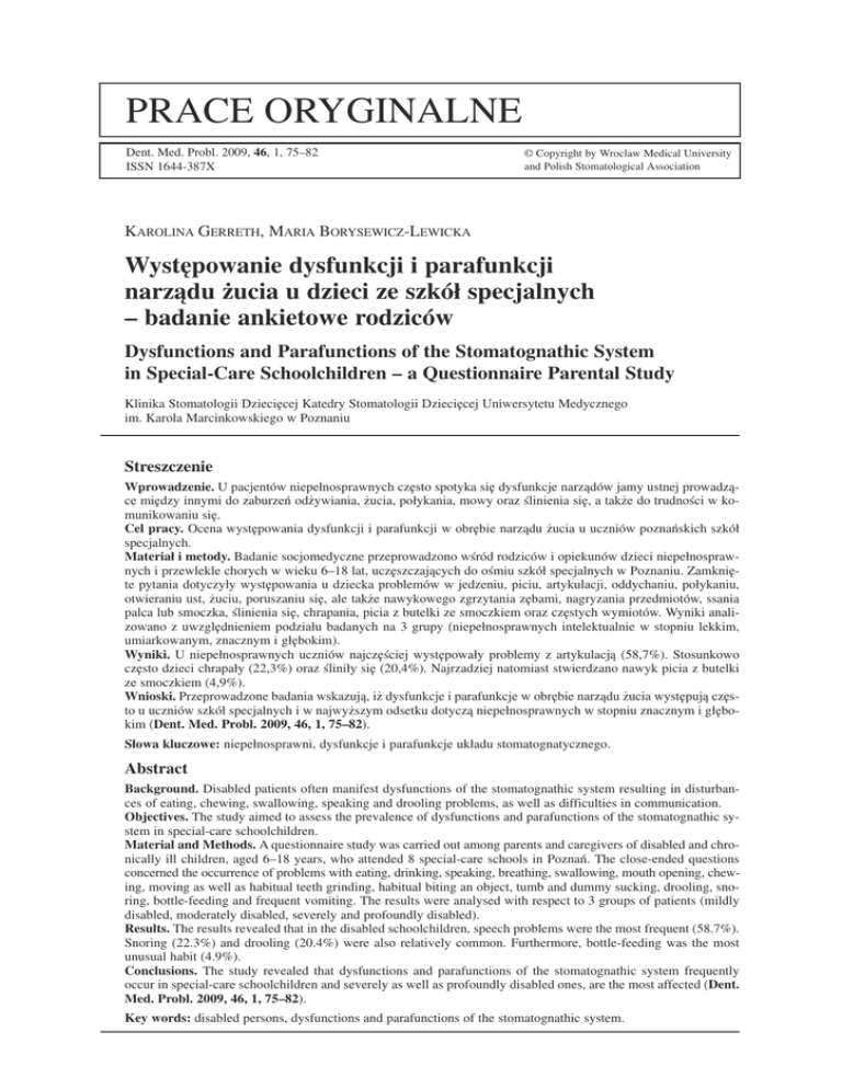 PRACE ORYGINALNE Dent. Med. Probl. 2009, 46, 1, 75–82 ISSN 1644−387X © Copyright by Wroclaw Medical University and Polish Stomatological Association KAROLINA GERRETH, MARIA BORYSEWICZ−LEWICKA Występowanie dysfunkcji i parafunkcji narządu żucia u dzieci ze szkół specjalnych – badanie ankietowe rodziców Dysfunctions and Parafunctions of the Stomatognathic System in Special−Care Schoolchildren – a Questionnaire Parental Study Klinika Stomatologii Dziecięcej Katedry Stomatologii Dziecięcej Uniwersytetu Medycznego im. Karola Marcinkowskiego w Poznaniu Streszczenie Wprowadzenie. U pacjentów niepełnosprawnych często spotyka się dysfunkcje narządów jamy ustnej prowadzą− ce między innymi do zaburzeń odżywiania, żucia, połykania, mowy oraz ślinienia się, a także do trudności w ko− munikowaniu się. Cel pracy. Ocena występowania dysfunkcji i parafunkcji w obrębie narządu żucia u uczniów poznańskich szkół specjalnych. Materiał i metody. Badanie socjomedyczne przeprowadzono wśród rodziców i opiekunów dzieci niepełnospraw− nych i przewlekle chorych w wieku 6–18 lat, uczęszczających do ośmiu szkół specjalnych w Poznaniu. Zamknię− te pytania dotyczyły występowania u dziecka problemów w jedzeniu, piciu, artykulacji, oddychaniu, połykaniu, otwieraniu ust, żuciu, poruszaniu się, ale także nawykowego zgrzytania zębami, nagryzania przedmiotów, ssania palca lub smoczka, ślinienia się, chrapania, picia z butelki ze smoczkiem oraz częstych wymiotów. Wyniki anali− zowano z uwzględnieniem podziału badanych na 3 grupy (niepełnosprawnych intelektualnie w stopniu lekkim, umiarkowanym, znacznym i głębokim). Wyniki. U niepełnosprawnych uczniów najczęściej występowały problemy z artykulacją (58,7%). Stosunkowo często dzieci chrapały (22,3%) oraz śliniły się (20,4%). Najrzadziej natomiast stwierdzano nawyk picia z butelki ze smoczkiem (4,9%). Wnioski. Przeprowadzone badania wskazują, iż dysfunkcje i parafunkcje w obrębie narządu żucia występują częs− to u uczniów szkół specjalnych i w najwyższym odsetku dotyczą niepełnosprawnych w stopniu znacznym i głębo− kim (Dent. Med. Probl. 2009, 46, 1, 75–82). Słowa kluczowe: niepełnosprawni, dysfunkcje i parafunkcje układu stomatognatycznego. Abstract Background. Disabled patients often manifest dysfunctions of the stomatognathic system resulting in disturban− ces of eating, chewing, swallowing, speaking and drooling problems, as well as difficulties in communication. Objectives. The study aimed to assess the prevalence of dysfunctions and parafunctions of the stomatognathic sy− stem in special−care schoolchildren. Material and Methods. A questionnaire study was carried out among parents and caregivers of disabled and chro− nically ill children, aged 6–18 years, who attended 8 special−care schools in Poznań. The close−ended questions concerned the occurrence of problems with eating, drinking, speaking, breathing, swallowing, mouth opening, chew− ing, moving as well as habitual teeth grinding, habitual biting an object, tumb and dummy sucking, drooling, sno− ring, bottle−feeding and frequent vomiting. The results were analysed with respect to 3 groups of patients (mildly disabled, moderately disabled, severely and profoundly disabled). Results. The results revealed that in the disabled schoolchildren, speech problems were the most frequent (58.7%). Snoring (22.3%) and drooling (20.4%) were also relatively common. Furthermore, bottle−feeding was the most unusual habit (4.9%). Conclusions. The study revealed that dysfunctions and parafunctions of the stomatognathic system frequently occur in special−care schoolchildren and severely as well as profoundly disabled ones, are the most affected (Dent. Med. Probl. 2009, 46, 1, 75–82). Key words: disabled persons, dysfunctions and parafunctions of the stomatognathic system. 76 K. GERRETH, M. BORYSEWICZ−LEWICKA U pacjentów niepełnosprawnych, oprócz choro− by podstawowej, często spotyka się dysfunkcje na− rządów jamy ustnej prowadzące do zaburzeń odży− wiania, żucia, połykania, mowy oraz ślinienia się, a także do problemów w komunikowaniu się [1]. Wiąże się to z występowaniem wad zgryzu, chorób zębów, przyzębia i błony śluzowej jamy ustnej. Dys− funkcje warg i języka oraz spotykane stosunkowo często zaburzenia we wzroście szczęki i żuchwy prowadzą u wielu niepełnosprawnych do powstania dysproporcji między rozmiarami kości szczęk oraz zaburzeń okluzji [2]. Jest to przyczyną częstszego występowania wad zgryzu w tej grupie pacjentów w porównaniu z ogólnie zdrowymi, o czym donoszą dane z piśmiennictwa [2, 3]. Dodatkowymi czynni− kami są występujące nawyki, takie jak: ssanie palca, oddychanie przez usta oraz tłoczenie języka, a także słabszy rozwój mięśni [4–6]. Nieprawidłowa czyn− ność mięśni, występująca m.in. u pacjentów z dzie− cięcym porażeniem mózgowym, prowadzi do upoś− ledzenia połykania zarówno śliny, jak i płynów, ale także uniemożliwia żucie twardych pokarmów [7, 8]. U pacjentów atetotycznych lub z komponentą spa− styczną można natomiast zaobserwować ruchy mi− mowolne zaciskania lub zgrzytania, co przyczynia się do patologicznego starcia zębów lub występowa− nia zaburzeń w obrębie stawu skroniowo−żuchwo− wego (ryc. 1). Oddychanie przez usta sprzyja po− wstawaniu stanów zapalnych błony śluzowej jamy ustnej oraz pośrednio występowaniu próchnicy zę− bów [7, 8] (ryc. 2). Należy zatem założyć, że pacjenci niepełno− sprawni, u których występują zaburzenia w obrę− bie narządu żucia wymagają postępowania profi− laktycznego, leczniczego oraz rehabilitacyjnego już we wczesnym okresie rozwojowym z udziałem specjalistów z różnych dziedzin medycyny. Celem pracy była ocena występowania dys− funkcji i parafunkcji w obrębie narządu żucia u ucz
