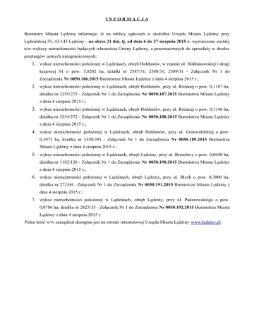 INFORMACJA Burmistrz Miasta Lędziny informuje, iż na tablicy ogłoszeń w siedzibie Urzędu Miasta Lędziny przy Lędzińskiej 55, 43-143 Lędziny - na okres 21 dni, tj. od dnia 6 do 27 sierpnia 2015 r. wywieszone zostały n/w wykazy nieruchomości będących własnością Gminy Lędziny, a przeznaczonych do sprzedaży w drodze przetargów ustnych nieograniczonych: 1. wykaz nieruchomości położonej w Lędzinach, obręb Hołdunów, w rejonie ul. Hołdunowskiej i drogi krajowej S1 o pow. 5,8282 ha, działki nr 2587/31, 2588/31, 2589/31 - Załącznik Nr 1 do Zarządzenia Nr 0050.186.2015 Burmistrza Miasta Lędziny z dnia 4 sierpnia 2015 r.; 2. wykaz nieruchomości położonej w Lędzinach, obręb Hołdunów, przy ul. Różanej o pow. 0,1187 ha, działka nr 3255/272 - Załącznik Nr 1 do Zarządzenia Nr 0050.187.2015 Burmistrza Miasta Lędziny z dnia 4 sierpnia 2015 r.; 3. wykaz nieruchomości położonej w Lędzinach, obręb Hołdunów, przy ul. Różanej o pow. 0,1146 ha, działka nr 3254/272 - Załącznik Nr 1 do Zarządzenia Nr 0050.188.2015 Burmistrza Miasta Lędziny z dnia 4 sierpnia 2015 r.; 4. wykaz nieruchomości położonej w Lędzinach, obręb Hołdunów, przy ul. Grunwaldzkiej o pow. 0,1073 ha, działka nr 3350/291 - Załącznik Nr 1 do Zarządzenia Nr 0050.189.2015 Burmistrza Miasta Lędziny z dnia 4 sierpnia 2015 r.; 5. wykaz nieruchomości położonej w Lędzinach, obręb Lędziny, przy ul. Brzechwy o pow. 0,0650 ha, działka nr 1182/128 - Załącznik Nr 1 do Zarządzenia Nr 0050.190.2015 Burmistrza Miasta Lędziny z dnia 4 sierpnia 2015 r.; 6. wykaz nieruchomości położonej w Lędzinach, obręb Lędziny, przy ul. Blych o pow. 0,3800 ha, działka nr 272/64 - Załącznik Nr 1 do Zarządzenia Nr 0050.191.2015 Burmistrza Miasta Lędziny z dnia 4 sierpnia 2015 r.; 7. wykaz nieruchomości położonej w Lędzinach, obręb Lędziny, przy ul. Paderewskiego o pow. 0,0786 ha, działka nr 2823/35 - Załącznik Nr 1 do Zarządzenia Nr 0050.192.2015 Burmistrza Miasta Lędziny z dnia 4 sierpnia 2015 r. Pełna treść w/w zarządzeń dostępna jest na stronie internetowej Urzędu Miasta Lędziny www.ledziny.pl.