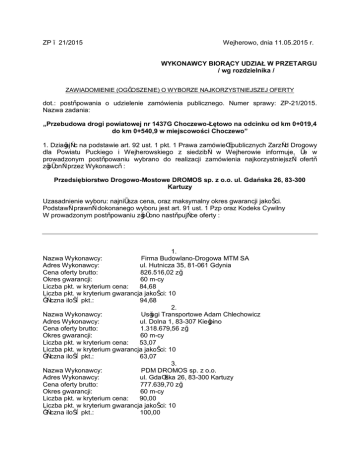 ZP – 21/2015 Wejherowo, dnia 11.05.2015 r. WYKONAWCY BIORĄCY UDZIAŁ W PRZETARGU / wg rozdzielnika / ZAWIADOMIENIE (OGŁOSZENIE) O WYBORZE NAJKORZYSTNIEJSZEJ OFERTY dot.: postępowania o udzielenie zamówienia publicznego. Numer sprawy: ZP-21/2015. Nazwa zadania: „Przebudowa drogi powiatowej nr 1437G Choczewo-Łętowo na odcinku od km 0+019,4 do km 0+540,9 w miejscowości Choczewo” 1. Działając na podstawie art. 92 ust. 1 pkt. 1 Prawa zamówień publicznych Zarząd Drogowy dla Powiatu Puckiego i Wejherowskiego z siedzibą w Wejherowie informuje, że w prowadzonym postępowaniu wybrano do realizacji zamówienia najkorzystniejszą ofertę złożoną przez Wykonawcę : Przedsiębiorstwo Drogowo-Mostowe DROMOS sp. z o.o. ul. Gdańska 26, 83-300 Kartuzy Uzasadnienie wyboru: najniższa cena, oraz maksymalny okres gwarancji jakości. Podstawą prawną dokonanego wyboru jest art. 91 ust. 1 Pzp oraz Kodeks Cywilny W prowadzonym postępowaniu złożono następujące oferty : 1. Nazwa Wykonawcy: Firma Budowlano-Drogowa MTM SA Adres Wykonawcy: ul. Hutnicza 35, 81-061 Gdynia Cena oferty brutto: 826.516,02 zł Okres gwarancji: 60 m-cy Liczba pkt. w kryterium cena: 84,68 Liczba pkt. w kryterium gwarancja jakości: 10 Łączna ilość pkt.: 94,68 2. Nazwa Wykonawcy: Usługi Transportowe Adam Chlechowicz Adres Wykonawcy: ul. Dolna 1, 83-307 Kiełpino Cena oferty brutto: 1.318.679,56 zł Okres gwarancji: 60 m-cy Liczba pkt. w kryterium cena: 53,07 Liczba pkt. w kryterium gwarancja jakości: 10 Łączna ilość pkt.: 63,07 3. Nazwa Wykonawcy: PDM DROMOS sp. z o.o. Adres Wykonawcy: ul. Gdańska 26, 83-300 Kartuzy Cena oferty brutto: 777.639,70 zł Okres gwarancji: 60 m-cy Liczba pkt. w kryterium cena: 90,00 Liczba pkt. w kryterium gwarancja jakości: 10 Łączna ilość pkt.: 100,00 4. Nazwa Wykonawcy: Przedsiębiorstwo Budowlane Wisław Wójcik Adres Wykonawcy: ul. Pionierów 10, 84-300 Lębork Cena oferty brutto: 848.085,00 zł Okres gwarancji: 60 m-ce Liczba pkt. w kryterium cena: 82,54 Liczba pkt. w kryterium gwarancja jakości: 10,00 Łączna ilość pkt.: 92,54 5. Nazwa Wykonawcy: Konsorcjum Firm: Kruszywo sp. z o.o. oraz E.Wicka Adres Wykonawcy: ul. Długa 4B, 84-223 Linia Cena oferty brutto: 800.211,49 zł Okres gwarancji: 56 m-cy Liczba pkt. w kryterium cena: 97,46 Liczba pkt. w kryterium gwarancja jakości: 9,33 Łączna ilość pkt.: 96,79 2. Działając na podstawie art. 92 ust. 1 pkt. 2 Prawa Zamówień Publicznych Zamawiający informuje, że w prowadzonym postępowaniu nie została odrzucona żadna oferta. 3. Działając na podstawie art. 92 ust. 1 pkt. 3 Prawa zamówień publicznych Zamawiający informuje, że w prowadzonym postępowaniu nie został wykluczony żaden z Wykonawców. 4. Działając na podstawie art. 92 ust. 1 pkt. 4 Prawa Zamówień Publicznych Zamawiający informuje, że podpisanie umowy z wyłonionym wykonawcą możliwe będzie po dopełnieniu wszelkich formalności po upływie 5 dni od dnia przesłania niniejszego zawiadomienia o wyborze najkorzystniejszej oferty. Informacje dotyczące środków ochrony prawnej znajdują się w Specyfikacji istotnych warunków zamówienia oraz w Dziale VI Prawa zamówień publicznych „Środki ochrony prawnej”, art. od 179 do 198 Dz. U. z 2013 r. poz. 907 ze zm. Prosimy o niezwłoczne potwierdzenie otrzymania niniejszego faxu na nr 58 774-32-93 Otrzymują : 1. 2. 3. 4. 5. 7. Firma Budowlano-Drogowa MTM SA, ul. Hutnicza 35, 81-061 Gdynia Usługi Transportowe Adam Chlechowicz ul. Dolna 1, 83-307 Kiełpino PDM Dromos sp. z o.o., ul. Gdańska 26, 83-300 Kartuzy, Przedsiębiorstwo Budowlane Wiesław Wójcik, ul. Pionierów 10, 84-300 Lębork Kruszywo sp. z o.o., ul. Długa 4B, 84-223 Linia a/a