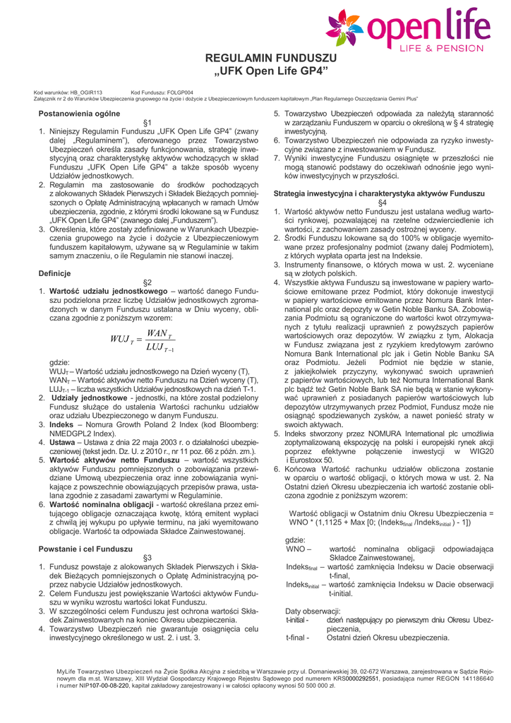 REGULAMIN FUNDUSZU „UFK Open Life GP4” Kod warunków: HB_OGIR113 Kod Funduszu: FOLGP004 Załącznik nr 2 do Warunków Ubezpieczenia grupowego na Ŝycie i doŜycie z Ubezpieczeniowym funduszem kapitałowym „Plan Regularnego Oszczędzania Gemini Plus” Postanowienia ogólne §1 1. Niniejszy Regulamin Funduszu „UFK Open Life GP4” (zwany dalej „Regulaminem”), oferowanego przez Towarzystwo Ubezpieczeń określa zasady funkcjonowania, strategię inwestycyjną oraz charakterystykę aktywów wchodzących w skład Funduszu „UFK Open Life GP4” a takŜe sposób wyceny Udziałów jednostkowych. 2. Regulamin ma zastosowanie do środków pochodzących z alokowanych Składek Pierwszych i Składek BieŜących pomniejszonych o Opłatę Administracyjną wpłacanych w ramach Umów ubezpieczenia, zgodnie, z którymi środki lokowane są w Fundusz „UFK Open Life GP4” (zwanego dalej „Funduszem”). 3. Określenia, które zostały zdefiniowane w Warunkach Ubezpieczenia grupowego na Ŝycie i doŜycie z Ubezpieczeniowym funduszem kapitałowym, uŜywane są w Regulaminie w takim samym znaczeniu, o ile Regulamin nie stanowi inaczej. Definicje §2 1. Wartość udziału jednostkowego – wartość danego Funduszu podzielona przez liczbę Udziałów jednostkowych zgromadzonych w danym Funduszu ustalana w Dniu wyceny, obliczana zgodnie z poniŜszym wzorem: WUJ T = 2. 3. 4. 5. 6. WAN T LUJ T −1 gdzie: WUJT – Wartość udziału jednostkowego na Dzień wyceny (T), WANT – Wartość aktywów netto Funduszu na Dzień wyceny (T), LUJT-1 – liczba wszystkich Udziałów jednostkowych na dzień T-1. Udziały jednostkowe - jednostki, na które został podzielony Fundusz słuŜące do ustalenia Wartości rachunku udziałów oraz udziału Ubezpieczonego w danym Funduszu. Indeks – Nomura Growth Poland 2 Index (kod Bloomberg: NMEDGPL2 Index). Ustawa – Ustawa z dnia 22 maja 2003 r. o działalności ubezpieczeniowej (tekst jedn. Dz. U. z 2010 r., nr 11 poz. 66 z późn. zm.). Wartość aktywów netto Funduszu – wartość wszystkich aktywów Funduszu pomniejszonych o zobowiązania przewidziane Umową ubezpieczenia oraz inne zobowiązania wynikające z powszechnie obowiązujących przepisów prawa, ustalana zgodnie z zasadami zawartymi w Regulaminie. Wartość nominalna obligacji - wartość określana przez emitującego obligacje oznaczająca kwotę, którą emitent wypłaci z chwilą jej wykupu po upływie terminu, na jaki wyemitowano obligacje. Wartość ta odpowiada Składce Zainwestowanej. Powstanie i cel Funduszu 1. 2. 3. 4. §3 Fundusz powstaje z alokowanych Składek Pierwszych i Składek BieŜących pomniejszonych o Opłatę Administracyjną poprzez nabycie Udziałów jednostkowych. Celem Funduszu jest powiększanie Wartości aktywów Funduszu w wyniku wzrostu wartości lokat Funduszu. W szczególności celem Funduszu jest ochrona wartości Składek Zainwestowanych na koniec Okresu ubezpieczenia. Towarzystwo Ubezpieczeń nie gwarantuje osiągnięcia celu inwestycyjnego określonego w ust. 2. i ust. 3. 5. Towarzystwo Ubezpieczeń odpowiada za naleŜytą staranność w zarządzaniu Funduszem w oparciu o określoną w § 4 strategię inwestycyjną. 6. Towarzystwo Ubezpieczeń nie odpowiada za ryzyko inwestycyjne związane z inwestowaniem w Fundusz. 7. Wyniki inwestycyjne Funduszu osiągnięte w przeszłości nie mogą stanowić podstawy do oczekiwań odnośnie jego wyników inwestycyjnych w przyszłości. Strategia inwestycyjna i charakterystyka aktywów Funduszu §4 1. Wartość aktywów netto Funduszu jest ustalana według wartości rynkowej, pozwalającej na rzetelne odzwierciedlenie ich wartości, z zachowaniem zasady ostroŜnej wyceny. 2. Środki Funduszu lokowane są do 100% w obligacje wyemitowane przez profesjonalny podmiot (zwany dalej Podmiotem), z których wypłata oparta jest na Indeksie. 3. Instrumenty finansowe, o których mowa w ust. 2. wyceniane są w złotych polskich. 4. Wszystkie aktywa Funduszu są inwestowane w papiery wartościowe emitowane przez Podmiot, który dokonuje inwestycji w papiery wartościowe emitowane przez Nomura Bank International plc oraz depozyty w Getin Noble Banku SA. Zobowiązania Podmiotu są ograniczone do wartości kwot otrzymywanych z tytułu realizacji uprawnień z powyŜszych papierów wartościowych oraz depozytów. W związku z tym, Alokacja w Fundusz związana jest z ryzykiem kredytowym zarówno Nomura Bank International plc jak i Getin Noble Banku SA oraz Podmiotu. JeŜeli Podmiot nie będzie w stanie, z jakiejkolwiek przyczyny, wykonywać swoich uprawnień z papierów wartościowych, lub teŜ Nomura International Bank plc bądź teŜ Getin Noble Bank SA nie będą w stanie wykonywać uprawnień z posiadanych papierów wartościowych lub depozytów utrzymywanych przez Podmiot, Fundusz moŜe nie osiągnąć spodziewanych zysków, a nawet ponieść straty w swoich aktywach. 5. Indeks stworzony przez NOMURA International plc umoŜliwia zoptymalizowaną ekspozycję na polski i europejski rynek akcji poprzez efektywne połączenie inwestycji w WIG20 i Eurostoxx 50. 6. Końcowa Wartość rachunku udziałów obliczona zostanie w oparciu o wartość obligacji, o których mowa w ust. 2. Na Ostatni dzień Okresu ubezpieczenia ich wartość zostanie obliczona zgodnie z poniŜszym wzorem: Wartość obligacji w Ostatnim dniu Okresu Ubezpieczenia = WNO * (1,1125 + Max [0; (Indeksfinal /Indeksinitial ) - 1]) gdzie: WNO – wartość nominalna obligacji odpowiadająca Składce Zainwestowanej, Indeksfinal – wartość zamknięcia Indeksu w Dacie obserwacji t-final, Indeksinitial – wartość zamknięcia Indeksu w Dacie obserwacji t-initial. Daty obserwacji: t-initial dzień następujący po pierwszym dniu Okresu Ubezpieczenia, t-final Ostatni dzień Okresu ubezpieczenia. MyLife Towarzystwo Ubezpieczeń na śycie Spółka Akcyjna z siedzibą w Warszawie przy ul. Domaniewskiej 39, 02-672 Warszawa, zarejestrowana w Sądzie Rejonowym dla m.st. Warszawy, XIII Wyd