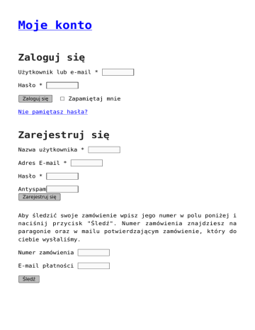 Moje konto Zaloguj się Użytkownik lub e-mail * Hasło * Zaloguj się Zapamiętaj mnie Nie pamiętasz hasła? Zarejestruj się Nazwa użytkownika * Adres E-mail * Hasło * Antyspam Zarejestruj się Aby śledzić swoje zamówienie wpisz jego numer w polu poniżej i naciśnij przycisk "Śledź". Numer zamówienia znajdziesz na paragonie oraz w mailu potwierdzającym zamówienie, który do ciebie wysłaliśmy. Numer zamówienia E-mail płatności Śledź