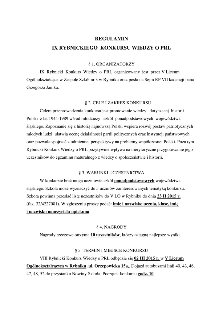 REGULAMIN IX RYBNICKIEGO KONKURSU WIEDZY O PRL § 1. ORGANIZATORZY IX Rybnicki Konkurs Wiedzy o PRL organizowany jest przez V Liceum Ogólnokształcące w Zespole Szkół nr 3 w Rybniku oraz posła na Sejm RP VII kadencji pana Grzegorza Janika. § 2. CELE I ZAKRES KONKURSU Celem przeprowadzenia konkursu jest promowanie wiedzy dotyczącej historii Polski z lat 1944-1989 wśród młodzieży szkół ponadpodstawowych województwa śląskiego. Zapoznanie się z historią najnowszą Polski wspiera rozwój postaw patriotycznych młodych ludzi, ułatwia ocenę działalności partii politycznych oraz instytucji państwowych oraz pozwala spojrzeć z odmiennej perspektywy na problemy współczesnej Polski. Poza tym Rybnicki Konkurs Wiedzy o PRL pozytywnie wpływa na merytoryczne przygotowanie jego uczestników do egzaminu maturalnego z wiedzy o społeczeństwie i historii. § 3. WARUNKI UCZESTNICTWA W konkursie brać mogą uczniowie szkół ponadpodstawowych województwa śląskiego. Szkoła może wyznaczyć do 5 uczniów zainteresowanych tematyką konkursu. Szkoła powinna przesłać listę uczestników do V LO w Rybniku do dnia 23 II 2015 r. (fax. 32/4227081). W zgłoszeniu proszę podać: imię i nazwisko ucznia, klasę, imię i nazwisko nauczyciela-opiekuna. § 4. NAGRODY Nagrody rzeczowe otrzyma 10 uczestników, którzy osiągną najlepsze wyniki. § 5. TERMIN I MIEJSCE KONKURSU VIII Rybnicki Konkurs Wiedzy o PRL odbędzie się 02 III 2015 r. w V Liceum Ogólnokształcącym w Rybniku ,ul. Orzepowicka 15a,. Dojazd autobusami linii 40, 43, 46, 47, 48, 52 do przystanku Nowiny-Szkoła. Początek konkursu godz. 10. § 6. PRZEBIEG KONKURSU ETAP I Rozwiązanie pisemnego testu. Pięciu najlepszych uczniów przechodzi do etapu II. ETAP II. 1. Zawodnicy odpowiadają na pytania wylosowane przez pozostałych uczestników. Zakres pytań wykorzystujących materiały audio-video może nieco wykraczać poza treść literatury podanej w § 7. 2. Zawodnik z 1 wynikiem losuje pytanie dla zawodnika z 5 wynikiem; zawodnik z 5 wynikiem losuje pytanie dla zawodnika z 4 wynikiem; zawodnik z 4 wynikiem losuje pytanie dla zawodnika z 3 wynikiem, itd. 3. Po 3 turach (łącznie 15 pytań) pozostaje 3 najlepszych zawodników. 4. Zawodnik otrzymuje 3 pkt. za odpowiedź lub 1 pkt w przypadku pomocy w postaci podania trzech wariantów odpowiedzi. 5. W przypadku jednakowej liczby punktów, o ostatecznej kolejności decyduje miejsce z części pisemnej konkursu. 6. Wygrywa zawodnik, który uzyska największą liczbę punktów łącznie w części pisemnej i części ustnej Konkursu. § 7. LITERATURA W tym roku w szczególności polecam lekturę podkreślonych pozycji. − Cenckiewicz S., Długie ramię Moskwy. Wywiad wojskowy Polski Ludowej 1943-91, Zysk i s-ka 2011; − Brzoza Cz., Sowa L.A., Wielka historia Polski, t. 5, Kraków 2003; − Droga do Solidarności. 1975-1980, DSH-ECS-Ośrodek Karta, Warszawa 2010; − Dudek A., Historia polityczna Polski. 1989-2005, Kraków 2007, s. 11-90; − Dudek A., Zblewski Z., Utopia nad Wisłą. Historia Peerelu, Warszawa 2008; − Dudek A., Reglamentowana rewolucja. Rozkład dyktatury komunistycznej w Polsce 1988-1990, Kraków 2009; − Korkuć M., Musiał F., Szarek J. (red.), Po dwóch stronach barykady, Kraków 2007. − Kot W., PRL jak cudnie się żyło, Poznań 2008; − Nowak A. (red.), Historia Polski. Kalendarium dziejów 1943-2009, Kraków 2010; − Paczkowski A., Droga do „mniejszego zła”. Strategia i taktyka obozu władzy lipiec1980-styczeń 1982, Kraków 2002; − Paczkowski A., Wojna polsko-jaruzelska. Stan wojenny w Polsce 13 XII 1981-22 VII 1983, Warszawa 2007; − Paczkowski A., Pół wieku dziejów Polski, Warszawa 2007, s. 87-451; − PRL. Świadkowie. Zeszyty historyczne, cykl dodatków tygodnika Newsweek Polska z lat 2006-2007.