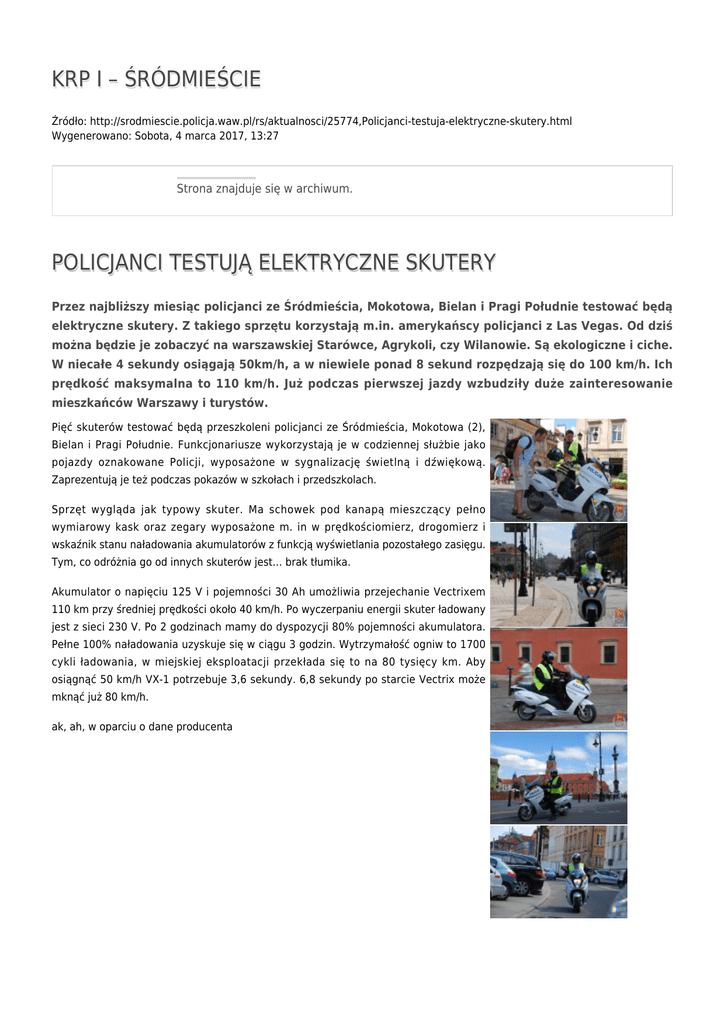 KRP I – ŚRÓDMIEŚCIE Źródło: http://srodmiescie.policja.waw.pl/rs/aktualnosci/25774,Policjanci-testuja-elektryczne-skutery.html Wygenerowano: Sobota, 4 marca 2017, 13:27 Strona znajduje się w archiwum. POLICJANCI TESTUJĄ ELEKTRYCZNE SKUTERY Przez najbliższy miesiąc policjanci ze Śródmieścia, Mokotowa, Bielan i Pragi Południe testować będą elektryczne skutery. Z takiego sprzętu korzystają m.in. amerykańscy policjanci z Las Vegas. Od dziś można będzie je zobaczyć na warszawskiej Starówce, Agrykoli, czy Wilanowie. Są ekologiczne i ciche. W niecałe 4 sekundy osiągają 50km/h, a w niewiele ponad 8 sekund rozpędzają się do 100 km/h. Ich prędkość maksymalna to 110 km/h. Już podczas pierwszej jazdy wzbudziły duże zainteresowanie mieszkańców Warszawy i turystów. Pięć skuterów testować będą przeszkoleni policjanci ze Śródmieścia, Mokotowa (2), Bielan i Pragi Południe. Funkcjonariusze wykorzystają je w codziennej służbie jako pojazdy oznakowane Policji, wyposażone w sygnalizację świetlną i dźwiękową. Zaprezentują je też podczas pokazów w szkołach i przedszkolach. Sprzęt wygląda jak typowy skuter. Ma schowek pod kanapą mieszczący pełno wymiarowy kask oraz zegary wyposażone m. in w prędkościomierz, drogomierz i wskaźnik stanu naładowania akumulatorów z funkcją wyświetlania pozostałego zasięgu. Tym, co odróżnia go od innych skuterów jest… brak tłumika. Akumulator o napięciu 125 V i pojemności 30 Ah umożliwia przejechanie Vectrixem 110 km przy średniej prędkości około 40 km/h. Po wyczerpaniu energii skuter ładowany jest z sieci 230 V. Po 2 godzinach mamy do dyspozycji 80% pojemności akumulatora. Pełne 100% naładowania uzyskuje się w ciągu 3 godzin. Wytrzymałość ogniw to 1700 cykli ładowania, w miejskiej eksploatacji przekłada się to na 80 tysięcy km. Aby osiągnąć 50 km/h VX-1 potrzebuje 3,6 sekundy. 6,8 sekundy po starcie Vectrix może mknąć już 80 km/h. ak, ah, w oparciu o dane producenta Ocena: 0/5 (0) Tweetnij