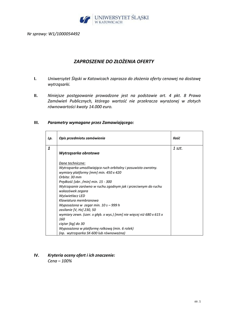 Nr sprawy: W1/1000054492 ZAPROSZENIE DO ZŁOŻENIA OFERTY I. Uniwersytet Śląski w Katowicach zaprasza do złożenia oferty cenowej na dostawę wytrząsarki. II. Niniejsze postępowanie prowadzone jest na podstawie art. 4 pkt. 8 Prawa Zamówień Publicznych, którego wartość nie przekracza wyrażonej w złotych równowartości kwoty 14.000 euro. III. Parametry wymagane przez Zamawiającego: Lp. Opis przedmiotu zamówienia 1 Ilość 1 szt. Wytrząsarka obrotowa Dane techniczne: Wytrząsarka umożliwiająca ruch orbitalny i posuwisto-zwrotny. wymiary platformy [mm] min. 450 x 420 Orbita: 30 mm Prędkość [obr. /min] min. 15 - 300 Wytrząsanie zarówno w ruchu zgodnym jak i przeciwnym do ruchu wskazówek zegara Wyświetlacz LED Klawiatura membranowa Wyposażona w zegar min. 10 s – 999 h zasilanie [V, Hz] 230, 50 wymiary zewn. (szer. x głęb. x wys.) [mm] nie więcej niż 680 x 615 x 160 ciężar [kg] do 30 Wyposażona w platformę rolkową (min. 6 rolek) (np. wytrząsarka SK-600 lub równoważna) IV. Kryteria oceny ofert i ich znaczenie: Cena – 100% str. 1 V. Informacja o Wykonawcy: oświadczeniach i dokumentach, jakie mają dostarczyć 1) Wypełniony i podpisany przez wykonawcę formularz Oferty ( wzór formularza stanowi załącznik nr 1). VI. Miejsce, termin oraz forma składania ofert: 1. Ofertę na formularzu oferty stanowiącym załącznik nr 1, należy przesłać mailowo na adres: [email protected] lub w formie pisemnej na adres: Uniwersytet Śląski, Dział Logistyki, ul. Bankowa 12, 40-007 Katowice, w terminie do dnia 13.11.2013 roku do godziny 09.00 VII. Opis sposobu obliczenia ceny: 1. Na formularzu Oferty należy przedstawić cenę netto i brutto przedmiotu zamówienia oraz kwotę podatku VAT. 2. Wartość oferty należy podać w polskich złotych z dokładnością do dwóch miejsc po przecinku. 3. Cena zawiera wszystkie koszty, w szczególności cenę przedmiotu zamówienia oraz koszt jego dostarczenia i rozładunku. 4. Rozliczenia między Zamawiającym i Wykonawcą będą prowadzone w polskich złotych. 5. Za ofertę najkorzystniejszą uznaje się ofertę z najniższą ceną. VIII. Uwagi końcowe 1. Faktura VAT płatna przelewem w terminie 21 dni od daty otrzymania przez Zamawiającego prawidłowo wystawionej Faktury Vat. 2. Z Oferentem, który zaproponuje najkorzystniejszą ofertę cenową, zgodną z wymaganiami Zamawiającego, zostanie podpisana Umowa w formie pisemnej. 3. Dostawa przedmiotu zamówienia nastąpi w terminie 4 tygodni od daty zawarcia Umowy. 4. Po uzyskaniu informacji o zamiarze sfinalizowania zakupu, Oferent winien w terminie 3 dni dostarczyć do siedziby Zamawiającego oryginał oferty wraz z podpisaną Umową. 5. Oferta winna być podpisana przez osobę upoważnioną do reprezentowania Firmy. 6. Do oferty należy dołączyć opis techniczny urządzenia wraz z podaniem jego typu, modelu i producenta. Załączniki: 1. Wzór formularza oferty 2. Wzór umowy str. 2