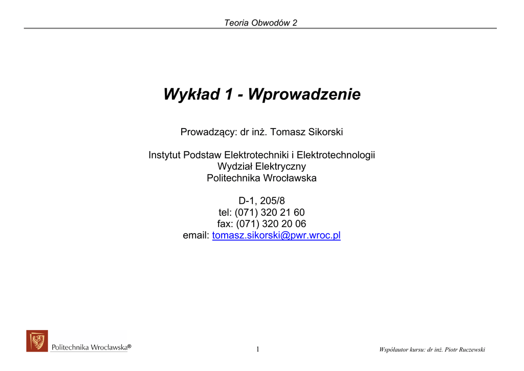 Teoria Obwodów 2 Wykład 1 - Wprowadzenie Prowadzący: dr inż. Tomasz Sikorski Instytut Podstaw Elektrotechniki i Elektrotechnologii Wydział Elektryczny Politechnika Wrocławska D-1, 205/8 tel: (071) 320 21 60 fax: (071) 320 20 06 email: [email protected] ® 1 Współautor kursu: dr inż. Piotr Ruczewski Teoria Obwodów 2 1. Wiadomości organizacyjne ............................................................................................................................................................................................ 3 1.1 Kontakt................................................................................................................................................................................................................... 3 1.2 Zawartość tematyczna wykładu ............................................................................................................................................................................. 4 1.3 Literatura................................................................................................................................................................................................................ 5 1.4 Warunki zaliczenia................................................................................................................................................................................................. 6 2. Stan ustalony a nieustalony pracy obwodu elektrycznego............................................................................................................................................. 7 2.1 Po pierwsze: elementy i charakter obwodu............................................................................................................................................................ 8 2.2 Po drugie: związki prądowo-napięciowe na elementach obwodu oraz prawa Kirchhoffa .................................................................................. 12 2.3 Po trzecie: komutacja oraz prawa komutacji ....................................................................................................................................................... 16 2.4 Przykład wyznaczania warunków początkowych................................................................................................................................................ 20 ® Ruczewski 2 Współautor kursu: dr inż. Piotr Teoria Obwodów 2 1. Wiadomości organizacyjne 1.1 Kontakt Konsultacje Wrocław: p. 205/8/D1 wtorek g.7.30-9.00, czwartek g. 9-11 Legnica: środa g. 12-14. http://eportal.eny.pwr.wroc.pl logowanie: użytkownik: [email protected] hasło: hasło do emailowej studenckiej. skrzynki klucz dostępu do kursu: to2 Forma kursu: wykład (2godziny/tyg.) - EGZAMIN, ćwiczenia (2godziny/tyg.) – ZALICZENIE, laboratorium (1godzina/tyg.) - ZALICZENIE ® 3 Współautor kursu: dr inż. Piotr Ruczewski Teoria Obwodów 2 1.2 Zawartość tematyczna wykładu Stany nieustalone (przejściowe) w obwodach elektrycznych – metoda klasyczna Warunki początkowe w obwodach elektrycznych. Wyznaczanie stanu przejściowego w obwodach elektrycznych z jednym oraz dwoma elementami biernymi (zachowawczymi) przy wymuszeniach stałych oraz sinusoidalnych. Składowa przejściowa i wymuszona (ustalona). Prawa komutacji. Elementy analizy układów w dziedzinie czasu Funkcje uogólnione w zapisie wybranych sygnałów. Splot funkcji. Wyznaczanie splotu funkcji w ograniczonym przedziale. Podstawy teorii transmisji sygnału przez układ liniowy stacjonarnych. Odpowiedź impulsowa i skokowa układu i jej związek z odpowiedzią na dowolne wymuszenie. Całka Duhamla. Transformata Laplace’a i jej zastosowanie w analizie stanów nieustalonych Transformata Laplace’a – definicja, własności. Obliczanie transformaty Laplace’a przy wykorzystaniu własności przekształcenia. Wyznaczanie oryginałów transformaty Laplace’a na podstawie własności przekształcenia oraz metody rozkładu na ułamki proste. Zastosowanie przekształcenia Laplace’a do obliczania stanu przejściowego w obwodach elektrycznych – metoda operatorowa. Transmitancja operatorowa i jej związek z odpowiedzią układu. Zależności pomiędzy odpowiedzią impulsową , skokową oraz transmitancja Szereg Fouriera i jego znaczenie w analizie sygnałów okresowych Szereg Fouriera funkcji okresowych – postać trygonometryczna i zespolona. Wyznaczanie zespolonych i rzeczywistych współczynników Fouriera wybranych sygnałów okresowych. Widmo amplitudowo-fazowe. Przebiegi odkształcone. ® 4 Współautor kursu: dr inż. Piotr Ruczewski Teoria Obwodów 2 Transformata Fouriera oraz analiza widmowa sygnałów nieokresowych Transformata Fouriera – definicja, własności. Wyznaczanie widma amplitudowo-fazowego sygnałów nieokresowych. Transmitancja operatorowa i widmowa. Transmisja sygnałów przez układy liniowestacjonarne z wykorzystaniem trasmitancji widmowej. Związek transmitancji operatorowej i widmowej oraz odpowiedzi impulsowej układów Linia długa Opis matematyczny układów o parametrach rozłożonych. Rozwiązania w stanach ustalonych. Równania linii w zapisie symbolicznym. Impedancja falowa. Tłumienność, przesuwność oraz tamowność falowa. Rozkład napięcia i prądu w linii - fala pierwotna i fala odbita. Fale stojące w linii długiej. Impedancja wejściowa linii długiej. Stan dopasowania falowego. 1.3 Literatura 1. S. Bolkowski - Teoria Obwodów Elektrycznych -WNT 1995 2. S. Osowski, K. Siwek, M. Śmiałek – Teoria obwodów, Oficyna Wydawnicza Politechniki Warszawskiej, 2006. 3. M. Uruski, W. Wolski - Teoria Obwodów t. I, II - skrypt P.Wr. 4. M. Krakowski - Elektrotechnika Teoretyczna - PWN 1979 ; 5. R. Kurdziel - Podstawy Elektrotechniki - WNT 1972 ; 6. J. Osiowski - Zarys Rachunku Operatorowego-teoria i zastosowanie w elektrotechnice -WNT 1981 ; 7. K. Mikołajuk, Z. Trzaska - Elektrotechnika Teoretyczna - PWN 1984 ; 8. J. Os