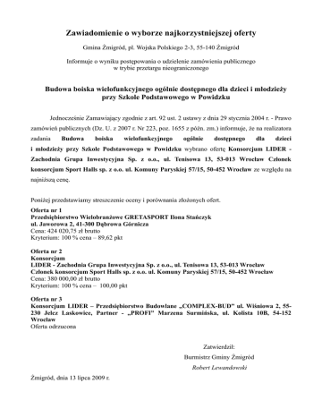 Zawiadomienie o wyborze najkorzystniejszej oferty Gmina Żmigród, pl. Wojska Polskiego 2-3, 55-140 Żmigród Informuje o wyniku postępowania o udzielenie zamówienia publicznego w trybie przetargu nieograniczonego Budowa boiska wielofunkcyjnego ogólnie dostępnego dla dzieci i młodzieży przy Szkole Podstawowego w Powidzku Jednocześnie Zamawiający zgodnie z art. 92 ust. 2 ustawy z dnia 29 stycznia 2004 r. - Prawo zamówień publicznych (Dz. U. z 2007 r. Nr 223, poz. 1655 z późn. zm.) informuje, że na realizatora zadania Budowa boiska wielofunkcyjnego ogólnie dostępnego dla dzieci i młodzieży przy Szkole Podstawowego w Powidzku wybrano ofertę Konsorcjum LIDER Zachodnia Grupa Inwestycyjna Sp. z o.o., ul. Tenisowa 13, 53-013 Wrocław Członek konsorcjum Sport Halls sp. z o.o. ul. Komuny Paryskiej 57/15, 50-452 Wrocław ze względu na najniższą cenę. Poniżej przedstawiamy streszczenie oceny i porównania złożonych ofert. Oferta nr 1 Przedsiębiorstwo Wielobranżowe GRETASPORT Ilona Stańczyk ul. Jaworowa 2, 41-300 Dąbrowa Górnicza Cena: 424 020,75 zł brutto Kryterium: 100 % cena – 89,62 pkt Oferta nr 2 Konsorcjum LIDER - Zachodnia Grupa Inwestycyjna Sp. z o.o., ul. Tenisowa 13, 53-013 Wrocław Członek konsorcjum Sport Halls sp. z o.o. ul. Komuny Paryskiej 57/15, 50-452 Wrocław Cena: 380 000,00 zł brutto Kryterium: 100 % cena – 100,00 pkt Oferta nr 3 Konsorcjum LIDER – Przedsiębiorstwo Budowlane „COMPLEX-BUD” ul. Wiśniowa 2, 55230 Jelcz Laskowice, Partner - „PROFI” Marzena Surmińska, ul. Kolista 10B, 54-152 Wrocław Oferta odrzucona Zatwierdził: Burmistrz Gminy Żmigród Robert Lewandowski Żmigród, dnia 13 lipca 2009 r.
