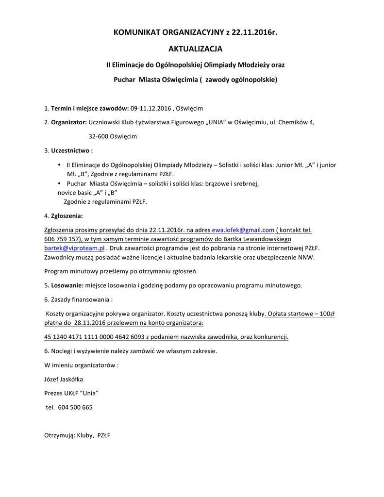 KOMUNIKATORGANIZACYJNYz22.11.2016r. AKTUALIZACJA IIEliminacjedoOgólnopolskiejOlimpiadyMłodzieżyoraz PucharMiastaOświęcimia(zawodyogólnopolskie) 1.Terminimiejscezawodów:09-11.12.2016,Oświęcim 2.Organizator:UczniowskiKlubŁyżwiarstwaFigurowego„UNIA”wOświęcimiu,ul.Chemików4, 32-600Oświęcim 3.Uczestnictwo: • IIEliminacjedoOgólnopolskiejOlimpiadyMłodzieży–Solistkiisoliściklas:JuniorMł.„A”ijunior Mł.„B”,ZgodniezregulaminamiPZŁF. • PucharMiastaOświęcimia–solistkiisoliściklas:brązoweisrebrnej, novicebasic„A”i„B” ZgodniezregulaminamiPZŁF. 4.Zgłoszenia: Zgłoszeniaprosimyprzesyłać[email protected](kontakttel. 606759157),wtymsamymterminiezawartośćprogramówdoBartkaLewandowskiego [email protected]ściprogramówjestdopobranianastronieinternetowejPZŁF. ZawodnicymusząposiadaćważnelicencjeiaktualnebadanialekarskieorazubezpieczenieNNW. Programminutowyprześlemypootrzymaniuzgłoszeń. 5.Losowanie:miejscelosowaniaigodzinępodamypoopracowaniuprogramuminutowego. 6.Zasadyfinansowania: Kosztyorganizacyjnepokrywaorganizator.Kosztyuczestnictwaponosząkluby.Opłatastartowe–100zł płatnado28.11.2016przelewemnakontoorganizatora: 45124041711111000046426093zpodaniemnazwiskazawodnika,orazkonkurencji. 6.Noclegiiwyżywienienależyzamówićwewłasnymzakresie. Wimieniuorganizatorów: JózefJaskółka PrezesUKŁF“Unia” tel.604500665 Otrzymują:Kluby,PZŁF