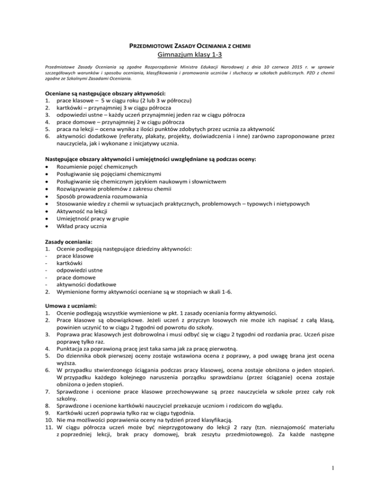 PRZEDMIOTOWE ZASADY OCENIANIA Z CHEMII Gimnazjum klasy 1-3 Przedmiotowe Zasady Oceniania są zgodne Rozporządzenie Ministra Edukacji Narodowej z dnia 10 czerwca 2015 r. w sprawie szczegółowych warunków i sposobu oceniania, klasyfikowania i promowania uczniów i słuchaczy w szkołach publicznych. PZO z chemii zgodne ze Szkolnymi Zasadami Oceniania. Oceniane są następujące obszary aktywności: 1. prace klasowe – 5 w ciągu roku (2 lub 3 w półroczu) 2. kartkówki – przynajmniej 3 w ciągu półrocza 3. odpowiedzi ustne – każdy uczeń przynajmniej jeden raz w ciągu półrocza 4. prace domowe – przynajmniej 2 w ciągu półrocza 5. praca na lekcji – ocena wynika z ilości punktów zdobytych przez ucznia za aktywność 6. aktywności dodatkowe (referaty, plakaty, projekty, doświadczenia i inne) zarówno zaproponowane przez nauczyciela, jak i wykonane z inicjatywy ucznia. Następujące obszary aktywności i umiejętności uwzględniane są podczas oceny: Rozumienie pojęć chemicznych Posługiwanie się pojęciami chemicznymi Posługiwanie się chemicznym językiem naukowym i słownictwem Rozwiązywanie problemów z zakresu chemii Sposób prowadzenia rozumowania Stosowanie wiedzy z chemii w sytuacjach praktycznych, problemowych – typowych i nietypowych Aktywność na lekcji Umiejętność pracy w grupie Wkład pracy ucznia Zasady oceniania: 1. Ocenie podlegają następujące dziedziny aktywności: - prace klasowe - kartkówki - odpowiedzi ustne - prace domowe - aktywności dodatkowe 2. Wymienione formy aktywności oceniane są w stopniach w skali 1-6. Umowa z uczniami: 1. Ocenie podlegają wszystkie wymienione w pkt. 1 zasady oceniania formy aktywności. 2. Prace klasowe są obowiązkowe. Jeżeli uczeń z przyczyn losowych nie może ich napisać z całą klasą, powinien uczynić to w ciągu 2 tygodni od powrotu do szkoły. 3. Poprawa prac klasowych jest dobrowolna i musi odbyć się w ciągu 2 tygodni od rozdania prac. Uczeń pisze poprawę tylko raz. 4. Punktacja za poprawioną pracę jest taka sama jak za pracę pierwotną. 5. Do dziennika obok pierwszej oceny zostaje wstawiona ocena z poprawy, a pod uwagę brana jest ocena wyższa. 6. W przypadku stwierdzonego ściągania podczas pracy klasowej, ocena zostaje obniżona o jeden stopień. W przypadku każdego kolejnego naruszenia porządku sprawdzianu (przez ściąganie) ocena zostaje obniżona o jeden stopień. 7. Sprawdzone i ocenione prace klasowe przechowywane są przez nauczyciela w szkole przez cały rok szkolny. 8. Sprawdzone i ocenione kartkówki nauczyciel przekazuje uczniom i rodzicom do wglądu. 9. Kartkówki uczeń poprawia tylko raz w ciągu tygodnia. 10. Nie ma możliwości poprawienia oceny na tydzień przed klasyfikacją. 11. W ciągu półrocza uczeń może być nieprzygotowany do lekcji 2 razy (tzn. nieznajomość materiału z poprzedniej lekcji, brak pracy domowej, brak zeszytu przedmiotowego). Za każde następne 1 nieprzygotowanie uczeń otrzymuje ocenę niedostateczną. Nieprzygotowanie uczeń zgłasza nauczycielowi na początku lekcji. Kategorie oceniania form aktywności Prace klasowe: 1. Godzinna praca klasowa podsumowuje każdy poznany dział materiału. 2. Praca klasowa zawiera zadanie dodatkowe, na ocenę celującą. 3. Prace klasowe są oceniane następująco: - ocenę niedostateczną (1) – otrzymuje uczeń, który uzyskał 0-30% pkt. - ocenę dopuszczającą (2) – otrzymuje uczeń, który uzyskał 31-55% pkt. - ocenę dostateczną (3) – otrzymuje uczeń, który uzyskał 56-75% pkt. - ocenę dobrą (4) – otrzymuje uczeń, który uzyskał 76-90% pkt. - ocenę bardzo dobrą (5) – otrzymuje uczeń, który uzyskał 91-100% pkt. (powyższą informację należy rozumieć w ten sposób, że podczas układania sprawdzianu procentowy udział punktów z każdego poziomu nauczania odpowiada górnej granicy procentowej) Ocenę celującą otrzymuje uczeń, który uzyskał co najmniej 91% punktów i wykonał zadanie dodatkowe. Kartkówki: 1. Kartkówka obejmuje 1-3 poprzednie tematy i trwa 10-15 minut. 2. Kartkówka nie zawiera zadania dodatkowego na ocenę celującą. 3. Kartkówki są oceniane następująco: - ocenę niedostateczną (1) – otrzymuje uczeń, który uzyskał 0-39% pkt. - ocenę dopuszczającą (2) – otrzymuje uczeń, który uzyskał 40-59% pkt. - ocenę dostateczną (3) – otrzymuje uczeń, który uzyskał 60-79% pkt. - ocenę dobrą (4) – otrzymuje uczeń, który uzyskał 80-94% pkt. - ocenę bardzo dobrą (5) – otrzymuje uczeń, który uzyskał 95-100% pkt. 4. Nauczyciel nie musi podawać uczniom terminu kartkówki. 5. Kartkówka może być zrobiona na początku, w trakcie lub pod koniec lekcji. Może sprawdzać wiedzę z ostatniej lekcji, stopień zrozumienia tematu, pracę domową. Odpowiedzi ustne: 1. Uczeń w ciągu półrocza odpowiada minimum 1 raz. 2. Nauczyciel nie podaje uczniowi terminu odpowiedzi. 3. Odpowiedzi ustne obejmują trzy ostatnie tematy. 4. Podczas odpowiedzi zwraca się uwagę na: znajomość i stosowanie pojęć chemicznych prowadzenie prostych rozumowań chemicznych, posługiwanie się językiem chemicznym. 5. Pytania zadane uczniowi są z różnych poziomów wymagań. Prace domowe: Praca domowa ucznia oceniana jest minimum 2 razy w półroczu. Prace domowe mogą być: krótkoterminowe: z lekcji na lekcję, długoterminowe: referaty, projekty. Aktywności dodatkowe: 1. Obejmują pracę ucznia na lekcji zaangażowanie w tok lekcji, udział w dyskusji, wypowiedzi podczas rozwiązywania problemów, częste zgłaszanie się i udzielanie prawidłowych odpowiedzi, a także rozwiązywanie zadań dodatkowych. 2. Za aktywny udział w lekcji uczeń otrzymuje ocenę bardzo dobrą lub po uzgodnieniu z uczniem dobrą. 3. Praca w grupie - umiejętność komunikowania się i współpracy w zespole, korzystania z różnych źródeł informacji. Praca w grupie w zależności od zaangażowania ucznia może być oceniona "+" bądź stopniem, zgodnie z kryteriam