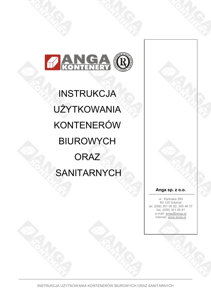 INSTRUKCJA UŻYTKOWANIA KONTENERÓW BIUROWYCH ORAZ SANITARNYCH Anga sp. z o.o. ul. Kartuska 393 80-125 Gdańsk tel. (058) 301 06 82, 305 46 37 fax. (058) 301 06 81 e-mail: [email protected] internet: www.anga.pl INSTRUKCJA UŻYTKOWANIA KONTENERÓW BIUROWYCH ORAZ SANITARNYCH Niniejsza instrukcja opisuje prawidłowy sposób montażu, podłączenia, eksploatacji i konserwacji kontenera. Zamawiający/Użytkownik kontenera jest zobowiązany do przestrzegania wszystkich poniższych zasad pod rygorem utraty gwarancji na dostarczony kontener. POSADOWIENIE KONTENERA 1. Kontener należy posadowić na równym i stabilnym podłożu, np. podmurówka lub ułożone bloczki betonowe, trylinki, płyty jumbo lub inne umożliwiające postawienie na nich kontenera. 2. Posadowienie dla kontenerów o długości zewnętrznej wynoszącej 6 metrów powinno posiadać co najmniej 6 punktów podporowych zgodnie z poniższym schematem. W przypadku dłuższych kontenerów ilość punktów oparcia należy zwiększyć do 8. 6058 2438 3. Minimalna powierzchnia stopy podparcia winna wynosić 20x20 cm. Rozmiar i głębokość fundamentu powinien być dopasowany do miejscowych właściwości podłoża 4. Waga pojedynczego kontenera o wymiarach 6x2,4 metra wynosi w przybliżeniu 2,5 tony. 5. Kontenery można maksymalnie piętrzyć do jednego piętra. 6. Odprowadzenie wody deszczowej następuje poprzez rynny zabudowane w słupkach narożnych kontenera. Ze względu na specyfikę systemu należy uwzględnić to podczas przygotowywania ewentualnego fundamentu (posadowienia). Okresowo należy oczyszczać rynny, aby zapobiec ich zapchaniu, co może spowodować gromadzenie się wody na dachu kontenera. PODNOSZENIE KONTENERA 1. Podnoszenie kontenera możliwe jest przy pomocy dźwigu / samochodu HDS. Kontenery wyposażone są w 4 otwory zaczepowe umiejscowione w górnych narożnikach kontenerów. Należy zachować kąt 0 co najmniej 60 pomiędzy liną zawiesia, a linią horyzontalną. 2. W kontenerach wyposażonych w dodatkowe zaczepy (uszy) należy podnosić kontener za pomocą tychże zaczepów. 3. W przypadku kontenerów wyposażonych w kieszenie możliwe jest podnoszenie za pomocą wózka widłowego o odpowiednim rozstawie wideł (rozstaw wideł zgodny ze specyfikacją techniczną kontenera). Zabrania się podnoszenia kontenera za pomocą wózka widłowego w przypadku gdy kontener nie posiada kieszeni. 4. Zabrania się podnoszenia kontenerów biurowych za pomocą wózków typu „Spreader”. PODŁĄCZENIE KONTENERA DO INSTALACJI ELEKTRYCZNEJ 1. Podłączenie kontenera do zewnętrznej sieci zasilenia może być przeprowadzone jedynie przez uprawnioną do tego celu osobę. 2. Przed podłączeniem do sieci zasilania niskiego napięcia odłączyć wszystkie odbiorniki elektryczne i wykonać uziemienie. 3. Przed pierwszym uruchomieniem kontenera (zestawu kontenerów) należy sprawdzić skuteczność zabezpieczeń przed usterkami. Powinna tego dokonać uprawniona osoba za pomocą przeznaczonych do tego celu przyrządów. INSTRUKCJA UŻYTKOWANIA KONTENERÓW BIUROWYCH ORAZ SANITARNYCH 2/3 PODŁĄCZENIE KONTENERA DO INSTALACJI WODNO-KANALIZACYJNEJ 1. Po ustawieniu kontenerów na fundamencie należy wykonać podłączenie przewodu instalacji wodnej. W przypadku ciśnienia powyżej 5 Bar musi zostać zainstalowany reduktor ciśnienia. Podłączenie winno zostać wykonane przez uprawnioną do tego celu osobę. 2. Osoba wykonująca podłączenie wodne zobowiązana jest do przepłukania rury zasilającej, aby nie wprowadzić do instalacji wewnętrznej kontenera zanieczyszczeń, które mogą spowodować wadliwą pracę lub uszkodzenie armatury i urządzeń sanitarnych. 3. Po dokonaniu podłączenia instalacji wodnej należy ponownie sprawdzić szczelność całej instalacji (w celu usunięcia ewentualnych rozszczelnień powstałych np. w czasie transportu). 4. W przypadku gdy kontener nie będzie użytkowany przez dłuższy czas, 0 a w szczególności w czasie gdy temperatura zewnętrzna powietrza wynosi poniżej 0 C i kontener nie jest stale ogrzewany, należy spuścić wodę z całego układu i zabezpieczyć syfony przed mrozem. 5. Zabrania się transportu kontenera bez uprzedniego spuszczenia wody z całego układu, a w szczególności bojlera. UŻYTKOWANIE KONTENERA 1. Kontener należy użytkować zgodnie z jego przeznaczeniem. 2. Czyszczenie kontenera może być przeprowadzone jedynie za pomocą środków czyszczących pozbawionych kwasu i rozcieńczalnika (nie czyścić strumieniem wody). 3. W celu uniknięcia kondensacji wody oraz wynikających z tego szkód, należy regularnie wietrzyć kontenery. Względna wilgotność powietrza wewnątrz kontenera nie może przekroczyć 60%. 2 2 4. Maksymalne obciążenie podłogi wynosi 200kg/m w kontenerze posadowionym na podłożu,150kg/m w przypadku kontenera posadowionego na piętrze. 5. W przypadku obfitych opadów śniegu należy usuwać śnieg z dachu kontenera. 6. Należy zapewnić ciągłą drożność rynien spustowych (usuwać gromadzące się śmieci, liście, lód; zapewnić dostęp do wlotu oraz wylotu rynien spustowych). 7. Kontenery mogą być wyposażone w urządzenia elektryczne (grzejniki, podgrzewacze wody, bojlery, itp.) różnych producentów. Urządzenia te należy użytkować zgodnie z zaleceniami zawartymi w instrukcjach obsługi tych urządzeń pod rygorem utraty gwarancji. 8. W przypadku uszkodzeń mechanicznych powłoki lakierniczej należy niezwłocznie wykonać zaprawki malarskie, aby uniknąć powstania ognisk korozji. 9. W kontenerach zabrania się : - umieszczenia na grzejnikach jakichkolwiek przedmiotów, zwłaszcza łatwopalnych (np. suszenie odzieży bezpośrednio na grzejnikach); - palenia tytoniu; - używania niesprawnych technicznie urządzeń elektrycznych i grzewczych; - przechowywanie materiałów łatwopalnych (benzyna, rozpuszczalniki itp.) INSTRUKCJA UŻYTKOWANIA KONTENERÓW BIUROWYCH ORAZ SANITARNYCH 3/3