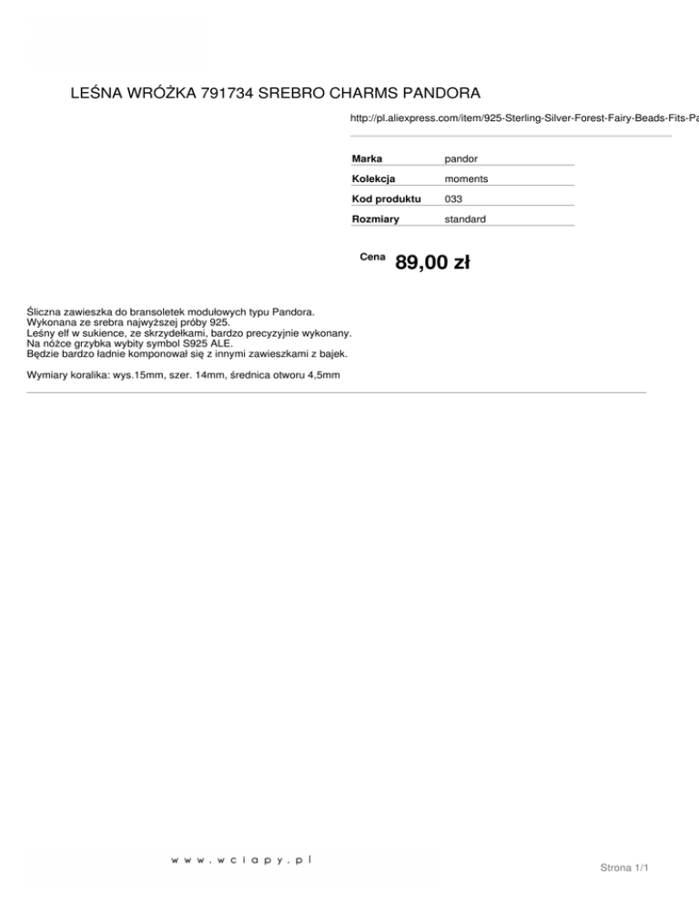 LEŚNA WRÓŻKA 791734 SREBRO CHARMS PANDORA http://pl.aliexpress.com/item/925-Sterling-Silver-Forest-Fairy-Beads-Fits-Pa Marka pandor Kolekcja moments Kod produktu 033 Rozmiary standard Cena 89,00 zł Śliczna zawieszka do bransoletek modułowych typu Pandora. Wykonana ze srebra najwyższej próby 925. Leśny elf w sukience, ze skrzydełkami, bardzo precyzyjnie wykonany. Na nóżce grzybka wybity symbol S925 ALE. Będzie bardzo ładnie komponował się z innymi zawieszkami z bajek. Wymiary koralika: wys.15mm, szer. 14mm, średnica otworu 4,5mm Strona 1/1
