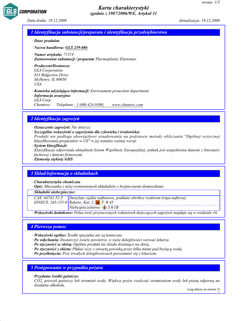 DR strona: 1/5 Karta charakterystyki zgodnie z 1907/2006/WE, Artykuł 31 Data druku: 19.12.2008 Aktualizacja: 19.12.2008 1 Identyfikacja substancji/preparatu i identyfikacja przedsiębiorstwa · Dane produktu · Nazwa handlowa: GLS 259-086 · Numer artykułu: 71314 · Zastosowanie substancji / preparatu Thermoplastic Elastomer · Producent/Dostawca: GLS Corporation 833 Ridgeview Drive McHenry, IL 60050 USA · Komórka udzielająca informacji: Environment protection department. · Informacja awaryjna: GLS Corp Chemtrec: Telephone : 1-800-424-9300, www.chentrec.com 2 Identyfikacja zagrożeń · Oznaczenie zagrożeń: Nie dotyczy. · Szczególne wskazówki o zagrożeniu dla człowieka i środowiska: Produkt nie podlega obowiązkowi oznakowania na podstawie metody obliczania "Ogólnej wytycznej klasyfikowania preparatów w UE" w jej ostatnio ważnej wersji. · System klasyfikacji: Klasyfikacja odpowiada aktualnym listom Wspólnoty Europejskiej, jednak jest uzupełniona danymi z literatury fachowej i danymi firmowymi. · Elementy etykiety GHS 3 Skład/informacja o składnikach · Charakterystyka chemiczna · Opis: Mieszanka z niżej wymienionych składników z bezpiecznymi domieszkami. · Składniki niebezpieczne: CAS: 64742-52-5 Destylaty ciężkie naftenowe, poddane obróbce wodorem (ropa naftowa) EINECS: 265-155-0 Rakotw. Kat. 2; T; R 45 Niebezpieczeństwo: 3.6/1B · Wskazówki dodatkowe: Pełna treść przytoczonych wskazówek dotyczących zagrożeń znajduje się w rozdziale 16. 4 Pierwsza pomoc · Wskazówki ogólne: Środki specjalne nie są konieczne. · Po wdychaniu: Dostarczyć świeże powietrze, w razie dolegliwości wezwać lekarza. · Po styczności ze skórą: Ogólnie produkt nie działa drażniąco na skórę. · Po styczności z okiem: Płukać oczy z otwartą powieką przez kilka minut pod bieżącą wodą. · Po przełknięciu: Przy trwałych dolegliwościach porozumieć się z lekarzem. 5 Postępowanie w przypadku pożaru · Przydatne środki gaśnicze: CO2, proszek gaśniczy lub strumień wody. Większy pożar zwalczać strumieniem wody lub pianą odporną na działanie alkoholu. (ciąg dalszy na stronie 2) PL DR strona: 2/5 Karta charakterystyki zgodnie z 1907/2006/WE, Artykuł 31 Data druku: 19.12.2008 Aktualizacja: 19.12.2008 Nazwa handlowa: GLS 259-086 (ciąg dalszy od strony 1) · Szczególne zagrożenie ze strony materiału, produktów jego spalania lub powstających gazów: Przy ogrzewaniu lub w wypadku pożaru tworzenie się trujących gazów. · Specjalne wyposażenie ochronne: Nosić urządzenie ochrony dróg oddechowych niezależnie od powietrza otoczenia. Założyć urządzenie ochrony dróg oddechowych. 6 Postępowanie w przypadku niezamierzonego uwolnienia do środowiska · Środki ostrożności dostosowane do danej osoby: Założyć urządzenie ochrony dróg oddechowych. · Środki ochrony środowiska: Nie dopuścić do przeniknięcia do kanalizacji /wód powierzchniowych /wód gruntowych. · Metoda oczyszczania/ wchłaniania: Zadbać o wystarczające przewietrzenie. · Wskazówki dodatkowe: Nie powstają żadne materiały niebezpieczne. 7 Postępowanie z substancją/preparatem i jej/jego magazynowanie · Sposób obchodzenia się: · Wskazówki dla bezpiecznego użytkowania: Środki specjalne nie są konieczne. Zadbać o dobry nawiew /odsysanie w miejscu pracy. · Wskazówki dla ochrony przeciwpożarowej i przeciwwybuchowej: Przedsięwziąć środki przeciwko naładowaniom elektrostatycznym. Mieć w pogotowiu przyrządy do ochrony dróg oddechowych. · Składowanie: · Wymagania w stosunku do pomieszczeń składowych i zbiorników: Brak szczególnych wymagań. · Wskazówki odnośnie wspólnego składowania: Nie składować w styczności ze środkami utleniającymi. Nie składować wspólnie z materiałami oksydującymi i kwaśnymi. · Dalsze wskazówki odnośnie warunków składowania: Brak. 8 Kontrola narażenia i środki ochrony indywidualnej · Dodatkowe wskazówki dla wykonania urządzeń technicznych: Brak dalszych danych, patrz punkt 7. · Składniki wraz z kontrolowanymi wartościami granicznymi zależnymi od miejsca pracy: Produkt nie zawiera znaczących ilości materiałów, których wartości graniczne musiałyby być kontrolowane pod kątem warunków miejsca pracy. · Wskazówki dodatkowe: Podstawą były aktualnie obowiązujące wykazy. · Osobiste wyposażenie ochronne: · Ogólne środki ochrony i higieny: Nie wdychać pyłu/ dymu/ mgły. · Ochrona dróg oddechowych: W przypadku krótkotrwałego lub nieznacznego obciążenia urządzenie filtrujące do oddychania; w przypadku intensywnej lub dłuższej ekspozycji zastosować urządzenie do ochrony dróg oddechowych niezależne od powietrza otoczenia. · Ochrona rąk: Materiał, z którego wykonane są rękawice musi być nieprzepuszczalny i odporny na działanie produktu / substancji / preparatu. Z powodu braku badań nie można podać żadnego zalecenia dotyczącego materiału dla rękawic do ochrony przed produktem / preparatem / mieszaniną substancji chemicznych. Wybór materiału na rękawice ochronne przy uwzględnieniu czasów przebicia, szybkości przenikania i degradacji. (ciąg dalszy na stronie 3) PL DR strona: 3/5 Karta charakterystyki zgodnie z 1907/2006/WE, Artykuł 31 Data druku: 19.12.2008 Aktualizacja: 19.12.2008 Nazwa handlowa: GLS 259-086 (ciąg dalszy od strony 2) · Materiał, z którego wykonane są rękawice Wybór odpowiednich rękawic nie zależy tylko od materiału, lecz także od innych cech jakościowych i zmienia się od producenta do producenta. Ponieważ produkt jest preparatem składającym się z kilku substancji, to odporności materiałów, z których wykonano rękawice nie można wcześniej wyliczyć i dlatego też musi być ona sprawdzona przed zastosowaniem. · Czas penetracji dla materiału, z którego wykonane są rękawice Od producenta rękawic należy uzyskać informację na temat dokładnego czasu przebicia i go przestrzegać. · Ochrona oczu: Nie 