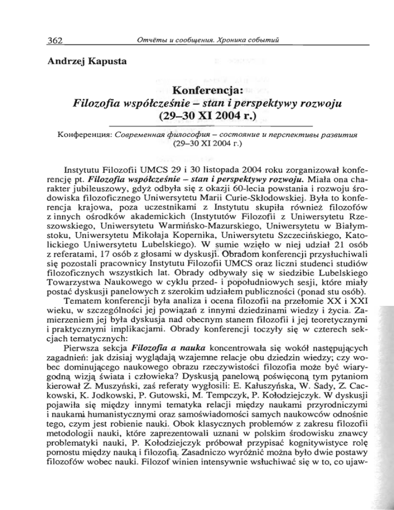 362 Om'lembl u C006lljeHl/JI. XpOHUKa C06blmuii Andrzej Kapusta Konferencja: Filozofia współcześnie - stan i perspektywy rozwoju (29-30 XI 2004 r.) KOH<pepeHUIUI : COBpeMeHHCl5l c/JWlOCOr/JUR - COCmOflHUe u nepCneKmUBbl pa3BumUR (29-30 XI 2004 r.) Instytutu Filozofii UMCS 29 i 30 listopada 2004 roku zorganizował konfept. Filozofia współcześnie - stan i perspektywy rozwoju. Miała ona charakter jubileuszowy, gdyż odbyła się z okazji 60-lecia powstania i rozwoju śro dowiska filozoficznego Uniwersytetu Marii Curie-Skłodowskiej. Była to konferencja krajowa, poza uczestnikami z Instytutu skupiła również filozofów z innych ośrodków akademickich (Instytutów Filozofii z Uniwersytetu Rzeszowskiego, Uniwersytetu Warmińsko-Mazurskiego, Uniwersytetu w Białym stoku, Uniwersytetu Mikołaja Kopernika, Uniwersytetu Szczecińskiego, Katolickiego Uniwersytetu Lubelskiego). W sumie wzięło w niej udział 21 osób z referatami, 17 osób z głosami w dyskusji. Obradom konferencji przysłuchiwali się pozostali pracownicy Instytutu Filozofii UMCS oraz liczni studenci studiów filozoficznych wszystkich lat. Obrady odbywały się w siedzibie Lubelskiego Towarzystwa Naukowego w cyklu przed- i popołudniowych sesji, które miały postać dyskusji panelowych z szerokim udziałem publiczności (ponad stu osób). Tematem konferencji była analiza i ocena filozofii na przełomie XX i XXI wieku, w szczególności jej powiązań z innymi dziedzinami wiedzy i życia. Zamierzeniem jej była dyskusja nad obecnym stanem filozofii i jej teoretycznymi i praktycznymi implikacjami. Obrady konferencji toczyły się w czterech sekcjach tematycznych: Pierwsza sekcja FilozofUl a nauka koncentrowała się wokół następujących zagadnień: jak dzisiaj wyglądają wzajemne relacje obu dziedzin wiedzy; czy wobec dominującego naukowego obrazu rzeczywistości filozofia może być wiarygodną wizją świata i człowieka? Dyskusją panelową poświęconą tym pytaniom kierował Z. Muszyński, zaś referaty wygłosili: E. Kałuszyńska, W. Sady, Z. Cackowski, K. Jodkowski, P. Gutowski, M. Tempczyk, P. Kołodziejczyk. W dyskusji pojawiła się między innymi tematyka relacji między naukami przyrodniczymi i naukami humanistycznymi oraz samoświadomości samych naukowców odnośnie tego, czym jest robienie nauki. Obok klasycznych problemów z zakresu filozofii metodologii nauki, które zaprezentowali uznani w polskim środowisku znawcy problematyki nauki, P. Kołodziejczyk próbował przypisać kognitywistyce rolę pomostu między nauką i filozofią. Zasadniczo wyróżnić można było dwie postawy filozofów wobec nauki. Filozof winien intensywnie wsłuchiwać się w to, co ujawrencję Sprawozdania i komunikaty. Kronika niają wydarzeń 363 naukowcy, bo to oni sami wiedzą, czym jest nauka i wiedza, albo zadanie filozofii dotyczy niejako fundowania podstaw wiedzy naukowej i to jednak filozofowie lepiej wiedzą czym ona jest. W sekcji drugiej zatytułowanej Filozofia a sztuka podjęto kwestie tego, jaki jest status estetyki w obrębie filozofii, kto ma prawo oceniać świat w kategoriach piękna lub brzydoty - filozof czy artysta; czy w świecie masowej kultury jest miejsce dla artysty lub geniusza? Tego rodzaju pytania postawiła w dyskusji panelowej T. Pękala, zaś odpowiadali na nie: T. Szkołut, A. Mordka, A. Kapusta, J. Breczko. W odróżnieniu do sekcji pierwszej tutaj tematyka była bardziej zróżnicowana, tak jakby kanon problemów filozofii nauki był zasadniczo ustabilizowany, natomiast problematyka estetyczna pojawiała się na obrzeżu różnych zagadnieI1 i tematów. Mowa więc była o roli tzw. sztuki wysokiej we współcze snej kulturze masowej (T. Szkołut) . A. Mordka w duchu analiz Ingardena i Hartmanna zastanawiał się nad stosunkiem dzieła sztuki (obrazu) do swej podstawy bytowej. A. Kapusta próbował pokazać związki między współczesnym renesansem różnych form estetyzacji siebie z tzw. narracyjną koncepcją tożsa mości. J. Breczko mówił o tym jak to jedynie literatura i poeci mogą przywrócić twórcze moce współczesnej filozofii . Trzecia sekcja pt. Filozofwa media miała na celu pokazanie możliwości, ale również i konieczności uwzględnienia przez akademicką filozofię nowoczesnych środków wyrazu i komunikacji, postawiono więc pytania: czy wobec zawłaszczania przez media masowej świadomości i opinii publicznej ktoś może jeszcze słuchać filozofa; kto ma decydować i oceniać prawdziwość przekazów medialnych, czy filozofia winna uzupełnić tradycyjny słowny dyskurs o najnowsze narzędzia komunikacji, jakie mogą być jej związki z mediami? Pytanie te postawił M. Hetmański dyskutantom panelu, wśród których byli zawodowi filozofowie, jak również reprezentanci mediów: E. Kochan, S. Symotiuk, A. Zachariasz, P. Wróblewski, P. Zdanowicz, G. JÓzefczuk. Potrzeba filozoficznej refleksji nad specyfiką współczesnych mediów wydaje się dzisiaj szczególnie paląca, ale i również najtrudniejsza, bo dotyczy procesów, których sami jesteśmy czę ścią. Było to szczególnie widoczne w dyskusji, która miejscami toczyła się w kierunku krytyki kulturotwórczej funkcji współczesnych mediów oraz zarzutów wobec filozofii, która zamykając się w swoich akademickich zagadnienia oferuje rodzaj autoprezentacji mało atrakcyjny dla szerokiej publiki. Konferencję kończyła i jednocześnie wieńczyła sekcja zatytułowana Filozofia w Lublinie, która miała na celu (ze względu na jubileuszowy charakter całej konferencji) przedstawienie historii środowiska filozoficznego Uniwersytetu Marii Curie-Skłodowskiej . Stanowi je już parę pokoleń intelektualnych filozofów , którzy od 1944 roku współtworzyli i tworzą do dzisiaj instytucjonalne ramy (katedry, zakłady, instytuty i wydział) filozofii. Omówione zostały sylwetki oraz dorobek naukowy (ilustrowany bogatą dokumentacją fotograficzną) nastę pujących filozofów: N. Łubnickiego, S. Hara