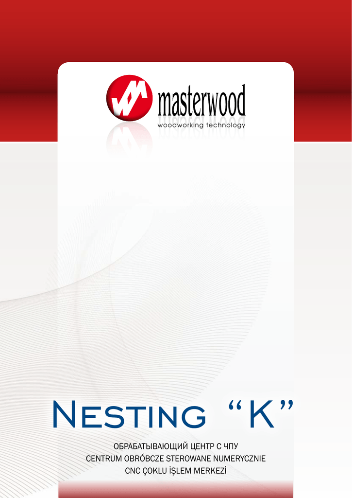 woodworking technology Nesting “K” ОБРАБАТЫВАЮЩИЙ ЦЕНТР С ЧПУ CENTRUM OBRÓBCZE STEROWANE NUMERYCZNIE CNC ÇOKLU İŞLEM MERKEZİ Nesting - Нестинг MW 12.25K MW 15.38K MW 18.38K MW 21.38K 2 Обрабатывающий центр с ЧПУ со специальным матричным столом для выполнения работ по принципу “нестинг”. Centrum obróbcze sterowane numerycznie o dużej wydajności produkcji, ze stołem rowkowanym do obróbki typu “nesting”. woodworking technology Сложнопрофильный матричный стол для крепления деталей любых форм. Универсальность и гибкость работы, максимальное число возможных конфигураций. Stół obróbczy rowkowany do blokowania elementów o dowolnym kształcie. Wszechstronny i elastyczny oferuje zawsze maksymalną konfigurowalność. Kompakt fiberden oluşan oluklu işlem tablası çeşitli formlardaki farklı malzemelerin makine üzerine yerleştirilip, işlenmesi içindir. Yüksek kapasiteli ‘’Nesting’’ işlemleri için kompakt fiberden oluşan oluklu tablalı CNC Çoklu İşlem Merkezleri 3 Z Рабочие зоны и ходы осей Pole robocze i zakresy ruchów osi Çalışma Alanları ve Eksen Strokları Система автоматической фиксации и снятия блокировки детали посредством педального управления. После того как с помощью специальных ручных переключателей были выбраны рабочие участки стола, для загрузки/разгрузки детали эти переключатели больше не нужны (опц.). System automatycznego blokowania i odblokowania panelu za pomocą pedału. Po wybraniu aktywnej części stołu za pomocą odpowiednich przełączników ręcznych, nie ma więcej potrzeby działania na nie podczas operacji załadunku/rozładunku (opcja). Kontrol pedalı vasıtasıyla makine üstündeki çalışılacak malzemenin otomatik olarak tutulması ve serbest bırakılması sağlanır. Manuel olarak tabladaki işlem alanları etkin edildikten sonra, yükleme ve boşaltma işlemleri tekrar işlem alanları aktivite edilmeden gerçekleşir. ( Opsiyonel ) ; 1 3 < ; ; 2 4 < P < 4 n 5 MW 21.38K woodworking technology Magazyn do automatycznej wymiany narzędzi. Uchwyty stożki ISO 30 Panel Boşaltma Ünitesi : İşlenmiş parçaları makine üzerinden otomatik olarak sıyrırken aynı anda çalışma tablasını temizleyerek makinenin tablasını yeni işlenecek malzeme için hazır hale getirir. (Opsiyonel) MW 15.38K Otomatik Takım Değiştirme için Takım Magazini. ISO 30 bağlantı aparatları. Вспомогательное разгрузочное устройство: позволяет выталкивать обработанные детали с рабочего стола, который затем очищается при помощи “пылесоса” (опц.) Urządzenie pomocnicze do rozładowania obrobionych elementów ze stołu maszyny i jego oczyszczenia (opcja). MW 18.38K Магазин инструмента для автоматической смены инструмента. Патрон ISO 30. Сверлильная голова с независемыми шпинделями для вертикального сверления (опц.) Автоматическое устройство для измерения длины инструмента (опц). Głowica wiercąca z wrzecionami niezależnymi (opcja). Urządzenie do automatycznego ustawiania długości narzędzia (opcja). Dikey Delik İşlemleri için Delik Grubu. (Opsiyonel) X Y Z n P MW 15.38K MW 18.38K MW 12.25K MW 12.25K Otomatik Takım Boyu Ölçüm Cihazı (Opsiyonel) MW 21.38K мм-mm дюймы-in-cale футы-ft-stopy мм-mm дюймы-in-cale футы-ft-stopy мм-mm дюймы-in-cale футы-ft-stopy мм-mm дюймы-in-cale футы-ft-stopy 2500 1250 145 98,4 49,2 5,7 8 9 kW ISO 30 8 4 - 3800 1550 145 149,6 61,0 5,7 10 9 kW ISO 30 12 3800 1850 145 149,6 72,8 5,7 12 9 kW ISO 30 12 3800 2100 145 149,6 82,7 5,7 14 9 kW ISO 30 12 5 - 6 - 7 - 6 Программное обеспечение - Software - Yazılım Masternest Пакет программ для автоматической оптимизации расположения обрабатываемых элементов одной детали на рабочем столе Software do automatycznej optymalizacji rozmieszczenia elementów, przeznaczonych do wycięcia z jednego panelu. İşlenecek bir panel üzerinde yapılacak işlemlerde, yapılacak olan işin malzeme ebatları içerisine sığdırılmasını sağlayan optimizasyon yazılımı paketi. ЧПУ с ПК (стандарт) •17” цветной монитор •оперативная система Windows •коммуникационная плата (сети) Masterwork Ethernet Sterownik numeryczny z PC (standard) CAD •Monitor kolorowy 17” •System operacyjny Windows •Karta Ethernet do podłączenia sieciowego Numerik Kontrol •17 inç renkli video •Windows •Ethernet Kardı Графическое программирование сверления, фрезерования, пиления и оптимизация цикла сверления. Создание параметрических профилей и чертежей. Настройка конфигурации инструмента (Настройка станка Редактор инструментов). Базовые графические макросы для выполнения простых и сложных программ. Графическая визуализация обрабатываемых поверхностей. Импо