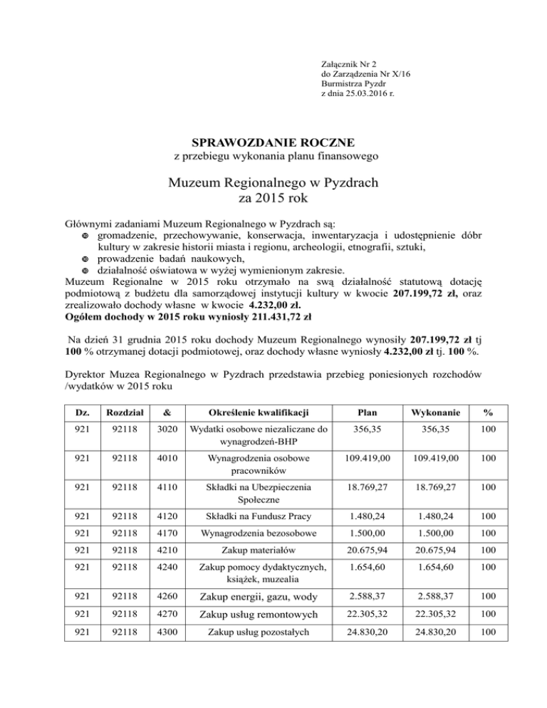 Załącznik Nr 2 do Zarządzenia Nr X/16 Burmistrza Pyzdr z dnia 25.03.2016 r. SPRAWOZDANIE ROCZNE z przebiegu wykonania planu finansowego Muzeum Regionalnego w Pyzdrach za 2015 rok Głównymi zadaniami Muzeum Regionalnego w Pyzdrach są: gromadzenie, przechowywanie, konserwacja, inwentaryzacja i udostępnienie dóbr kultury w zakresie historii miasta i regionu, archeologii, etnografii, sztuki, prowadzenie badań naukowych, działalność oświatowa w wyżej wymienionym zakresie. Muzeum Regionalne w 2015 roku otrzymało na swą działalność statutową dotację podmiotową z budżetu dla samorządowej instytucji kultury w kwocie 207.199,72 zł, oraz zrealizowało dochody własne w kwocie 4.232,00 zł. Ogółem dochody w 2015 roku wyniosły 211.431,72 zł Na dzień 31 grudnia 2015 roku dochody Muzeum Regionalnego wynosiły 207.199,72 zł tj 100 % otrzymanej dotacji podmiotowej, oraz dochody własne wyniosły 4.232,00 zł tj. 100 %. Dyrektor Muzea Regionalnego w Pyzdrach przedstawia przebieg poniesionych rozchodów /wydatków w 2015 roku Dz. Rozdział & Określenie kwalifikacji Plan Wykonanie % 921 92118 3020 Wydatki osobowe niezaliczane do wynagrodzeń-BHP 356,35 356,35 100 921 92118 4010 Wynagrodzenia osobowe pracowników 109.419,00 109.419,00 100 921 92118 4110 Składki na Ubezpieczenia Społeczne 18.769,27 18.769,27 100 921 92118 4120 Składki na Fundusz Pracy 1.480,24 1.480,24 100 921 92118 4170 Wynagrodzenia bezosobowe 1.500,00 1.500,00 100 921 92118 4210 Zakup materiałów 20.675,94 20.675,94 100 921 92118 4240 Zakup pomocy dydaktycznych, książek, muzealia 1.654,60 1.654,60 100 921 92118 4260 Zakup energii, gazu, wody 2.588,37 2.588,37 100 921 92118 4270 Zakup usług remontowych 22.305,32 22.305,32 100 921 92118 4300 Zakup usług pozostałych 24.830,20 24.830,20 100 Dz. Rozdział & Określenie kwalifikacji Plan Wykonanie % 921 92118 4360 Zakup usług telekomunikacyjnych 836,04 836,04 100 921 92118 4410 Podróże służbowe krajowe 1.178,42 1.178,42 100 921 92118 4430 Ubezpieczenia mienia,różne Opłaty 2.556,18 2.556,18 100 921 92118 4440 Odpisy na ZFŚS 3.281,79 3.281,79 100 OGÓŁEM: 211.431,72 211.431,72 Dyrektor Muzeum Regionalnego w Pyzdrach informuje, że na dzień 31 grudnia 2015 roku powstały zobowiązania na ogólną kwotę 972,30 zł, są to zobowiązanie niewymagalne. Termin płatności tych zobowiązań przypada na styczeń i luty 2016 roku. Nie powstały żadne należności. I. Informacja ogólna W okresie sprawozdawczym w muzeum pracę wykonywały na pełnym etacie następujące osoby; Robert Michał Czerniak – dyrektor muzeum, Ilona Jagielska zatrudniona na stanowisku adiunkta, archeolog. Krzysztof Kołodziejczyk – pracownik techniczny będący do dyspozycji zarówno dla Muzeum jak i Biblioteki i CKSiP. II. Działalność Muzeum 1. Prace związane z organizacją i działalnością muzeum 1.1 W dniu 31 grudnia 2015 r. zawarta została umowa użyczenia dla celów muzealnych pomieszczeń wschodniego skrzydła dawnego klasztoru pomiędzy Gminą i Miastem Pyzdry a Muzeum Regionalnym Ziemi Pyzdrskiej. Umowa zawarta na czas nieokreślony. 1.2 Od roku 2013 prowadzone są działania związane z konserwacją fresków z tzw. kaplicy gotyckiej w krużgankach klasztornych. Poprzez kontakt z Zakładem Konserwacji Wydziału Sztuk Pięknych Uniwersytetu Mikołaja Kopernika w Toruniu przy dużym zaangażowaniu p. prof. Ewy Roznerskiej- Świerczewskiej udało się rozpocząć prace przy zabytkowych freskach w Pyzdrach. Z powodu śmierci p. Ewy nadzór nad studentami (4 osoby) przejął p. prof. Mariusz Markowski. Właścicielem tej części krużganków jest parafia p.w. Narodzenia NMP w Pyzdrach. Z tego powodu aby prace te mogły być prowadzone pod kierunkiem Muzeum w Pyzdrach konieczne było uzyskanie ze strony Parafii stosownego Pełnomocnictwa. W dniu 31grudnia 2015 zawarta została umowa użyczenia krużganków pomiędzy Parafią Narodzenia NMP w Pyzdrach a Muzeum Ziemi Pyzdrskiej. Umowę zawarto na okres 5 lat. 1.3 Udział w pracach przygotowawczych organizacji Szlaku Piastowskiego. Udział, wraz z burmistrzem Pyzdr w spotkaniu w organizowanym przez Starostwo Powiatowe w Gnieźnie 2 w sprawie podpisania umów finansujących organizację Szlaku Piastowskiego oraz organizację nowej formy działania, którym jest Klaster Szlak Piastowski /19 III, 04 XI, 04 XII/. W grudniu dyrektor muzeum odbył szkolenie związane z funkcjonowaniem Szlaku Piastowskiego. 1.4 Organizacja i prace związane z adaptacją budynku podcieniowego na cele muzealne. W ramach działań LGD „Z Nami Warto” w dniu 05.02.2014 r. został złożony wniosek (znak sprawy UM15-6930-UM1540088/14) o przyznanie pomocy w zakresie małych projektów w ramach działania 413 Wdrażanie lokalnych strategii rozwoju objętego PROW na lata 20072013, dotyczący operacji: „Remont dachu budynku dawnej piekarni z zabytkowego zespołu Domu Podcieniowego w Pyzdrach”. Wniosek o dofinansowanie prac został odrzucony przez Urząd Marszałkowski. Podstawą do odrzucenia – po ostatnich poprawkach- było to, że adaptowany na cele kulturalne obiekt ma zapis w karcie zabytku jako budynek mieszkalny co według przepisów nie pozwala takich budynków dotować(?!). Również starania o pozyskanie dofinansowania z puli środków Ministerstwa Kultury i Dziedzictwa Narodowego zakończyły się niepowodzeniem. W marcu br. rozstrzygnięto „konkurs” na dofinansowanie zadań związanych z ochroną zabytków. Odwołanie się od decyzji konkursowych zakończyło się niepowodzeniem. W październiku br. Muzeum złożyło ponownie wniosek do Ministerstwa Kultury i Dziedzictwa Narodowego w sprawie udzielenia dofinansowania do prac przy domu podcieniowym w Pyzdrach. 1.5 W lipcu br. Muzeum przystąpiło jako partner do przygotowywanego przez Wielkopolską Organizację Turystyczną projektu związanego z adaptacją zabytkowych obiektów na cele związane z organizacją Szlaku Piastowskiego. 2. Działalność kolekcjonerska muzeum W okre