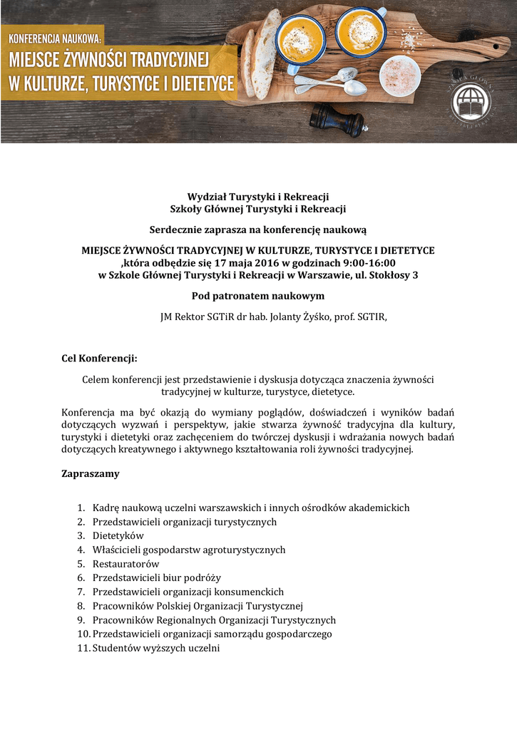 Wydział Turystyki i Rekreacji Szkoły Głównej Turystyki i Rekreacji Serdecznie zaprasza na konferencję naukową MIEJSCE ŻYWNOŚCI TRADYCYJNEJ W KULTURZE, TURYSTYCE I DIETETYCE ,która odbędzie się 17 maja 2016 w godzinach 9:00-16:00 w Szkole Głównej Turystyki i Rekreacji w Warszawie, ul. Stokłosy 3 Pod patronatem naukowym JM Rektor SGTiR dr hab. Jolanty Żyśko, prof. SGTIR, Cel Konferencji: Celem konferencji jest przedstawienie i dyskusja dotycząca znaczenia żywności tradycyjnej w kulturze, turystyce, dietetyce. Konferencja ma być okazją do wymiany poglądów, doświadczeń i wyników badań dotyczących wyzwań i perspektyw, jakie stwarza żywność tradycyjna dla kultury, turystyki i dietetyki oraz zachęceniem do twórczej dyskusji i wdrażania nowych badań dotyczących kreatywnego i aktywnego kształtowania roli żywności tradycyjnej. Zapraszamy 1. Kadrę naukową uczelni warszawskich i innych ośrodków akademickich 2. Przedstawicieli organizacji turystycznych 3. Dietetyków 4. Właścicieli gospodarstw agroturystycznych 5. Restauratorów 6. Przedstawicieli biur podróży 7. Przedstawicieli organizacji konsumenckich 8. Pracowników Polskiej Organizacji Turystycznej 9. Pracowników Regionalnych Organizacji Turystycznych 10. Przedstawicieli organizacji samorządu gospodarczego 11. Studentów wyższych uczelni WYBRANE OBSZARY TEMATYCZNE Obszar I. – żywność w kulturze i tradycji Współczesne określenie żywności tradycyjnej Kulturowe uwarunkowania produktów kulinarnych Obrzędowość tradycyjna związana z żywnością Kulinaria jako dziedzictwo kulturowe Kuchnie regionalne i kulinarne produkty lokalne Obszar II. – Żywność w turystyce Żywność tradycyjna, jako atrakcja turystyczna Szlaki kulinarne, elementem uatrakcyjniającym ofertę turystyczną Żywność tradycyjna w gastronomii Ginące zawody związane z produkcją żywności Formy turystyki kulinarnej: biroturystyka, enoturystyka Obszar III. – Prozdrowotne aspekty żywności tradycyjnej Walory zdrowotne żywności tradycyjnej Charakterystyka żywności nieprzetworzonej i przemysłowej Profilaktyka zdrowotna w oparciu o żywność tradycyjną Tradycyjne modele żywieniowe, jako postępowanie dietetyczne PROGRAM KONFERENCJI 9.30 – 10.00 Rejestracja uczestników 10.0 Rozpoczęcie i powitanie gości Referat wprowadzający - Współczesne określenie żywności tradycyjnej Blok I. – Żywność w kulturze i tradycji Kulturowe uwarunkowania produktów kulinarnych Obrzędowość tradycyjna związana z żywnością Kulinaria jako dziedzictwo kulturowe Kuchnie regionalne i kulinarne produkty lokalne Dyskusja 12.00 – 12.30 Przerwa kawowa Blok II. – Żywność w turystyce Żywność tradycyjna, jako atrakcja turystyczna Szlaki kulinarne, elementem uatrakcyjniającym ofertę turystyczną Żywność tradycyjna w gastronomii Ginące zawody związane z produkcją żywności Formy turystyki kulinarnej: biroturystyka, enoturystyka Dyskusja 14.00 0 14.30 – Przerwa na lunch Obszar III. – Prozdrowotne aspekty żywności tradycyjnej Walory zdrowotne żywności tradycyjnej Charakterystyka żywności nieprzetworzonej i przemysłowej Profilaktyka zdrowotna w oparciu o żywność tradycyjną Tradycyjne modele żywieniowe, jako postępowanie dietetyczne Dyskusja 16.00 – 16.30 Podsumowanie konferencji i zakończenie KOMITET NAUKOWY prof. dr hab. Elżbieta Biernacka prof. dr hab. Alicja Ceglińska prof. dr hab. Józef Grochowicz prof. dr hab. Janusz Szymborski dr hab. Teresa Skalska, prof. SGTIR dr hab. Krystyna Żelazna, prof. SGTiR dr hab. Ewa Szczepanowska, prof. US dr hab. Beata Madras-Majewska, prof. SGGW dr hab. n. o zdr. dr med. Dorota Szostak-Węgierek, WUM dr hab. Jarosław Dumanowski, prof. UMK dr hab. Adam Mazur, prof. SGTiR dr Ewa Szulc-Dąbrowiecka dr Piotr Dominik dr Anna Fabisiak dr Mariusz Jaworski dr Mirosław Nalazek dr Magdalena Woźniczko dr Beata Wysokińska PAN EKSPERCI BRANŻOWI: mgr Izabela Byszewska mgr Kamila Łuczyńska-Wilczek mgr Elżbieta Tomczyk-Miczka mgr Jolanta Zajdel mgr. inż. Krzysztof Zaniewski KOMITET ORGANIZACYJNY: dr Piotr Dominik – przewodniczący dr Anna Fabisiak dr Mariusz Jaworski mgr Agnieszka Gawrych Anna Krawczyk Marta Jamiołkowska Monika Dębicka INFORMACJE ORGANIZACYJNE: 1. Konferencja odbędzie się 17 maja 2016 roku w Szkole Głównej Turystyki i Rekreacji, ul Stokłosy 3, Warszawa, 2. Planowane jest wydanie monografii składającej się ze zgłoszonych referatów, które uzyskaną pozytywną opinię recenzentów 3. Zgłoszenia uczestników odbywa się przez wypełnienie formularza online https://docs.google.com/forms/d/1NAdFK7pvGeCVAy0SZSXMEJc9SP 7dUg8ygAcLoIZp_7w/viewform (wybrane referaty zostaną zakwalifikowane do wystąpień) 4. Prosimy o nadsyłanie referatów, jako artykułów do monografii w języku polskim na adres: [email protected] 5. Wzór przygotowania artykułu znajduje się w zakładce Informacje dla Autorów 6. Każdy z uczestników konferencji otrzyma certyfikat WAŻNE TERMINY Termin nadsyłania pełnych tekstów artykułów 10 kwietnia 2016 Informacja o akceptacji nadesłanego tekstu do 20 kwietnia wygłoszenia na konferencji Termin wnoszenia opłaty konferencyjnej 22 kwietnia Szczegółowy harmonogram wystąpień 10 maja Ostateczny termin zgłoszenia uczestników bez referatów 10 maja PATRONAT HONOROWY PATRONAT MERYTORYCZNY PATRONAT MEDIALNY