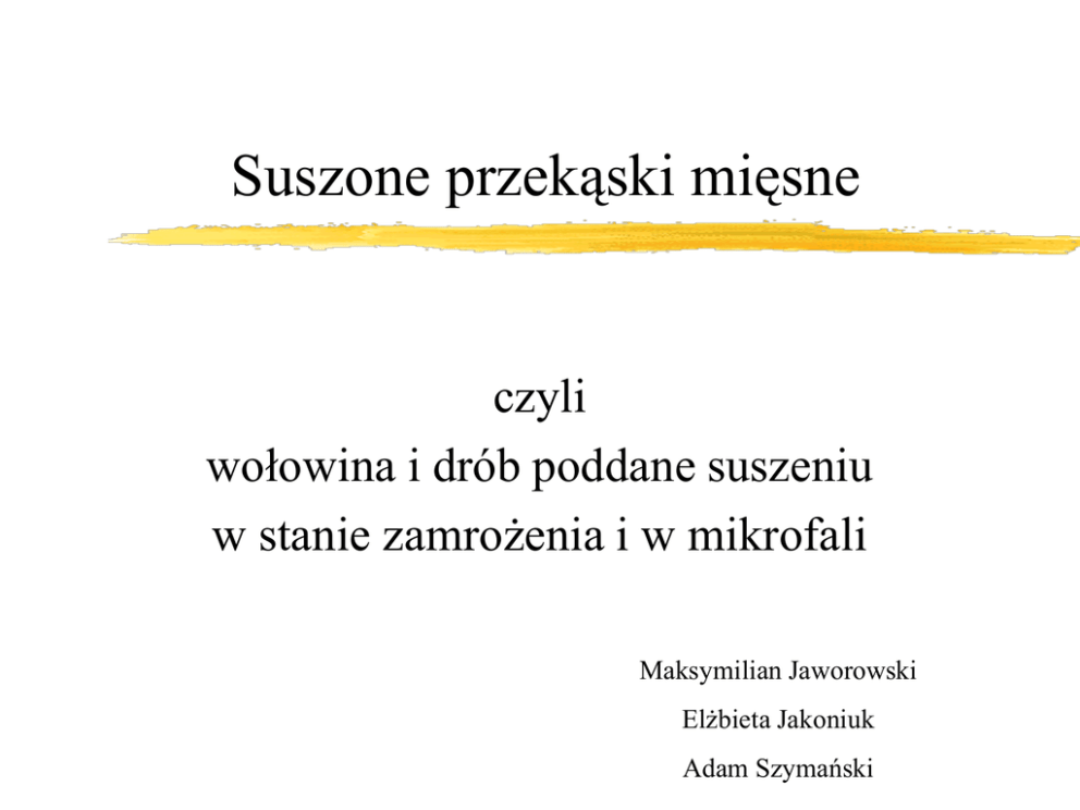 Suszone przekąski mięsne czyli wołowina i drób poddane suszeniu w stanie zamrożenia i w mikrofali Maksymilian Jaworowski Elżbieta Jakoniuk Adam Szymański Przegląd projektu Po co suszyć mięso? Jak suszyć? Właściwości Wyzwania Suszenie mięsa Suszenie jest jedną z najstarszych metod utrwalania mięsa. Mięso suszy i suszyło się od tysięcy lat na całym świecie (Ameryki, Afryka, Azja, Europa). Szuszeniu poddaje się każdy rodzaj mięsa: wołowina, drób, wieprzowina, dziczyzna, a nawet mięso ryb. Sposoby suszenia Na słońcu Wędzenie W suszarniach Liofilizacyjnie Mikrofalowo Kombinowane techniki Zastosowane metody suszenia Liofilizacja (sublimacja), odbywa się w temperaturze poniżej 0 C, przy ciśnieniu rzędu 13-66 Pa czyli przy ciśnieniu dużo niższym od punktu potrójnego wody.Wyróżniamy 3 etapy liofilizacji: - zamrożenie - sublimacja pary z kryształków lodu - dosuszenie w temp. powyżej 0C Zastosowane metody suszenia Suszenie mikrofalowo konwekcyjne. Suszenie konwekcyjne czyli w strumieniu ciepłego powietrza wspomagane oddziaływaniem fal elektromagnetycznych częstotliwości ok 2,45 GHz czyli mikrofalami. Mikrofale powodują drgania cząsteczek wody, powodując podgrzewanie materiału „od środka” a tym samym przyśpieszają proces suszenia. Schemat produkcji suszy Mięso chłodzone z hurtowni Wykrawanie tłuszczu Rozdrabnianie na wilku Odważanie przypraw Mieszanie Formowanie Gotowanie na parze Mrożenie Suszenie mikrofalowo - konwekcyjne Suszenie liofilizacyjne Pakowanie próżniowe Pakowanie w atmosferze gazów obojętnych Wykrawanie tłuszczu Rozdrabnianie na wilku Jako mięso drobiowe użyto filetów z piersi kurczaka. Usunęliśmy drobne złogi tłuszczu i wstępnie rozdrobniliśmy surowiec. Następnie rozdrobniliśmy mięso w wilku. Mięso wołowe było otrzymane z udźca wołowego. Także poddano mięso oczyszczaniu z tłuszczu oraz wykrojono grubsze ścięgna. Następnie rozdrobniono w wilku. Odważanie przypraw Dla mięsa drobiowego przygotowaliśmy warianty: z przyprawą staropolską, z sosem sojowym i z przyprawą meksykańską. Dla mięsa wołowego przygotowaliśmy warianty: na słono, z rodzynkami i na ostro. Mieszanie Mięso wymieszano z następującymi dodatkami: - peklosól 1,5%, - cukier 2%, - GDL 0,5%, - woda 3%, - przyprawy. Użyliśmy mieszarki KENWOOD. Czas mieszania 5 minut w dwóch turach. Formowanie Wyprodukowaliśmy produkty w dwóch wariantach: w kształcie paluszków średnicy 1,5 cm oraz w kształcie plasterków grubości 7 mm i średnicy 5 cm. Gotowanie W celu zniszczenia wegetatywnej flory bakteryjnej mogącej znajdować się w mięsie lub dodanej tam podczas produkcji (w dodatkach lub z używanych urządzeń) mięsa poddano gotowaniu na parze w parowniku w czasie 27 minut i osiągnięto temperatury produktu od 80 do 90 C. Chłodzenie i mrożenie Staraliśmy się zachować ciągłość łańcucha chłodniczego po ugotowaniu produktów. Ugotowane wyroby po wystudzeniu zapakowaliśmy i chłodziliśmy w chłodni w temperaturze 4 C albo gdy planowaliśmy suszenie w perspektywie następnego tygodnia mroziliśmy mięso w temp. -18 C. Suszenie sublimacyjne Przed suszeniem podmroziliśmy mięso do temperatury -39 C w celu zwiększenia sublimacji podczas liofilizacji. Następnie umieściliśmy produkty w liofilizatorze i suszyliśmy przez 24 godziny przy ciśnieniu 1 Pa. Mięso w tym czasie ogrzewało się stopniowo od -39 C do 20 C w ostatnim etapie dosuszania. Po wysuszeniu zbadaliśmy aktywność wody oraz zamknęliśmy w atmosferze gazów obojętnych. Suszenie mikrofalowo - konwekcyjne Suszenie z pomocą mikrofal pozwala na skrócenie czasu suszenia z 7 godzin w przypadku suszenia jedynie ciepłym powietrzem do 1,5 godziny podczas suszenia z zastosowaniem mikrofal. Suszyliśmy produkt w powietrzu o temperaturze 60 C i prędkości przepływu 7,3 m/s. Moc mikrofal wynosiła 200 W. Sublimacyjne vs. mikrofalowe Czas 24 godziny + mrożenie 2 godziny Aktywność wody na poziomie 0,1 Wydajność 300-> 85 g = 28% Struktura pulchna, krucha, pęcznieje w ustach Przechowywanie w atmosferze gazów obojętnych, bez dostępu światła. Czas 1,5 godziny Aktywność wody na poziomie 0,8 Wydajność 300 -> 147 g = 49% Struktura twarda, wymaga żucia i rozgryzania Przechowywanie w atmosferze gazów obojętnych lub pakowane próżniowo, bez dostępu światła. Wyzwania Zbadać wpływ przechowywania na właściwości organoleptyczne Zbadać stopień utlenienia, poziom wolnych rodników Zbadać i określić poziom zakażenia drobnoustrojami chorobotwórczymi Określić preferencję konsumenckie co do kształtu i smaku przekąski Dziękuje za uwagę