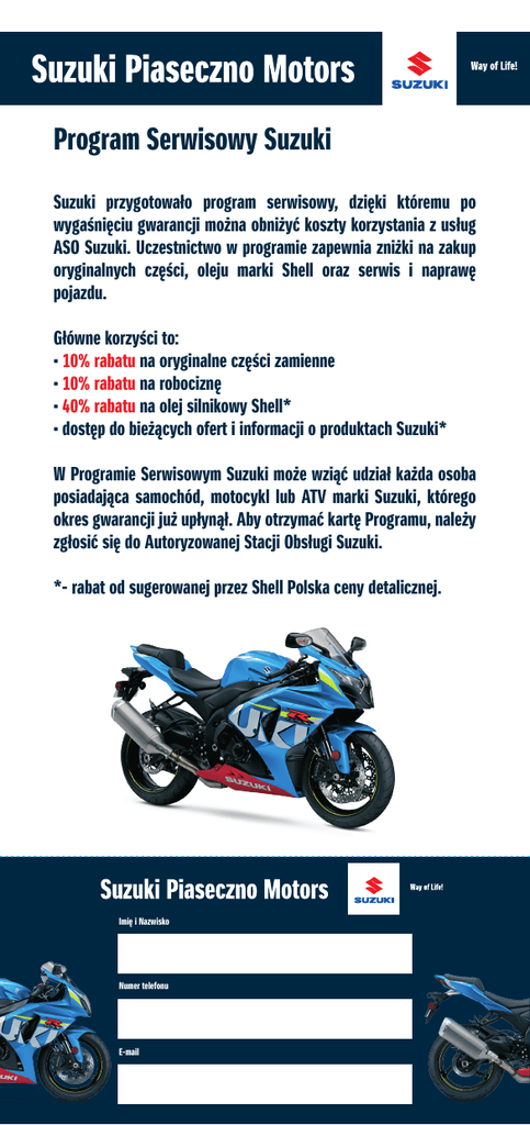 Program Serwisowy Suzuki Suzuki przygotowało program serwisowy, dzięki któremu po wygaśnięciu gwarancji można obniżyć koszty korzystania z usług ASO Suzuki. Uczestnictwo w programie zapewnia zniżki na zakup oryginalnych części, oleju marki Shell oraz serwis i naprawę pojazdu. Główne korzyści to: • 10% rabatu na oryginalne części zamienne • 10% rabatu na robociznę • 40% rabatu na olej silnikowy Shell* • dostęp do bieżących ofert i informacji o produktach Suzuki* W Programie Serwisowym Suzuki może wziąć udział każda osoba posiadająca samochód, motocykl lub ATV marki Suzuki, którego okres gwarancji już upłynął. Aby otrzymać kartę Programu, należy zgłosić się do Autoryzowanej Stacji Obsługi Suzuki. *- rabat od sugerowanej przez Shell Polska ceny detalicznej. Imię i Nazwisko Numer telefonu E-mail