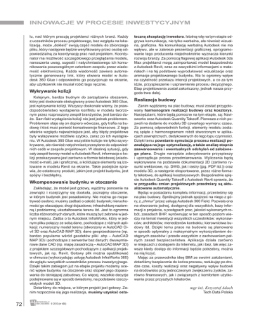 INNOWACJE W PROCESIE INWESTYCYJNYM lu, nad którym pracują projektanci różnych branż. Każdy z uczestników procesu projektowego, bez względu na lokalizację, może „dokleić” swoją część modelu do zbiorczego pliku, który następnie będzie weryfikowany przez osobę odpowiedzialną za koordynację prac nad projektem. Koordynator ma możliwość szczegółowego przeglądania modelu, nanoszenia uwag, sugestii i natychmiastowego ich komunikowania poszczególnym członkom zespołu przez wiadomość elektroniczną. Każda wiadomość zawiera automatycznie generowany link, który otwiera model w Autodesk 360 Glue i odpowiednio go pozycjonuje na ekranie, aby użytkownik nie musiał robić tego ręcznie. Wykrywanie kolizji Kolejnym, bardzo trudnym do zarządzania obszarem, który jest doskonale obsługiwany przez Autodesk 360 Glue, jest wykrywanie kolizji. Wszyscy doskonale wiemy, że prawdopodobieństwo wystąpienia konfliktu w modelu tworzonym przez rozproszony zespół branżystów, jest bardzo duże. Sam fakt wystąpienia kolizji nie jest jednak problemem. Problemem staje się on dopiero wówczas, gdy trafia na budowę i ktoś musi ponieść konsekwencje finansowe. Z tego właśnie względu najważniejsze jest, aby błędy projektowe były wyłapywane możliwie szybko, zaraz po ich wystąpieniu. W Autodesk 360 Glue wszystkie kolizje nie tylko są wykrywane, ale również natychmiast przesyłane do odpowiednich osób w zespole projektowym. W idealnej sytuacji, gdy cały zespół tworzy model w Autodesk Revit, informacja o kolizji przekazywana jest zarówno w formie tekstowej (wiadomość e-mail), jak i graficznej, a kolidujące elementy są izolowane w modelu Revit na ekranie. Takie podejście sprawia, że ostateczny produkt, jakim jest projekt budynku, jest spójny i bezbłędny. Wkomponowanie budynku w otoczenie 72 Zakładając, że model jest gotowy, wyjdźmy ponownie na zewnątrz i rozejrzyjmy się dookoła, poznajmy otoczenie, w którym budynek jest posadowiony. Nie można go rozpatrywać osobno; musimy zadbać o całość: budynek; nieruchomości go otaczające; drogi dojazdowe; infrastrukturę naziemną i podziemną; ukształtowanie terenu itd. Jest to ogromna liczba różnorodnych danych, które muszą być zebrane w jednym miejscu. Zadba o to Autodesk InfraWorks, który w jednym pliku połączy ze sobą dane, pochodzące z różnych aplikacji: numeryczny model terenu (stworzony w AutoCAD Civil 3D oraz AutoCAD MAP 3D); dane geoprzestrzenne (np. bardzo popularne wśród geodetów pliki .shp – AutoCAD MAP 3D) i pochodzące z serwerów baz danych; dwuwymiarowe dane CAD (np. mapę zasadniczą – AutoCAD MAP 3D) z projektem szczegółowym pochodzącym z aplikacji projektowych, jak np. Revit. Gotowy plik można opublikować w chmurze (wykorzystując usługę Autodesk InfraWorks 360) do wglądu wszystkich uczestników procesu inwestycyjnego. Dzięki takim zabiegom już na etapie projektu możemy ocenić wpływ budynku na otoczenie oraz stopień jego dopasowania do istniejącej zabudowy. Co więcej, wszelkie decyzje podejmowane są w sposób świadomy, na podstawie rzeczywistych modeli 3D. Dotarliśmy do miejsca, w którym projekt jest gotowy. Zanim rozpocznie się jego realizacja, musimy uzyskać osta9 ’2013 (nr 493) teczną akceptację inwestora. Istotną rolę na tym etapie odgrywa komunikacja, nie tylko werbalna, ale również wizualna, graficzna. Na komunikację werbalną Autodesk nie ma wpływu, ale w zakresie prezentacji graficznej, oprogramowanie tego producenta niejednokrotnie wyznacza kierunki rozwoju branży. Za pomocą flagowej aplikacji Autodesk 3ds Max projektanci mogą zaimportować model bezpośrednio z Autodesk Revit, wraz ze wszystkimi informacjami o materiałach i na tej podstawie wyprodukować wizualizacje oraz animacje projektowanego budynku. Ma to ogromny wpływ na czytelność przekazu intencji projektowych, a co za tym idzie, przyspieszenie i usprawnienie procesu decyzyjnego. Etap projektowania został zakończony, jednak nasza przygoda trwa dalej. Realizacja budowy Zanim wyjdziemy na plac budowy, musi zostać przygotowany harmonogram realizacji budowy oraz kosztorys. Narzędziami, które będą pomocne na tym etapie, są: Navisworks oraz Autodesk Quantity Takeoff. Pierwsze z nich pozwoli na dodanie do modelu 3D czwartego wymiaru: czasu. Za pomocą odpowiednich funkcji, elementy modelu zostaną spięte z harmonogramem robót stworzonym w aplikacjach zewnętrznych, dedykowanych do tego typu czynności. Dzięki temu powstanie symulacja procesu realizacji pozwalająca na jego optymalizację, a także analizę stopnia zaawansowania i ewentualnych odchyleń od założonego planu. Drugie narzędzie zdecydowanie przyspieszy i uporządkuje proces przedmiarowania. Wyliczenia będą wykonywane na podstawie dokumentacji 2D (zarówno rysunki wektorowe, np. DWG, jak i rastry (jpg. PDF itd.)) oraz modelu 3D, a następnie eksportowane, przez różne formaty tekstowe, do aplikacji kosztorysowych. Bezpośrednie spięcie Autodesk Quantity Takeoff z Autodesk Revit sprawia, że w przypadku zmian projektowych przedmiary są aktualizowane automatycznie. Będąc w posiadaniu kompletu informacji, przenieśmy się na plac budowy. Spróbujmy jednak spojrzeć na niego z góry, z „chmur” przez usługę Autodesk 360 Field. Pozwala ona na stworzenie jednej, dostępnej dla wszystkich, bazy informacji o projekcie, o postępach prac, jakości wykonanych robót, zasadach BHP, wyrównując w ten sposób poziom wiedzy na temat inwestycji wszystkich uczestników: wykonawców; architektów; menedżerów kontraktu; kierownictwa budowy itd. Dzięki temu prace na budowie są planowane w sposób optymalny z maksymalnym wykorzystaniem dostępnych zasobów i przede wszystkim z zachowaniem pełnych zasad bezpieczeństwa. Aplikacja działa zarówno w miejscach z dostępem do Internetu, jak i bez, tak więc zawsze kiedy dostęp do informacji będzie potrzebny, można na nią liczyć. Mając z