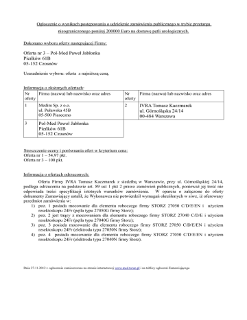 Ogłoszenie o wynikach postępowania o udzielenie zamówienia publicznego w trybie przetargu nieograniczonego poniżej 200000 Euro na dostawę pętli urologicznych. Dokonano wyboru oferty następującej Firmy: Oferta nr 3 – Pol-Med Paweł Jabłonka Pieńków 61B 05-152 Czosnów Uzasadnienie wyboru: oferta z najniższą ceną. Informacja o złożonych ofertach: Nr Firma (nazwa) lub nazwisko oraz adres oferty Nr Firma (nazwa) lub nazwisko oraz adres oferty 1 Medim Sp. z o.o. ul. Puławska 45B 05-500 Piaseczno 2 3 Pol-Med Paweł Jabłonka Pieńków 61B 05-152 Czosnów IVRA Tomasz Kaczmarek ul. Górnośląska 24/14 00-484 Warszawa Streszczenie oceny i porównania ofert w kryterium cena: Oferta nr 1 – 54,97 pkt. Oferta nr 3 – 100 pkt. Informacja o ofertach odrzuconych: Oferta Firmy IVRA Tomasz Kaczmarek z siedzibą w Warszawie, przy ul. Górnośląskiej 24/14, podlega odrzuceniu na podstawie art. 89 ust 1 pkt 2 prawo zamówień publicznych, ponieważ jej treść nie odpowiada treści specyfikacji istotnych warunków zamówienia. W oparciu o załączone do oferty dokumenty Zamawiający ustalił, że Wykonawca nie potwierdził wymagań określonych w siwz, iż oferowany przedmiot zamówienia w: 1) poz. 1 posiada mocowanie dla elementu roboczego firmy STORZ 27050 C/D/E/EN i użyciem resektoskopu 24Fr (pętla typu 27050G firmy Storz); 2) poz. 2 jest tnący z mocowaniem dla elementu roboczego firmy STORZ 27040 C/D/E i użyciem resektoskopu 24Fr (pętla typu 27040G firmy Storz); 3) poz. 3 posiada mocowanie dla elementu roboczego firmy STORZ 27050 C/D/E/EN i użyciem resektoskopu 24Fr (elektroda typu 27050N firmy Storz); 4) poz. 4 posiada mocowanie dla elementu roboczego firmy STORZ 27050 C/D/E/EN i użyciem resektoskopu 24Fr (elektroda typu 27040N firmy Storz). Dnia 27.11.2012 r. ogłoszenie zamieszczono na stronie internetowej www.med.torun.pl i na tablicy ogłoszeń Zamawiającego