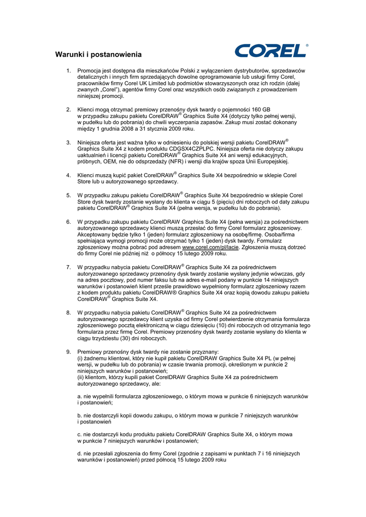 Warunki i postanowienia 1. Promocja jest dostępna dla mieszkańców Polski z wyłączeniem dystrybutorów, sprzedawców detalicznych i innych firm sprzedających dowolne oprogramowanie lub usługi firmy Corel, pracowników firmy Corel UK Limited lub podmiotów stowarzyszonych oraz ich rodzin (dalej zwanych „Corel”), agentów firmy Corel oraz wszystkich osób związanych z prowadzeniem niniejszej promocji. 2. Klienci mogą otrzymać premiowy przenośny dysk twardy o pojemności 160 GB ® w przypadku zakupu pakietu CorelDRAW Graphics Suite X4 (dotyczy tylko pełnej wersji, w pudełku lub do pobrania) do chwili wyczerpania zapasów. Zakup musi zostać dokonany między 1 grudnia 2008 a 31 stycznia 2009 roku. 3. Niniejsza oferta jest waŜna tylko w odniesieniu do polskiej wersji pakietu CorelDRAW Graphics Suite X4 z kodem produktu CDGSX4CZPLPC. Niniejsza oferta nie dotyczy zakupu ® uaktualnień i licencji pakietu CorelDRAW Graphics Suite X4 ani wersji edukacyjnych, próbnych, OEM, nie do odsprzedaŜy (NFR) i wersji dla krajów spoza Unii Europejskiej. 4. Klienci muszą kupić pakiet CorelDRAW Graphics Suite X4 bezpośrednio w sklepie Corel Store lub u autoryzowanego sprzedawcy. 5. W przypadku zakupu pakietu CorelDRAW Graphics Suite X4 bezpośrednio w sklepie Corel Store dysk twardy zostanie wysłany do klienta w ciągu 5 (pięciu) dni roboczych od daty zakupu ® pakietu CorelDRAW Graphics Suite X4 (pełna wersja, w pudełku lub do pobrania). 6. W przypadku zakupu pakietu CorelDRAW Graphics Suite X4 (pełna wersja) za pośrednictwem autoryzowanego sprzedawcy klienci muszą przesłać do firmy Corel formularz zgłoszeniowy. Akceptowany będzie tylko 1 (jeden) formularz zgłoszeniowy na osobę/firmę. Osoba/firma spełniająca wymogi promocji moŜe otrzymać tylko 1 (jeden) dysk twardy. Formularz zgłoszeniowy moŜna pobrać pod adresem www.corel.com/pl/lacie. Zgłoszenia muszą dotrzeć do firmy Corel nie później niŜ o północy 15 lutego 2009 roku. 7. W przypadku nabycia pakietu CorelDRAW Graphics Suite X4 za pośrednictwem autoryzowanego sprzedawcy przenośny dysk twardy zostanie wysłany jedynie wówczas, gdy na adres pocztowy, pod numer faksu lub na adres e-mail podany w punkcie 14 niniejszych warunków i postanowień klient prześle prawidłowo wypełniony formularz zgłoszeniowy razem z kodem produktu pakietu CorelDRAW® Graphics Suite X4 oraz kopią dowodu zakupu pakietu ® CorelDRAW Graphics Suite X4. 8. W przypadku nabycia pakietu CorelDRAW Graphics Suite X4 za pośrednictwem autoryzowanego sprzedawcy klient uzyska od firmy Corel potwierdzenie otrzymania formularza zgłoszeniowego pocztą elektroniczną w ciągu dziesięciu (10) dni roboczych od otrzymania tego formularza przez firmę Corel. Premiowy przenośny dysk twardy zostanie wysłany do klienta w ciągu trzydziestu (30) dni roboczych. 9. Premiowy przenośny dysk twardy nie zostanie przyznany: (i) Ŝadnemu klientowi, który nie kupił pakietu CorelDRAW Graphics Suite X4 PL (w pełnej wersji, w pudełku lub do pobrania) w czasie trwania promocji, określonym w punkcie 2 niniejszych warunków i postanowień; (ii) klientom, którzy kupili pakiet CorelDRAW Graphics Suite X4 za pośrednictwem autoryzowanego sprzedawcy, ale: ® ® ® ® ® a. nie wypełnili formularza zgłoszeniowego, o którym mowa w punkcie 6 niniejszych warunków i postanowień; b. nie dostarczyli kopii dowodu zakupu, o którym mowa w punkcie 7 niniejszych warunków i postanowień c. nie dostarczyli kodu produktu pakietu CorelDRAW Graphics Suite X4, o którym mowa w punkcie 7 niniejszych warunków i postanowień; d. nie przesłali zgłoszenia do firmy Corel (zgodnie z zapisami w punktach 7 i 16 niniejszych warunków i postanowień) przed północą 15 lutego 2009 roku 10. Premiowy przenośny dysk twardy zostanie wysłany tylko w przypadku zastosowania się klienta do niniejszych warunków i postanowień. Ukończenie procesu zgłoszenia jest równowaŜne z potwierdzeniem akceptacji niniejszych warunków i postanowień oraz wszelkich innych warunków i postanowień firmy Corel, które mogą obowiązywać. 11. PREMIOWY PRZENOŚNY DYSK TWARDY JEST DOSTARCZANY PRZEZ FIRMĘ COREL W STANIE „TAK JAK JEST”. FIRMA COREL NIE UDZIELA JAKICHKOLWIEK GWARANCJI DOROZUMIANYCH DOTYCZĄCYCH WARTOŚCI HANDLOWEJ, SATYSFAKCJONUJĄCEJ JAKOŚCI CZY PRZYDATNOŚCI DO OKREŚLONEGO CELU BĄDŹ NIENARUSZANIA PATENTÓW CZY INNYCH PRAW DO WŁASNOŚCI INTELEKTUALNEJ Z WYJĄTKIEM TYCH WYMAGANYCH PRZEZ PRAWO. 12. Premiowy przenośny dysk twardy jest dostarczany zgodnie z warunkami i postanowieniami producenta (jeśli takie istnieją) obowiązującymi w chwili wysyłki. 13. Zgłoszenia przechodzą na własność firmy Corel w chwili ich otrzymania i są przechowywane na jej odpowiedzialność tylko w przypadku ich zachowania przez firmę Corel. Dowody zakupu nie podlegają zwrotowi. 14. Firma Corel nie ponosi odpowiedzialności za utracone, spóźnione, uszkodzone lub nieprawidłowo wysłane zgłoszenia z wyjątkiem przypadków zaniedbania, winy lub celowych działań bądź ich zaniechania przez firmę Corel lub jej agentów. Firma Corel nie ponosi odpowiedzialności za jakiekolwiek awarie techniczne, sprzętowe, programowe, awarie serwerów, witryn internetowych ani za jakiekolwiek inne awarie i uszkodzenia. 15. Firma Corel zastrzega sobie prawo do zmiany, uzupełnienia lub zakończenia promocji bez uprzedzenia. 16. Formularze zgłoszeniowe dotyczące tej oferty naleŜy przesyłać na adres: Corel DRAW Promotion 107688, PO Box TP34, Tipperary, Irlandia. Numer faksu: 00 353 62 314 95. Adres e-mail: [email protected]. PowyŜszy adres korespondencyjny jest przeznaczony wyłącznie do przesyłania zgłoszeń związanych z tą ofertą. Wszelka korespondencja innego rodzaju będzie odrzucana. © 2008 Corel Corporation. Wszelkie prawa zastrzeŜone. Corel, CorelDRAW oraz logo Corel są znakami towarowymi lub zastrzeŜonymi znakami towarowymi firmy Corel Corporation i/lub jej firm zaleŜnych.