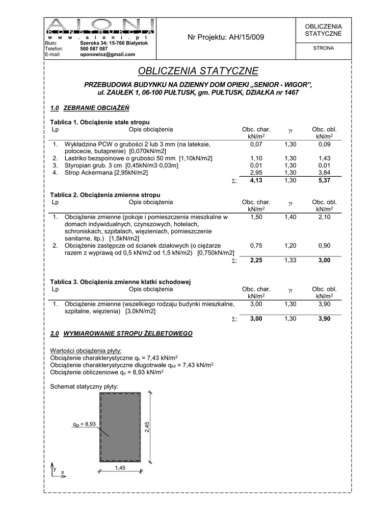 w w Biuro: Telefon: E-mail: w . a i o n i . p l Szeroka 34; 15-760 Białystok 500 087 087 [email protected] OBLICZENIA STATYCZNE Nr Projektu: AH/15/009 STRONA OBLICZENIA STATYCZNE PRZEBUDOWA BUDYNKU NA DZIENNY DOM OPIEKI „SENIOR - WIGOR”, ul. ZAUŁEK 1, 06-100 PUŁTUSK, gm. PUŁTUSK, DZIAŁKA nr 1467 1.0 ZEBRANIE OBCIĄŻEŃ Tablica 1. Obciążenie stałe stropu Lp Opis obciążenia 1. Wykładzina PCW o grubości 2 lub 3 mm (na lateksie, polocecie, butaprenie) [0,070kN/m2] Lastriko bezspoinowe o grubości 50 mm [1,10kN/m2] Styropian grub. 3 cm [0,45kN/m3·0,03m] Strop Ackermana [2,95kN/m2] 2. 3. 4. Σ: Tablica 2. Obciążenia zmienne stropu Lp Opis obciążenia 1. Obciążenie zmienne (pokoje i pomieszczenia mieszkalne w domach indywidualnych, czynszowych, hotelach, schroniskach, szpitalach, więzieniach, pomieszczenie sanitarne, itp.) [1,5kN/m2] Obciążenie zastępcze od ścianek działowych (o ciężarze razem z wyprawą od 0,5 kN/m2 od 1,5 kN/m2) [0,750kN/m2] Σ: 2. Tablica 3. Obciążenia zmienne klatki schodowej Lp Opis obciążenia 1. Obciążenie zmienne (wszelkiego rodzaju budynki mieszkalne, szpitalne, więzienia) [3,0kN/m2] Σ: 2.0 WYMIAROWANIE STROPU ŻELBETOWEGO Wartości obciążenia płyty: Obciążenie charakterystyczne qk = 7,43 kN/m2 Obciążenie charakterystyczne długotrwałe qkd = 7,43 kN/m2 Obciążenie obliczeniowe qo = 8,93 kN/m2 2,45 Schemat statyczny płyty: qo = 8,93 y x 1,45 γf Obc. char. kN/m2 0,07 1,30 Obc. obl. kN/m2 0,09 1,10 0,01 2,95 4,13 1,30 1,30 1,30 1,30 1,43 0,01 3,84 5,37 Obc. char. kN/m2 1,50 γf 1,40 Obc. obl. kN/m2 2,10 0,75 1,20 0,90 2,25 1,33 3,00 Obc. char. kN/m2 3,00 γf 1,30 Obc. obl. kN/m2 3,90 3,00 1,30 3,90 w w Biuro: Telefon: E-mail: w . a i o n i . p l Szeroka 34; 15-760 Białystok 500 087 087 [email protected] Nr Projektu: AH/15/009 OBLICZENIA STATYCZNE STRONA Rozpiętość obliczeniowa płyty leff,x = 1,45 m Rozpiętość obliczeniowa płyty leff,y = 2,45 m Wyniki obliczeń statycznych: Kierunek x: Moment przęsłowy obliczeniowy MSdx = 1,55 kNm/m Moment przęsłowy charakterystyczny MSkx = 1,29 kNm/m Moment przęsłowy charakterystyczny długotrwały MSkx,lt = 1,29 kNm/m Maksymalne oddziaływanie podporowe Qox,max = 6,47 kN/m Zastępcze oddziaływanie podporowe Qox = 5,51 kN/m Kierunek y: Moment przęsłowy obliczeniowy MSdy = 0,54 kNm/m Moment przęsłowy charakterystyczny MSky = 0,45 kNm/m Moment przęsłowy charakterystyczny długotrwały MSky,lt = 0,45 kNm/m Maksymalne oddziaływanie podporowe Qoy,max = 6,47 kN/m Zastępcze oddziaływanie podporowe Qoy = 4,05 kN/m Dane materiałowe : Grubość płyty 16,0 cm Klasa betonu B25 (C20/25) → fcd = 13,33 MPa, fctd = 1,00 MPa, Ecm = 30,0 GPa Stal zbrojeniowa A-IIIN (RB500) → fyk = 500 MPa, fyd = 420 MPa, ftk = 550 MPa Otulenie zbrojenia przęsłowego w kierunku x cnom,x = 25 mm Otulenie zbrojenia przęsłowego w kierunku y cnom,y = 25 mm Założenia obliczeniowe : Sytuacja obliczeniowa: trwała Graniczna szerokość rys wlim = 0,3 mm Graniczne ugięcie alim = leff/200 - jak dla stropów (tablica 8) Wymiarowanie wg PN-B-03264:2002 (metoda uproszczona): Kierunek x: Przęsło: Zbrojenie potrzebne (war. konstrukcyjny) As = 1,69 cm2/mb. Przyjęto φ10 co 25,0 cm o As = 3,14 cm2/mb (ρ = 0,24%) Warunek nośności na zginanie: MSd,x = 1,55 kNm/mb < MRd,x = 16,50 kNm/mb (9,4%) Szerokość rys prostopadłych: wkx = 0,000 mm < wlim = 0,3 mm (0,0%) Podpora: Warunek nośności na ścinanie: VSd,x = 6,47 kN/mb < VRd1,x = 83,49 kN/mb (7,8%) Kierunek y: Przęsło: Zbrojenie potrzebne (war. konstrukcyjny) As = 1,69 cm2/mb. Przyjęto φ10 co 25,0 cm o As = 3,14 cm2/mb (ρ = 0,24%) Warunek nośności na zginanie: MSd,y = 0,54 kNm/mb < MRd,y = 16,50 kNm/mb (3,3%) Szerokość rys prostopadłych: wky = 0,000 mm < wlim = 0,3 mm (0,0%) Podpora: Warunek nośności na ścinanie: VSd,y = 6,47 kN/mb < VRd1,y = 83,49 kN/mb (7,8%) Ugięcie całkowite płyty: Maksymalne ugięcie od MSk,lt: a(MSk,lt) = 0,10 mm < alim = 7,25 mm (1,4%) 3.0 WYMIAROWANIE BELKI ŻELBETOWEJ SZKIC BELKI A 0,25 B 3,86 0,25 w w Biuro: Telefon: E-mail: w . OBLICZENIA STATYCZNE Nr Projektu: AH/15/009 a i o n i . p l Szeroka 34; 15-760 Białystok 500 087 087 [email protected] STRONA OBCIĄŻENIA NA BELCE 17,04 17,04 13,00 Schemat statyczny belki 1 A B 4,11 DANE MATERIAŁOWE I ZAŁOŻENIA: Klasa betonu: B25 (C20/25) → fcd = 13,33 MPa, fctd = 1,00 MPa, Ecm = 30,0 GPa Stal zbrojeniowa główna A-IIIN (RB500) → fyk = 500 MPa, fyd = 420 MPa, ftk = 550 MPa Stal zbrojeniowa strzemion A-I (PB240) → fyk = 240 MPa, fyd = 210 MPa, ftk = 265 MPa Sytuacja obliczeniowa: trwała Cotanges kąta nachylenia ścisk. krzyżulców bet. cot θ = 2,00 Graniczna szerokość rys wlim = 0,3 mm Graniczne ugięcie alim = jak dla belek i płyt (wg tablicy 8) WYKRESY SIŁ WEWNĘTRZNYCH Momenty zginające [kNm]: B 48,96 40,95 42,08 A Siły tnące [kN]: 42,08 10,14 A -2,86 B -40,95 Ugięcia [mm]: A B 14,60 w w Biuro: Telefon: E-mail: w . OBLICZENIA STATYCZNE Nr Projektu: AH/15/009 a i o n i . p l Szeroka 34; 15-760 Białystok 500 087 087 [email protected] STRONA Obwiednia sił wewnętrznych Momenty zginające [kNm]: 40,95 B 42,08 A 48,96 Siły tnące [kN]: 42,08 34,62 10,14 -2,86 A B -33,48 -40,95 Ugięcia [mm]: A B 14,60 35 WYMIAROWANIE wg PN-B-03264:2002 : 25 Przyjęte wymiary przekroju: bw = 25,0 cm, h = 35,0 cm otulina zbrojenia cnom = 25 mm Przęsło A - B: Zginanie: (przekrój a-a) Moment przęsłowy obliczeniowy MSd = 48,96 kNm Zbrojenie potrzebne As = 4,06 cm2. Przyjęto 4φ12 o As = 4,52 cm2 (ρ = 0,58%) Warunek nośności na zginanie: MSd = 48,96 kNm < MRd = 54,06 kNm (90,6%) Ścinanie: Miarodajna wartość obliczeniowa siły poprzecznej VSd = 34,62 kN Zbrojenie konstrukcyjne strzemionami dwuciętymi φ6 co 230 mm na całej długości przęsła Warunek nośności na ścinanie: VSd = 34,62 kN < VRd1 = 50,45 kN (68,6%) SGU: Moment przęsłowy charakterystyczny długotrwały MSk,lt = 39,01 kNm Szerokość rys prostopadłych: wk = 0,291 mm < wlim = 0,3 mm 