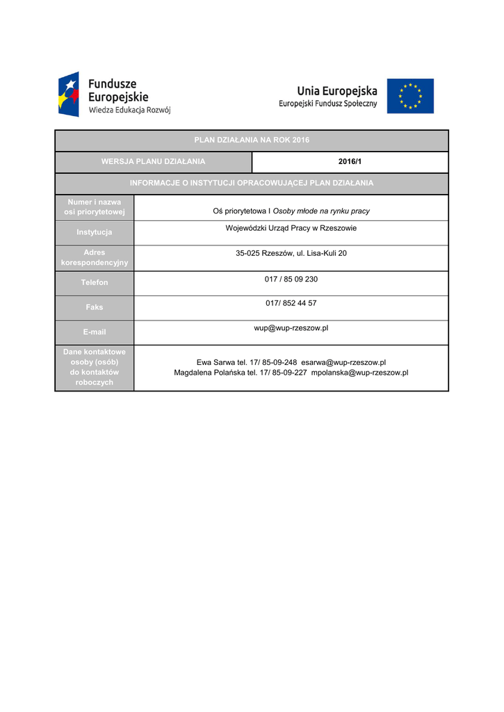 PLAN DZIAŁANIA NA ROK 2016 WERSJA PLANU DZIAŁANIA 2016