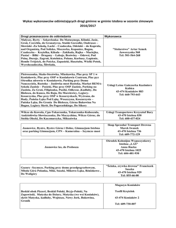 Wykaz wykonawców odśnieżających drogi gminne w gminie Istebna w sezonie zimowym 2016/2017 Drogi przeznaczone do odśnieżania Małysze, Byrty – Szkawlonka- Do Matusznego, Klimki, Jasie, Groń, Czerchla, do Granatyrza, Stańki Gorzołki, Ondrusze – Słowioki -Za Szkołą, Łacki – Czadeczka, Odcinki – do Kaprola, nad Organistą, Pod Solisko, Moczorka, Kopanice, Bagna, Czadeczka - Krężelka, Kikula – Zakikula, Rajka – Maciejka, Pustać – Biłki – Dragony – Łabaje, Bestwiny – Odewsi, Pod Psinę, Duraje, Zagroń, Kotelnica, Polana, Korbasy, Łupienie, Rondo Trójstyk, do Patyka, Zapasieki, Hasztuba, Wielki Potok, Wyrchczadeczka, Śliwkula, Pietroszonka, Skała-Stecówka, Mlaskawka, Plac przy SP 1 w Koniakowie, Plac przy OSP w Koniakowie Centrum, Plac pyz Ośrodku zdrowia w Koniakowie, Parking przy Domu Nauczyciela, Rastoka – Jasiówka most Rastoka, Market REMASzkoła Zaolzie – Pasieki, Plac przy OSP Zaolzie, Parking na Zaolziu, Za Groń, Filipionka, Pustki, Odkrzas ,Kadłuby, Do Bielesza, do Kunca, Do Raju, Do Marekwicy, LegieryKosarzyska, Plac przy OSP w Kosarzyskach, Wyżrana, do Rudy, Pańska Łąka Pod Łąkę, Woszczyna, Koszarzysta – Pańska Łąka, Do Grenia Do Bielesza, Górna Bukowina Na Bagno, Legiery Skrót, Do Pogorzelskiego, Do Sikory Wilcze do Kowola, Cpn-Tokarzonka, Tokarzonka-Kuboszula, Andziołówka Słowioczonka, Do Maczychina, Wilcze Górne, do Stebla Olecki, Do Kaczmarzyka, Mikszówka Wykonawca "Stolarstwo" Artur Szmek Jaworzynka 560 Tel: 501-564-268 Usługi Leśne Gańczorka Kazimierz Kubica 43-474 Koniaków 883 Tel: 660-793-643 Usługi Transportowe Krzysztof Bury 43-470 Istebna 830 Tel: 600-437-024 Jasnowice, Bystre, Bystre Górne i Dolne, Gimnazjum Istebna oraz parking Gimnazjum, CPN – Kameralna – Szymcze most Skup Sprzedaż Transport Drewna Marek Iwanek 43-470 Istebna 736 Tel: 609-772-129 Jasnowice las, do Probosza Ośrodek Kolonijno Wypoczynkowy Istebna „LAS” Anna Rucka 43-470 Istebna 1025 Tel: 604-401-930 Gazury -Szymcze, Parking przy domu przedpogrzebowym, Młoda Góra Polanka, Miki, Suszki, Mikowo Łąka, Bźniokowo , Do Waligóry "Ścinka, zrywka drewna" Franciszek Suszka 43-470 Istebna 929 Tel: 855-66-00 Magazyn Koniaków Beskid obok Pizzeri, Beskid Poloki, Bryje-Poloki, Na Zapowiedź, Matyska do Dziury, Matyska (we wsi Koniaków), skrót Matyska, kadłuby, Wojtosze, Nowy Jork, Bukowina, Gronik Teofil Krężelok 43-474 Koniaków 2 Tel: 609-730-007 Brzestowe – Wojtosze, Do Kowola , Cisowe, do Skurzoka, Pasieki do mostu, Za Dolina, Jasiówka, Bombolówka Parking przy Gminie, Park Centrum, Parking pod grapą, Parking przy Ośrodku Edukacji Ekologicznej, Parking OSP , Parking Oczyszczalnia, Schody Dzielec, Droga za Strażnicą OSP, Dziedzina, Wojtosze Zagroń, Podoliny Dzielec, Parking Pogotowie, Do Przepompowni, Gliniane, Wywóz, Wojtosze Za Groń do Macoszka Firma Usługowa Krężelok Zdzisław 43-470 Istebna 830 Tel: 502-059-176 F.U.H. FOREST Andrzej Łupieżowiec 43-470 Istebna 93 Tel: 609-955-953 Zimna Woda-Żurówka Jasninowa, Szkatólka ,Polana, Gronik II, Szańce Wołowa, Pietraszyna, Gołówka, Deje, Tkoczówka, do Owczarni P.W Kukuczka Damian 43-474 Koniaków 849 Tel: 33 855-64-84 Tyniok od DW do DP Kamesznica, Tyniok od DP Kamesznica w dórę, Żurówka Skrót Żurówka, Do Brysia, Do Celaka Wyrób Opakowań Drewnianych oraz innych Wyrobów Drewnianych Jacek Kaczmarzyk 43-474 Koniaków 525 Tel: 503-115-589 Rdzawka – Usnobocz – do Jureczka, Pod Siwe, RastokaZarastoka, Małączka, Do Gajdosza, Do Kubzoka, Do Baru, Do Legierskiego, Do Kawuloka, Pod Zwączatą, Plac przy SP 2 Rastoka Od Smugi-Połom, Kawulonka, Leszczyna-Olza, Murzynka, Leszczyna-Do Juroszka Zakład Wyrobów Z Drewna "PROPAL" 43-474 Koniaków 717 Tel: 516-187-262 „Wi i RO” Wykonawstwo Instalacji i Robót Ogólnobudowlanych Stanisław Łacek 43-470 Istebna 1241 Tel: 33-855-61-23