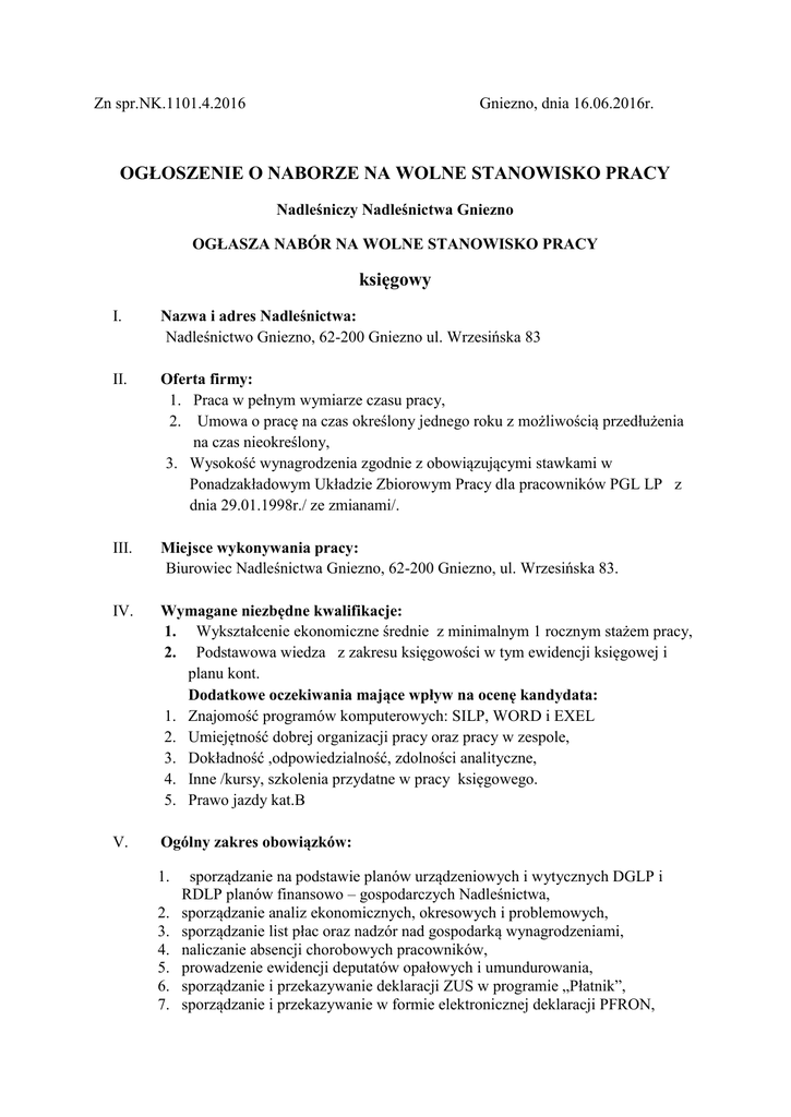 Zn spr.NK.1101.4.2016 Gniezno, dnia 16.06.2016r. OGŁOSZENIE O NABORZE NA WOLNE STANOWISKO PRACY Nadleśniczy Nadleśnictwa Gniezno OGŁASZA NABÓR NA WOLNE STANOWISKO PRACY księgowy I. Nazwa i adres Nadleśnictwa: Nadleśnictwo Gniezno, 62-200 Gniezno ul. Wrzesińska 83 II. Oferta firmy: 1. Praca w pełnym wymiarze czasu pracy, 2. Umowa o pracę na czas określony jednego roku z możliwością przedłużenia na czas nieokreślony, 3. Wysokość wynagrodzenia zgodnie z obowiązującymi stawkami w Ponadzakładowym Układzie Zbiorowym Pracy dla pracowników PGL LP z dnia 29.01.1998r./ ze zmianami/. III. Miejsce wykonywania pracy: Biurowiec Nadleśnictwa Gniezno, 62-200 Gniezno, ul. Wrzesińska 83. IV. Wymagane niezbędne kwalifikacje: 1. Wykształcenie ekonomiczne średnie z minimalnym 1 rocznym stażem pracy, 2. Podstawowa wiedza z zakresu księgowości w tym ewidencji księgowej i planu kont. Dodatkowe oczekiwania mające wpływ na ocenę kandydata: 1. Znajomość programów komputerowych: SILP, WORD i EXEL 2. Umiejętność dobrej organizacji pracy oraz pracy w zespole, 3. Dokładność ,odpowiedzialność, zdolności analityczne, 4. Inne /kursy, szkolenia przydatne w pracy księgowego. 5. Prawo jazdy kat.B V. Ogólny zakres obowiązków: 1. 2. 3. 4. 5. 6. 7. sporządzanie na podstawie planów urządzeniowych i wytycznych DGLP i RDLP planów finansowo – gospodarczych Nadleśnictwa, sporządzanie analiz ekonomicznych, okresowych i problemowych, sporządzanie list płac oraz nadzór nad gospodarką wynagrodzeniami, naliczanie absencji chorobowych pracowników, prowadzenie ewidencji deputatów opałowych i umundurowania, sporządzanie i przekazywanie deklaracji ZUS w programie „Płatnik”, sporządzanie i przekazywanie w formie elektronicznej deklaracji PFRON, 8. naliczanie i przekazywanie do budżetu podatku dochodowego od osób fizycznych 9. przekazywanie pracownikom rocznego rozliczenia PIT 10. prowadzenie gospodarki ZFŚS, 11. sprawdzanie i księgowanie dokumentów raportu kasowego VI. Wymagane dokumenty: 1. CV 2. List motywacyjny 3. Kserokopie dyplomów potwierdzających wykształcenie i kwalifikacje zawodowe /potwierdzone własnoręcznym podpisem za zgodność z oryginałem/ 4. Kserokopie świadectw pracy /potwierdzone własnoręcznym podpisem za zgodność z oryginałem/ 5. Zgoda na przetwarzanie danych osobowych /załącznik nr.2/ VII. Termin i miejsce składania ofert: 1. Oferty należy składać do dnia 05.07.2016r. 2. Oferty należy składać w sekretariacie Nadleśnictwa Gniezno – pokój nr. 21 lub przesłać pocztą z dopiskiem /nabór na wolne stanowisko pracy/ 3. Oferty przesyłane drogą elektroniczną nie będą rozpatrywane. 4. Oferty wpływające po terminie nie będą rozpatrywane i zostaną odesłane na adres korespondencyjny adresata. Nadleśniczy Michał Michalak