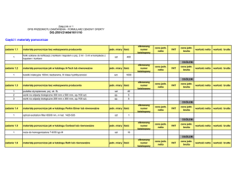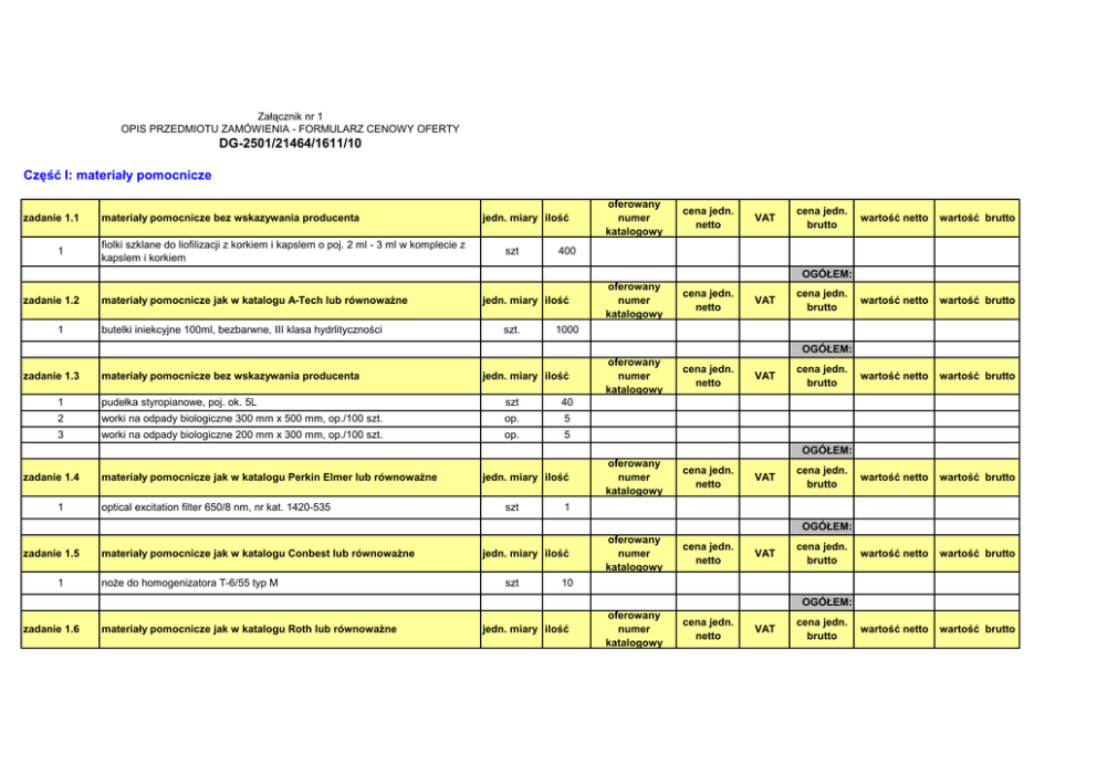 Załącznik nr 1 OPIS PRZEDMIOTU ZAMÓWIENIA - FORMULARZ CENOWY OFERTY DG-2501/21464/1611/10 Część I: materiały pomocnicze zadanie 1.1 1 materiały pomocnicze bez wskazywania producenta fiolki szklane do liofilizacji z korkiem i kapslem o poj. 2 ml - 3 ml w komplecie z kapslem i korkiem jedn. miary ilość szt oferowany numer katalogowy cena jedn. netto VAT cena jedn. brutto wartość netto wartość brutto wartość netto wartość brutto wartość netto wartość brutto wartość netto wartość brutto wartość netto wartość brutto wartość netto wartość brutto 400 OGÓŁEM: zadanie 1.2 1 materiały pomocnicze jak w katalogu A-Tech lub równowaŜne butelki iniekcyjne 100ml, bezbarwne, III klasa hydrlityczności jedn. miary ilość szt. oferowany numer katalogowy cena jedn. netto VAT cena jedn. brutto 1000 OGÓŁEM: zadanie 1.3 materiały pomocnicze bez wskazywania producenta jedn. miary ilość 1 pudełka styropianowe, poj. ok. 5L szt 40 2 worki na odpady biologiczne 300 mm x 500 mm, op./100 szt. op. 5 3 worki na odpady biologiczne 200 mm x 300 mm, op./100 szt. op. 5 oferowany numer katalogowy cena jedn. netto VAT cena jedn. brutto OGÓŁEM: zadanie 1.4 1 materiały pomocnicze jak w katalogu Perkin Elmer lub równowaŜne optical excitation filter 650/8 nm, nr kat. 1420-535 jedn. miary ilość szt oferowany numer katalogowy cena jedn. netto VAT cena jedn. brutto 1 OGÓŁEM: zadanie 1.5 1 materiały pomocnicze jak w katalogu Conbest lub równowaŜne noŜe do homogenizatora T-6/55 typ M jedn. miary ilość szt oferowany numer katalogowy cena jedn. netto VAT cena jedn. brutto 10 OGÓŁEM: zadanie 1.6 materiały pomocnicze jak w katalogu Roth lub równowaŜne jedn. miary ilość oferowany numer katalogowy cena jedn. netto VAT cena jedn. brutto 1 termometr: funkcje: odczyt temp. min i max, reset lub/ i on/off, ilość sond pomiarowych: jedna, dł. przewodu min 1,5 m, przewód sondy odporny na temp. w zakresie -40ºC - +70ºC, obudowa: wodoszczelna, wymiary ok. dł. 86 mm, szer. 57 mm, wys. 30 mm, mocowanie: magnes, zakres pomiaru: -40ºC +70ºC, dokładność: ±0,5ºC dla temp. w przedziale -20ºC - +25ºC, ±1,0ºC dla temp. w pozostałych przedziałach, wymagania metrologiczne: wzorcowanie przez lab. wzorcujące akredytowane przez PCA lub inną zagraniczną lub międzynarodową jednostkę certyfikującą, wzorcowanie w pkt pomiarowych: 1 szt. termometr: poniŜej -20ºC i w przedziale +18ºC - +25ºC, 1 szt. termometr: w przedziale +2ºC - +8ºC i w przedziale +18ºC - +25ºC, 1 szt. termometr: +58ºC ±2ºC, +37ºC ±2ºC, w przedziale +18ºC - +25ºC, w przedziale 0ºC - +5ºC, 1 szt. termometr: w przedziale +18ºC - +25ºC, w przedziale 0ºC - +5ºC, poniŜej -20ºC, nr kat. KA32.1 szt. 4 2 statyw PCR - Rotilabo, z PP, z przezroczystym wieczkiem, moŜna je ustawiać jeden na drugim, do naczyń, pasków i plytek PCR o poj. 0,2 ml, 96 miejsc, otwory na płytce 8 x 12, śr. Otworów 5,5 mm, odporne na temp. od -80ºC do +121ºC, wymiary: dł. 138 mm x szer. 98 mm x wys. 38 mm., wysokość bez wieczka 30 mm, op./5 szt., nr kat. HX25.1 op. 5 3 butelki z gwintowaną szyjką, 1000 ml, op./10 szt., nr kat. A361.1 op. 3 4 butelki z gwintowaną szyjką, 500 ml, op./10 szt., nr kat. A360.1 op. 2 5 rękawice Semper Guard CRX powder free rozm. S, nr kat. CH48.1 op. 5 6 rękawice Semper Guard CRX powder free rozm. XL, nr kat. CH51.1 op. 5 7 rękawice Semper Guard CRX powder free rozm. M, nr kat. CH49.1 op. 1 8 błona uszczelniająca do mikrotestów Rotilabo, sterylna, typ 2, samoprzylepna, z poliestru, op./100 szt., nr kat. EN77.1 op. 2 OGÓŁEM: zadanie 1.7 1 materiały pomocnicze jak w katalogu Polytron lub równowaŜne nóŜ do homogenizatora Polytron 3100, PT-DA 3020/2EC, nr kat. KI11030075 jedn. miary ilość szt oferowany numer katalogowy cena jedn. netto VAT cena jedn. brutto wartość netto wartość brutto wartość netto wartość brutto 1 OGÓŁEM: zadanie 1.8 materiały pomocnicze jak w katalogu Merck lub równowaŜne jedn. miary ilość 1 filtry membranowe zapasowe 0,2 um, nr kat. 612F1963 szt 4 2 Paski wskaźnikowe pH 5-10, niefarbujące Neutralit, nr kat. 109 533 op. 10 oferowany numer katalogowy cena jedn. netto VAT cena jedn. brutto OGÓŁEM: zadanie 1.9 materiały pomocnicze jak w katalogu Bionovo lub równowaŜne jedn. miary ilość 1 pH-metr stołowy Hanna Instruments, model pH 213 wraz z elektrodą pH HI 1131B, czujnikiem temperatury, uchwytem elektrody, roztworami buforowymi (pH=7 i 4, obj. 20 ml), roztworem elektrolitu oraz zasilaczem 12V, parametry urządzenia: zakres pomiaru pH: 0-14, zakres pomiaru mV: ±999,9 (ORP), ±999,9 (ISE), zakres pomiaru temperatury (ºC): 0 do 100, rozdzielczość pomiaru pH: 0,001, rozdzielczość pomiaru mV: 0,1 (ORP), 0,1 (ISE), rozdzielczość pomiaru temperatury (ºC): 0,1, dokładność pomiaru pH: ±0,002, dokładność pomiaru mV: ±0,05 P.E (ORP i ISE), dokładność pomiaru temperatury (ºC): ±0,5, wymiary (mm): 240 x 182 x 74, waga (g): 1100, nr kat. B-2752 szt 1 2 gięta szczotka do okrągłych naczyń, nr kat. 1-7036 szt 8 3 długa szczotka, nr kat. 1-7037 szt 3 4 szczotka do probówek 15 mm, nr kat. B-1559 szt 15 5 szczotka do probówek 10 mm, nr kat. B-1558 szt 10 6 rękawiczki nitrylowe długie rozm. S, op./50 szt., nr kat. 1-8200 op. 1 7 rękawiczki nitrylowe długie rozm. M, op./50 szt., nr kat. 1-8201 op. 1 8 kriopudełko neoBox-81, nr kat. 2-2910 szt 50 9 kriopudełko neoBox-81, nr kat. 2-2914 szt 30 oferowany numer katalogowy cena jedn. netto VAT cena jedn. brutto wartość netto wartość brutto wartość netto wartość brutto wartość netto wartość brutto OGÓŁEM: zadanie 1.10 1 materiały pomocnicze jak w katalogu Labo-Baza lub równowaŜne wytrząsarka IKA model MS 3 Basic, parametry urządzenia: funkcja wytrząsania próbek, małych naczyń i mikropłytek z moŜliwością dokupienia nasadek, wkładki do wytrząsania: uniwersalna wkładka do wytrząsania IKA MS1.21, wkładka do wytrząsania pojedynczych prob