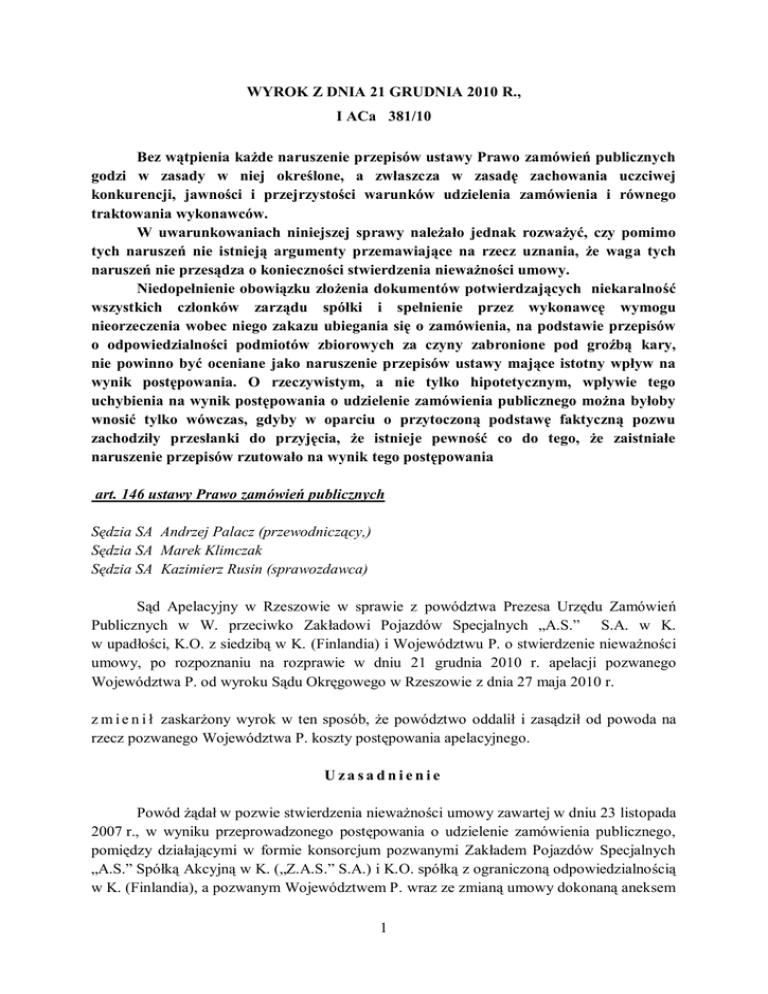 WYROK Z DNIA 21 GRUDNIA 2010 R., I ACa 381/10 Bez wątpienia każde naruszenie przepisów ustawy Prawo zamówień publicznych godzi w zasady w niej określone, a zwłaszcza w zasadę zachowania uczciwej konkurencji, jawności i przejrzystości warunków udzielenia zamówienia i równego traktowania wykonawców. W uwarunkowaniach niniejszej sprawy należało jednak rozważyć, czy pomimo tych naruszeń nie istnieją argumenty przemawiające na rzecz uznania, że waga tych naruszeń nie przesądza o konieczności stwierdzenia nieważności umowy. Niedopełnienie obowiązku złożenia dokumentów potwierdzających niekaralność wszystkich członków zarządu spółki i spełnienie przez wykonawcę wymogu nieorzeczenia wobec niego zakazu ubiegania się o zamówienia, na podstawie przepisów o odpowiedzialności podmiotów zbiorowych za czyny zabronione pod groźbą kary, nie powinno być oceniane jako naruszenie przepisów ustawy mające istotny wpływ na wynik postępowania. O rzeczywistym, a nie tylko hipotetycznym, wpływie tego uchybienia na wynik postępowania o udzielenie zamówienia publicznego można byłoby wnosić tylko wówczas, gdyby w oparciu o przytoczoną podstawę faktyczną pozwu zachodziły przesłanki do przyjęcia, że istnieje pewność co do tego, że zaistniałe naruszenie przepisów rzutowało na wynik tego postępowania art. 146 ustawy Prawo zamówień publicznych Sędzia SA Andrzej Palacz (przewodniczący,) Sędzia SA Marek Klimczak Sędzia SA Kazimierz Rusin (sprawozdawca) Sąd Apelacyjny w Rzeszowie w sprawie z powództwa Prezesa Urzędu Zamówień Publicznych w W. przeciwko Zakładowi Pojazdów Specjalnych „A.S.” S.A. w K. w upadłości, K.O. z siedzibą w K. (Finlandia) i Województwu P. o stwierdzenie nieważności umowy, po rozpoznaniu na rozprawie w dniu 21 grudnia 2010 r. apelacji pozwanego Województwa P. od wyroku Sądu Okręgowego w Rzeszowie z dnia 27 maja 2010 r. z m i e n i ł zaskarżony wyrok w ten sposób, że powództwo oddalił i zasądził od powoda na rzecz pozwanego Województwa P. koszty postępowania apelacyjnego. U za sa dnienie Powód żądał w pozwie stwierdzenia nieważności umowy zawartej w dniu 23 listopada 2007 r., w wyniku przeprowadzonego postępowania o udzielenie zamówienia publicznego, pomiędzy działającymi w formie konsorcjum pozwanymi Zakładem Pojazdów Specjalnych „A.S.” Spółką Akcyjną w K. („Z.A.S.” S.A.) i K.O. spółką z ograniczoną odpowiedzialnością w K. (Finlandia), a pozwanym Województwem P. wraz ze zmianą umowy dokonaną aneksem 1 z 24 grudnia 2007 r. argumentując, że postępowanie o udzielenie zamówienia publicznego dotknięte było istotnymi uchybieniami powodującymi jego nieważność, a mianowicie zamawiający dopuścił do przetargu w/w konsorcjum pomimo niezłożenia dokumentu potwierdzającego, że żaden z członków organu zarządzającego spółką K.O. nie został prawomocnie skazany za przestępstwo określone w art. 24 ust. 1 pkt 8 ustawy Prawo zamówień publicznych (dalej: P.z.p.), jak też dokumentu pozwalającego na ocenę, czy w stosunku do tego podmiotu sąd nie orzekł zakazu ubiegania się o zamówienia, a w takiej sytuacji wykonawca powinien zostać wykluczony z udziału w postępowaniu, które uległoby unieważnieniu. Podniósł także, że oferta nie została złożona przez w/w konsorcjum, ale samodzielnie przez „Z.A.S.” S.A., czyli podmiot niezaproszony do składania oferty, co winno skutkować jej odrzuceniem, jak również, że doszło do bezpodstawnej zmiany terminu wykonania zamówienia. Pozwane Województwo P. wniosło o oddalenie powództwa zarzucając, że o ile nawet doszło do naruszenia przepisów cytowanej ustawy, to nie miało to wpływu na wynik postępowania, powód nie wykazał, że wynik postępowania powinien być inny. W szczególności podniósł, że „Z.A.S.” S.A., jako lider konsorcjum był uprawniony do reprezentowania obu wykonawców w stosunku do zamawiającego, a treść oferty nie była sprzeczna z SIWZ oraz nie zachodziły jakiekolwiek nieprawidłowości w związku z czynnościami wyboru oferty. Również pozwany „Z.A.S.” S.A. wniósł o oddalenie powództwa i zarzucił, że nawet w przypadku uznania, że doszło do naruszenia przepisów przedmiotowej ustawy, pozostało to bez znaczenia dla wyniku postępowania, sformalizowanie systemu zamówień publicznych nie może być celem samym w sobie, zaś powód nie wykazał, by wymienione uchybienia wpłynęły na wynik postępowania, co odnosi się zwłaszcza do wskazania przez tego pozwanego, że spółka K.O. jest podwykonawcą w zakresie dostawy odladzarki do samolotów, a ofertę złożyli tylko pozwani tworzący konsorcjum. W dniu 18 września 2009 r. ogłoszona została upadłość pozwanego „Z.A.S.” S.A. przez likwidację majątku masy, zaś syndyk oświadczył , że nie przystępuje do toczącego się postępowania. Pozwany K.O. nie odniósł się do żądania pozwu. Według ustaleń Sądu Okręgowego pozwane Województwo P. wszczęło w dniu 26 września 2007 r. postępowanie o udzielenie zamówienia publicznego na dostawę i kupno specjalistycznych pojazdów i urządzeń lotniskowych o łącznej wartości 24.000.000 zł w ramach programu „Rozbudowa Regionalnego Portu Lotniczego: Port Lotniczy R. J.” przy czym dopuszczono możliwość odrębnego postępowania w odniesieniu do części I (zakup 2 samochodów strażackich) i części V (zakup odladzarki). W ogłoszeniu zamieszczonym w Dzienniku Urzędowym Wspólnot Europejskich w dniu 28 września 2007 r. zamawiający wyznaczył 10-dniowy termin do składania wniosków z uwagi na pilną potrzebę złożenia zamówienia motywowaną możliwością utraty środków z rezerwy celowej budżetu, z których zamówienie miało być finansowane. W dniu 5 października 2007 r. konsorcjum pozwanych „Z.A.S.” S.A. i K.O. wniosło o dopuszczenie do udziału w postępowaniu w odniesieniu do w/w części. Na wezwanie zamawi