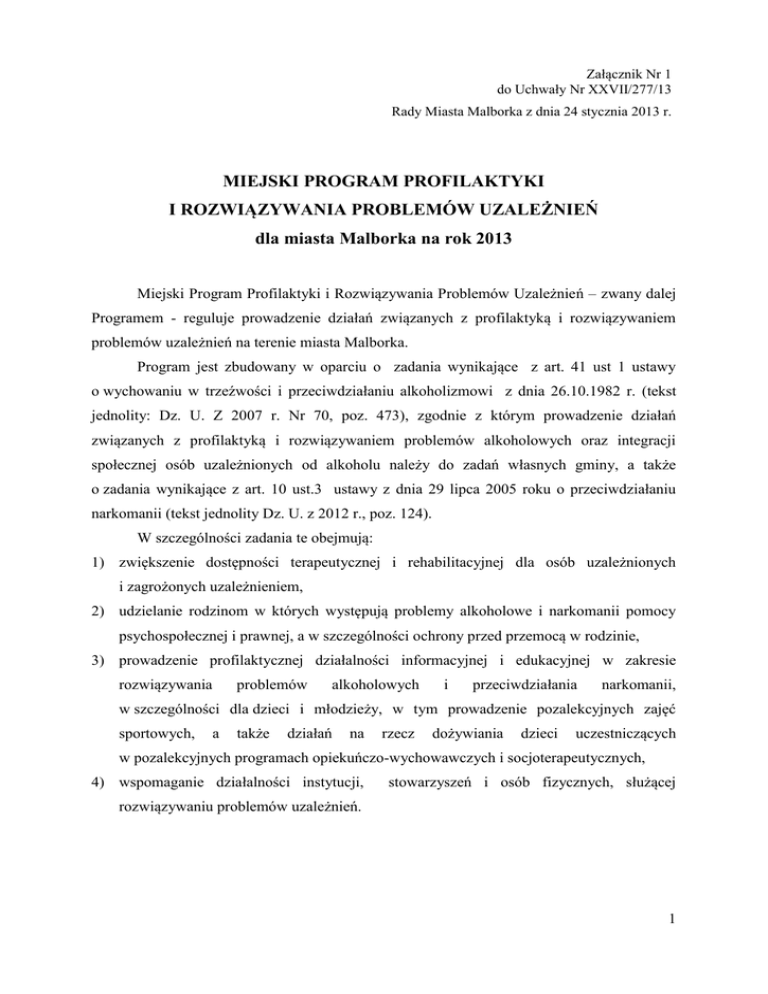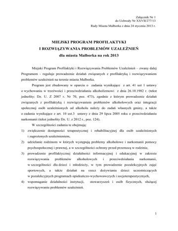 Załącznik Nr 1 do Uchwały Nr XXVII/277/13 Rady Miasta Malborka z dnia 24 stycznia 2013 r. MIEJSKI PROGRAM PROFILAKTYKI I ROZWIĄZYWANIA PROBLEMÓW UZALEŻNIEŃ dla miasta Malborka na rok 2013 Miejski Program Profilaktyki i Rozwiązywania Problemów Uzależnień – zwany dalej Programem - reguluje prowadzenie działań związanych z profilaktyką i rozwiązywaniem problemów uzależnień na terenie miasta Malborka. Program jest zbudowany w oparciu o zadania wynikające z art. 41 ust 1 ustawy o wychowaniu w trzeźwości i przeciwdziałaniu alkoholizmowi z dnia 26.10.1982 r. (tekst jednolity: Dz. U. Z 2007 r. Nr 70, poz. 473), zgodnie z którym prowadzenie działań związanych z profilaktyką i rozwiązywaniem problemów alkoholowych oraz integracji społecznej osób uzależnionych od alkoholu należy do zadań własnych gminy, a także o zadania wynikające z art. 10 ust.3 ustawy z dnia 29 lipca 2005 roku o przeciwdziałaniu narkomanii (tekst jednolity Dz. U. z 2012 r., poz. 124). W szczególności zadania te obejmują: 1) zwiększenie dostępności terapeutycznej i rehabilitacyjnej dla osób uzależnionych i zagrożonych uzależnieniem, 2) udzielanie rodzinom w których występują problemy alkoholowe i narkomanii pomocy psychospołecznej i prawnej, a w szczególności ochrony przed przemocą w rodzinie, 3) prowadzenie profilaktycznej działalności informacyjnej i edukacyjnej w zakresie rozwiązywania problemów alkoholowych i przeciwdziałania narkomanii, w szczególności dla dzieci i młodzieży, w tym prowadzenie pozalekcyjnych zajęć sportowych, a także działań na rzecz dożywiania dzieci uczestniczących w pozalekcyjnych programach opiekuńczo-wychowawczych i socjoterapeutycznych, 4) wspomaganie działalności instytucji, stowarzyszeń i osób fizycznych, służącej rozwiązywaniu problemów uzależnień. 1 I. DIAGNOZA PROBLEMÓW ALKOHOLOWYCH W MIEŚCIE MALBORKU. 1.1 Szacunkowa skala problemów alkoholowych w Mieście Malborku. 1. Liczba osób uzależnionych od alkoholu: 780 – 1.179. 2. Liczba osób dorosłych żyjących w rodzinach alkoholowych (współmałżonkowie, rodzice, rodzeństwo): 1.560 – 1.950. 3. Liczba dzieci wychowujących się w rodzinach z problemem alkoholowym 1.560 – 1.950. 4. Liczba osób pijących szkodliwie, nie uzależnionych od alkoholu 1.959 – 2.730. 5. Ofiary przemocy w rodzinach z problemem alkoholowym (dzieci i dorośli): 2.070 – 2.610. *wg. danych szacunkowych opracowanych przez Państwową Agencję Rozwiązywania Problemów alkoholowych. II. STRUKTURA SYSTEMU PORADNICTWA I PROFILAKTYKI UZALEŻNIEŃ NA TERENIE MIASTA MALBORKA. 2.1 Placówki bezpośrednio prowadzące terapię i poradnictwo. 1. Centrum Profilaktyki Uzależnień o strukturze organizacyjnej: a) poradnictwo i terapia psychologiczna, b) poradnictwo psychologiczne dla ofiar przemocy w rodzinie, c) poradnictwo i terapia dla młodzieży zagrożonej uzależnieniami, d) poradnictwo prawne dla ofiar przemocy, osób uzależnionych, wpółuzależnionych i ich rodzin, e) ,,Szkoła dla rodziców” z rodzin dysfunkcyjnych, f) Poradnictwo terapeutyczne dla osób współuzależnionych, g) telefon zaufania. 2. Poradnia Leczenia Uzależnień – NZOZ „Centrum Psychiatrii”- terapia podstawowa dla osób uzależnionych od alkoholu. 2.2 Placówki i instytucje wspomagające. 1. Miejska Komisja Rozwiązywania Problemów Alkoholowych 2. Urząd Miasta Malborka 3. Straż Miejska 4. Komenda Powiatowa Policji 2 5. Poradnia Pedagogiczno – Psychologiczna 6. Miejski Ośrodek Pomocy Społecznej 7. Urząd Miasta Malborka (Wydział Spraw Społecznych) 8. Sąd Rejonowy – Wydział Rodzinny i Nieletnich 9. Szkoły 10. Kuratorzy Sądowi 2.3 Organizacje pozarządowe i inne podmioty zajmujące się problemami uzależnień i przeciwdziałaniem przemocy. 2.4 Grupy samopomocowe. 1. Grupa AA przy Parafii Jana Chrzciciela, 2. Grupa AA przy Klubie Abstynenta. III. CELE PROGRAMU. W roku 2013 szczególny nacisk położony zostanie na prowadzenie działań profilaktyczno-edukacyjnych, dotyczących przeciwdziałania sprzedaży alkoholu nieletnim. Zadanie to realizowane będzie przez MKRPA, CPU oraz organizacje pozarządowe i inne podmioty, m.in. w formie: happeningów, plakatów, ulotek, wydawnictw, prelekcji, szkolenia dla sprzedawców alkoholu oraz w innych formach. Celem jest uczulenie sprzedawców oraz mieszkańców Malborka na ten problem. 3.1 Cele podstawowe. 1. Zmniejszenie skali występowania problemów społecznych będących skutkiem nadużywania alkoholu, uzależnienia od środków psychoaktywnych oraz przemocy w rodzinie. 2. Zwiększenie dostępności pomocy terapeutycznej i rehabilitacyjnej dla osób uzależnionych od alkoholu. 3.2 Cele jednostkowe. 1. Poszerzanie wiedzy społecznej o uzależnieniach i ich negatywnych skutkach zdrowotnych i społecznych. 2. Wzbogacenie form pomocy terapeutycznej (we współpracy z Poradnią Leczenia Uzależnień i Poradnią Zdrowia Psychicznego). 3 3. Zwiększenie świadomości społecznej motywującej do podjęcia leczenia terapeutycznego (we współpracy z Miejską Komisją Rozwiązywania Problemów Alkoholowych). 4. Zmniejszanie negatywnych skutków społeczno-emocjonalnych wśród dzieci i młodzieży wywodzących się z rodzin dysfunkcyjnych (dot. świetlic prowadzonych przez Centrum Profilaktyki Uzależnień). 5. Promocja zdrowego stylu życia i wartości przeciwstawnych do ryzykownych zachowań. 6. Kontrola przestrzegania przepisów dot. obrotu napojami alkoholowymi. IV. KIERUNKI DZIAŁAŃ. 4.1 Działalność o charakterze profilaktycznym. 1. Współpraca z instytucjami i organizacjami w zakresie tworzenia systemu przeciwdziałania uzależnieniom (głównie zintegrowanie działań). 2. Organizowanie spotkań środowiskowych z pracownikami instytucji i rodzicami na temat wczesnego rozpoznawania zagrożenia alkoholizmem i narkomanią, a także rozwijania umiejętności nastawionych na lepszy kontakt z młodzieżą. 3. Realizacja programu profilaktyki uzależnie