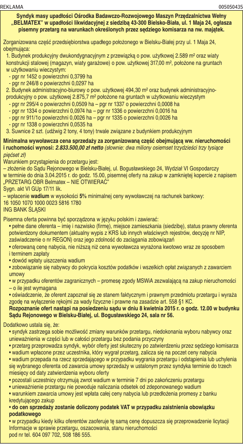 REKLAMA005050435 Syndyk masy upadłości Ośrodka Badawczo-Rozwojowego Maszyn Przędzalnictwa Wełny „BELMATEX” w upadłości likwidacyjnej z siedzibą 43-300 Bielsko-Biała, ul. 1 Maja 24, ogłasza pisemny przetarg na warunkach określonych przez sędziego komisarza na nw. majątek. Zorganizowana część przedsiębiorstwa upadłego położonego w Bielsku-Białej przy ul. 1 Maja 24, obejmująca: 1. Budynek produkcyjny dwukondygnacyjnym z przewiązką o pow. użytkowej 2.589 m² oraz wiaty konstrukcji stalowej (magazyn, wiaty garażowe) o pow. użytkowej 317,00 m², położone na gruntach w użytkowaniu wieczystym: - pgr nr 1452 o powierzchni 0,3799 ha - pgr nr 246/8 o powierzchni 0,0297 ha 2. Budynek administracyjno-biurowy o pow. użytkowej 494,30 m² oraz budynek administracyjnoprodukcyjny o pow. użytkowej 2.875,7 m² położone na gruntach w użytkowaniu wieczystym - pgr nr 295/4 o powierzchni 0,0509 ha – pgr nr 1337 o powierzchni 0,0008 ha - pgr nr 1334 o powierzchni 0,0974 ha – pgr nr 1336 o powierzchni 0,0016 ha - pgr nr 911/1o powierzchni 0,0026 ha – pgr nr 1335 o powierzchni 0,0026 ha - pgr nr 1338 o powierzchni 0,0535 ha 3. Suwnice 2 szt. (udźwig 2 tony, 4 tony) trwale związane z budynkiem produkcyjnym Minimalna wywoławcza cena sprzedaży za zorganizowaną część obejmującą ww. nieruchomości i ruchomości wynosi: 2.833.500,00 zł netto (słownie: dwa miliony osiemset trzydzieści trzy tysiące pięćset zł) Warunkiem przystąpienia do przetargu jest: – złożenie do Sądu Rejonowego w Bielsku-Białej, ul. Bogusławskiego 24, Wydział VI Gospodarczy w terminie do dnia 3.04.2015 r. do godz. 15.00, pisemnej oferty na zakup w zamkniętej kopercie z napisem „PRZETARG OBR Belmatex – NIE OTWIERAĆ” Sygn. akt VI GUp 17/11 lik. – wpłacenie wadium w wysokości 5% minimalnej ceny wywoławczej na rachunek bankowy: 16 1050 1070 1000 0023 5816 1780 ING BANK ŚLĄSKI Pisemna oferta powinna być sporządzona w języku polskim i zawierać: • pełne dane oferenta – imię i nazwisko (firmę), miejsce zamieszkania (siedzibę), status prawny oferenta potwierdzony dokumentem (aktualny wypis z KRS lub innych właściwych rejestrów, decyzję nr NIP, zaświadczenie o nr REGON) oraz jego zdolność do zaciągania zobowiązań • oferowaną cenę nabycia, nie niższą niż cena wywoławcza wyrażona kwotowo wraz ze sposobem i terminem zapłaty • dowód wpłaty uiszczenia wadium • zobowiązanie się nabywcy do pokrycia kosztów podatków i wszelkich opłat związanych z zawarciem umowy • w przypadku oferentów zagranicznych – promesę zgody MSWiA zezwalającą na zakup nieruchomości – o ile jest wymagana • oświadczenie, że oferent zapoznał się ze stanem faktycznym i prawnym przedmiotu przetargu i wyraża zgodę na wyłączenie rękojmi za wady fizyczne i prawne na zasadzie art. 558 §1 KC. Rozpoznanie ofert nastąpi na posiedzeniu sądu w dniu 8 kwietnia 2015 r. o godz. 12.00 w budynku Sądu Rejonowego w Bielsku-Białej, ul. Bogusławskiego 24, sala nr 56. Dodatkowo ustala się, że: • syndyk zastrzega sobie możliwość zmiany warunków przetargu, niedokonania wyboru nabywcy oraz unieważnienia w części lub w całości przetargu bez podania przyczyny • przetarg przeprowadza syndyk, wybór oferty jest skuteczny po zatwierdzeniu przez sędziego komisarza • wadium wpłacone przez uczestnika, który wygrał przetarg, zalicza się na poczet ceny nabycia • wadium przepada na rzecz sprzedającego w przypadku wygrania przetargu i odstąpienia lub uchylenia się wybranego oferenta od zawarcia umowy sprzedaży w ustalonym przez syndyka terminie do trzech miesięcy od daty zatwierdzenia wyboru oferty • pozostali uczestnicy otrzymują zwrot wadium w terminie 7 dni po zakończeniu przetargu • unieważnienie przetargu nie powoduje naliczania odsetek od zdeponowanego wadium • warunkiem zawarcia umowy jest wpłata całej ceny nabycia lub przedłożenia promesy z banku kredytującego zakup • do cen sprzedaży zostanie doliczony podatek VAT w przypadku zaistnienia obowiązku podatkowego • w przypadku kiedy kilku oferentów zaoferuje tę samą cenę dopuszcza się przeprowadzenie licytacji Informacje w sprawie przetargu, oszacowania, stanu nieruchomości pod nr tel. 604 097 702, 508 186 555.