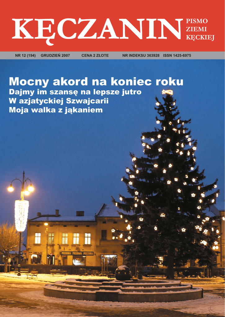 K ĘCZA NIN NR 12 (194) GRUDZIEŃ 2007 CENA 2 ZŁOTE PISMO ZIEMI KĘCKIEJ NR INDEKSU 363928 ISSN 1425-6975 Mocny akord na koniec roku Dajmy im szansę na lepsze jutro W azjatyckiej Szwajcarii Moja walka z jąkaniem REKLAMA POLECAMY CZYTAJ W KĘCZANINIE FELIETON NA RYBKĘ Początek zwycięstwa Mocny akord na koniec roku - str. 4 Nie wiem dużo o związkach etymologicznych między wyrazami, ale podskórnie czuję, że wyraz święto musi być logicznie powiązany z wyrazem światło. Przynajmniej, jeśli chodzi o język polski. Giętkość polszczyzny uwypukla niemal źródło świątecznej radości. Jest zatem radość ze światła. Światło pozwala bowiem widzieć. Jest warunkiem wszelkiego postrzegania. Gdyby nie było światła, nic byśmy nie widzieli. Gdyby jeszcze do tego wszystkiego, do tego melanżu asocjacji, dodać Boże Narodzenie, stanie się dla nas rzeczą jasną, że nie tylko o fizyczne światło tu chodzi. Światło, co rozjaśnia noc betlejemską jest w stanie rozjaśnić mroki duszy każdego człowieka – oto najgłębszy sens tych świąt. Bez takiej wiary zapamiętamy tylko to, co widzimy: karpia na stole i twarze drogich nam osób, prezenty i odświętne ubiory. Jakże to mało w porównaniu z propozycją, która pada za każdym razem, co roku! Ileż w niej nadziei – bez względu na widzialny śnieg, odczuwalny mróz, bez względu na żywą czy sztuczną choinkę i zasobność portfela, bez względu na chorobę i zdrowie. „Ujrzeć światło świata” to urodzić się wraz Tym, który ponad 2 tysiące lat temu jeszcze raz przypomniał, tak jak na początku dzieła stworzenia, że światłość jest dobra. „Wznieś ponad nami światłość swojego oblicza” – mówił psalmista czekając na przyjście Mesjasza. Myślę o tych zdaniach i przywileju, o łasce, która spotyka nas nieodmiennie i na wyciągnięcie ręki. Wieści ratuszowe – str. 6-10 Ilustrowana książka kucharska– str. 12 50 lat minęło… O jubileuszu 50-lecia KGW w Malcu – str. 13 Moja walka z jąkaniem – str. 14 Dajmy im szansę na lepsze jutro - str. 15 W azjatyckiej Szwajcarii. Relacja Agnieszki Matusiak z podróży do Kirgistanu – str. 16-17 REKLAMA MASAŻE Leczniczy, odchudzający z elementami odnowy biologicznej, relaksacyjny, masaż bańką chińską, ćwiczenia. Zabiegi w domu klienta, TANIO!!! Zabiegi wykonuje dyplomowany fizjoterapeuta, instruktor rekreacji ruchowej, JOANNA SKRZYPASZEK Spojrzeć na światłość prawdziwą, zobaczyć od nowa całe swoje życie w świetle tamtej nocy – to paradoks, ale nie pusta metafora. Noc jest potrzebna, by zdać sobie sprawę, że w rzeczywistości zależymy od światła, noc jest potrzebna po to, by od tej pory nie chcieć w niej już być. Wiedział o tym stary Symeon, który zobaczył w Jezusie Boga, ale zobaczył tę światłość również Paweł w drodze do Damaszku. Oświecenie, o jakie tu chodzi, nie jest wymysłem krwawej rewolucji, marksistowskich reform czy bełkotu spod znaku New Age. Oświecenie to przychodzi najprościej i najłagodniej, bez rozgłosu i bez fanfar. Przychodzi jednak nieodwracalnie. Dobrze być w takiej chwili uważnym i trzeźwym, by je spostrzec. Taki jest zatem sens czuwania, sens nocnej katolickiej pasterki, czy ewangelickiej jutrzni. Bóg przychodzi jak słowo, bo jest Słowem, które spływa i przemienia. To dostępna i namacalna metafizyka. Boże Narodzenie to początek zwycięstwa, które dopełni się w poranek wielkanocny. Życzę sobie i wam, byśmy mogli w to wierzyć nie tylko do końca tego święta, lecz do końca naszych dni. Kiedy życia nasze jak owoce spadną w mroki śmierci, łatwo będzie rozproszyć ciemności, pod warunkiem że zapamiętamy, jak smakuje światło. Takiego duchowego apetytu Wam życzę. KRAPP tel. 0503 118 007 KĘCZANIN – PISMO ZIEMI KĘCKIEJ Wydawca: Dom Kultury w Kętach; p.o. redaktora nacz.: Katarzyna Kopaczewska; adres redakcji: 32-650 Kęty, ul. Żwirki i Wigury 2, tel. 033 844 86 70; dyżury redakcji: w każdy poniedziałek miesiąca w godz. 16-17 w Domu Kultury (pawilon) w Kętach; tel. 033 844 86 84, UWAGA: dyżur 24.12.2007 przeniesiony na 27.12.2007 Ogłoszenia i reklamy przyjmowane są w Domu Kultury w pok. 105 codziennie w godz. 8-15. Za treść ogłoszeń, reklam i listów redakcja nie odpowiada. Materiałów niezamówionych redakcja nie zwraca. Redakcja zastrzega sobie prawo do dokonywania zmian i skracania tekstów. Redakcja nie utożsamia się z treścią publikowanych artykułów ani nie bierze na siebie odpowiedzialności za jakość przekazywanych do druku materiałów fotograficznych. Nakład: 1200 egz. Skład: Katarzyna Kopaczewska Korekta: Marzena Kiryjczuk Kęczanin grudzień 2007 Porąbka, ul. Chmielna 5, tel. 033 810 60 38, e-mail: [email protected] ZDJĘCIE NA OKŁADCE: Kęcki Rynek. FOT. UG KĘTY 3 TEMAT MIESIĄCA Mocny akord na koniec roku Ostatnie tygodnie 2007 roku to pasmo sukcesów młodych muzyków z Kęt, czyli Kasi i Konrada Mertów oraz Kuby Wróbla. Zresztą to, czego dokonali oni w ciągu ostatniego roku, warte jest odnotowania w kronikach. Przypomnijmy, w kwietniu 2007 roku Kasia otrzymuje wyróżnienie podczas III Ogólnopolskiego Forum Młodych Instrumentalistów w Rybniku. Tydzień później Konrad zdobywa I nagrodę na XII Gorlickich Konfrontacjach Akordeonowych. Tuż przed wakacjami, w czerwcu, Kasia otrzymuje kolejne wyróżnienie, tym razem na I Chrzanowskich Spotkaniach Młodych Instrumentalistów. W lipcu następna nagroda dla Kasi za siłę przekazu, głosu i osobowości na XVI Międzynarodowych Spotkaniach Rodzin Muzykujących w Dobrym Mieście, a czteroletni Marcinek Wróbel podbija serca dobromiejskiej publiczności. Lato i wczesna jesień to charytatywne koncerty zespołu „Familia Band”, który wspólnie tworzą, m.in. w Gminnej Bibliotece podczas rozdania nagród konkursu literackiego „Ambrożjada”, w widowisku poetycko-muzycznym „Dziękujemy Ci Ojcze, że byłeś” - klasztor oo. franciszkanów, 