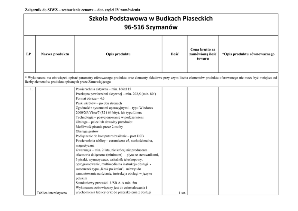 Załącznik do SIWZ – zestawienie cenowe – dot. części IV zamówienia Szkoła Podstawowa w Budkach Piaseckich 96-516 Szymanów LP Nazwa produktu Opis produktu Cena brutto za zamówioną ilość towaru Ilość *Opis produktu równowaŜnego * Wykonawca ma obowiązek opisać parametry oferowanego produktu oraz elementy składowe przy czym liczba elementów produktu oferowanego nie moŜe być mniejsza od liczby elementów produktu opisanych przez Zamawiającego 1. Tablica interaktywna Powierzchnia aktywna – min. 166x115 Przekątna powierzchni aktywnej – min. 202,5 (min. 80’) Format obrazu – 4:3 Paski skrótów – po obu stronach Zgodność z systemami operacyjnymi – typu Windows 2000/XP/Vista/7 (32 i 64 bity). lub typu Linux Technologia – pozycjonowanie w podczerwieni Obsługa – palec lub dowolny przedmiot MoŜliwość pisania przez 2 osoby Obsługa gestów Podłączenie do komputera/zasilanie – port USB Powierzchnia tablicy – ceramiczna e3, suchościeralna, magnetyczna Gwarancja – min. 2 lata, nie krócej niŜ producenta Akcesoria dołączone (minimum) – płyta ze sterownikami, 3 pisaki, wymazywacz, wskaźnik teleskopowy, oprogramowanie, multimedialna instrukcja obsługi samouczek typu „Krok po kroku”, uchwyt do zamontowania na ścianie, instrukcja obsługi w języku polskim Standardowy przewód –USB A-A min. 5m Wykonawca zobowiązany jest do zainstalowania i uruchomienia tablicy oraz do przeszkolenia z obsługi 1 szt. urządzenia co najmniej jednego pracownika 2. Program komputerowy typu Eduterapeutica program edukacyjny dysleksja Program dydaktyczna do pracy z uczniami, wykazującymi trudności w czytaniu i pisaniu z powodu dyslekcji, przeznaczony na minimum 10 stanowisk. Program winien zawierać co najmniej: 1. aplikację nauczyciela, ułatwiającą przeprowadzenie terapii, zaplanowanie jej, zarejestrowanie danych, kontrolę i analizę efektów; 2. program do diagnozy, obejmujący min. cztery kategorie poznawcze, tj. funkcje językowe ( automatyzacja języka, rozumienie tekstu, tworzenie rymów, sylabizowanie), funkcje wzrokowe (postrzeganie liter i sekwencji liter, a takŜe spostrzeganie róŜnic w obrazach), pamięć (pamięć wzrokowa, zapamiętywanie figur geometrycznych, zapamiętywanie słów, rozpoznawanie rytmów), myślenie (spostrzeganie stosunków przestrzennych, hamowanie wykonawcze, kategoryzowanie, myślenie logiczne) 3. program terapeutycznego, wykorzystujący metodę 18 struktur wyrazowych, która umoŜliwia pogłębienie umiejętności analizy i syntezy wyrazów. Terapia winna obejmować w szczególności następujące rodzaje ćwiczeń: 1. uzupełnianie wyrazów poprzez dopisywanie liter i sylab 2. sylabizowanie 3. oddzielanie słów od siebie 4. budowanie zdań 5. ćwiczenia z pamięci i ze słuchu 6. ćwiczenia grafomotoryczne Program winien zawierać co najmniej: min. 300 ćwiczeń interaktywnych i min. 120 kart pracy do wydruku. Program winien działać na platformach typu: MS Windows XP/Vista/7 oraz MacOS od wersji 10.5 w górę 1 szt. Pomoc dydaktyczna dla dzieci z trudnościami w czytaniu i pisaniu, w tym zagroŜonych ryzykiem dysleksji. Produkt winien rozwijać następujące cechy: 1. rozumienie mowy, 2. wzbogacanie słownictwa, 3. orientację przestrzenną, 4. koordynację wzrokowo - ruchową, 5. umiejętność słuchania i spostrzegania, 6. umiejętność kreślenia liter drukowanych i pisanych w odpowiednim kierunku, 7. umiejętność kreślenia dwuznaków drukowanych i pisanych w odpowiednim kierunku, 8. umiejętność analizy słów zawierających litery. Produkt winien zawierać co najmniej nw. elementy: min. 44 karty dwustronne, format min. A4 – do demonstrowania liter, z obrazkami i podpisami. KaŜda karta winna zawierać z jednej strony literę drukowaną i pisaną, nazwę rzeczy znajdującej się na ilustracji, która winna rozpoczynać się na demonstrowane litery. Druga strona karty winna posiadać jedynie zapis litery (bez obrazka), co da moŜliwość zaadoptowania karty przez ucznia. 3. 4. Pomoc dydaktyczna typu Alfabet z obrazkami 3 szt. Pomoc dydaktyczna wykorzystywana do zabawy i nauki w ruchu (poprzez tworzenie ruchomych wyrazów, działań, zbiorów, samogłosek, spółgłosek itp.) i do demonstrowania liter i cyfr. Produkt winien rozwijać następujące cechy: 1. rozumienie mowy, 2. tworzenie wyrazów, 3. rozpoznawanie samogłosek i spółgłosek, 4. tworzenie działań, 5. tworzenie zbiorów. Produkt winien zawierać co najmniej nw. elementy: co najmniej po 1 szt. literek alfabetu, cyfry od 1 do 9 (min. po jednej sztuce kaŜda, przy czym samogłoski winny być wykonane w jednakowym kolorze – w celu rozróŜnienia), znaki działań matematycznych (co najmniej po 1 znaku: dodawanie, mnoŜenie, iloczyn, iloraz), co najmniej 10 sztuk rękawic, do których, za pomocą rzepów mocowane Pomoc dydaktyczna typu będą literki i cyferki. Zamawiający dopuszcza inny sposób Literki i cyferki demonstrowania liter, np. inny sposób mocowania liter. 3 szt. 5. Pomoc dydaktyczna typu Klocki LOGO 6. Pomoc dydaktyczna typu instrukcja do klocków LOGO Pomoc dydaktyczna do nauki wymowy, czytania, pisania, ortografii i matematyki. Produkt winien rozwijać następujące cechy: 1. czytanie 2. znajomość liter z uwzględnieniem róŜnych krojów czcionki (duŜą i mała drukowana, duŜa i mała pisana) 3. łatwe przyswajanie praw fizycznych 4. znajomość i stosowanie znaków interpunkcyjnych 5. pisanie ortograficzne 6. liczenie 7. zapisywanie działań matematycznych Produkt winien zawierać co najmniej nw. elementy: min. 150 klocków o kształcie prostopadłościanów, z trwałego materiału z umieszczonym na nich pełnym zestawem min. 44 liter alfabetu (na kaŜdej z czterech ścian klocka inny krój czcionki), cyfr (od 0 do 9, min. po 1), znaków interpunkcyjnych i matematycznych. Szlaczek u dołu kaŜdego z czterech wariantów liter winien umoŜliwiać właściwe umieszczanie oraz postrzeganie liter. Zamawiający dopuszcz